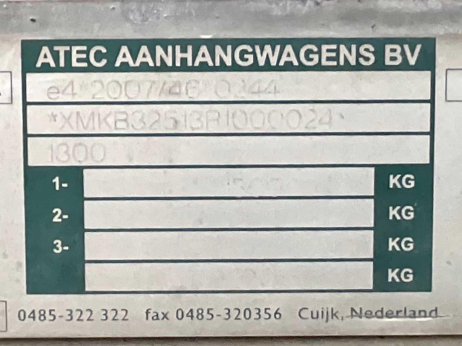 Lengte 4000 mm; breedte 1800 mm; hoogte 1800 mm; groenaanhanger; gegalvaniseerd staal frame; hout schotten; gegalvaniseerd draadstaal opbouw; draadstaal frame achterzijde ontbreekt; neuswiel; oplooprem; (de koper dient bij transport over de weg zelf te voorzien in een geldig kenteken; een 7 of 9 polige aansluitstekker of verloopstuk met kabel (verlengsnoer kan ter plaatse tegen betaling aangekocht worden); eventueel extra lichtbalk; Nederlandse kentekenpapieren; zonder gelijkvormigheidsattest; Nee Merk: Atec Type: EB2 2-1 Bouwjaar: 2013 Chassisnummer: XMKB32513R1000024 Aantal assen: 1 Laadbak afmeting l: 250cm Laadbak afmeting b: 130cm Ledig gewicht: 320kg Laadvermogen: 980kg Datum eerste toelating: 2013-07-11 Datum eerste toelating (NL): 2013-07-11 Kenteken: 15-WK-FF