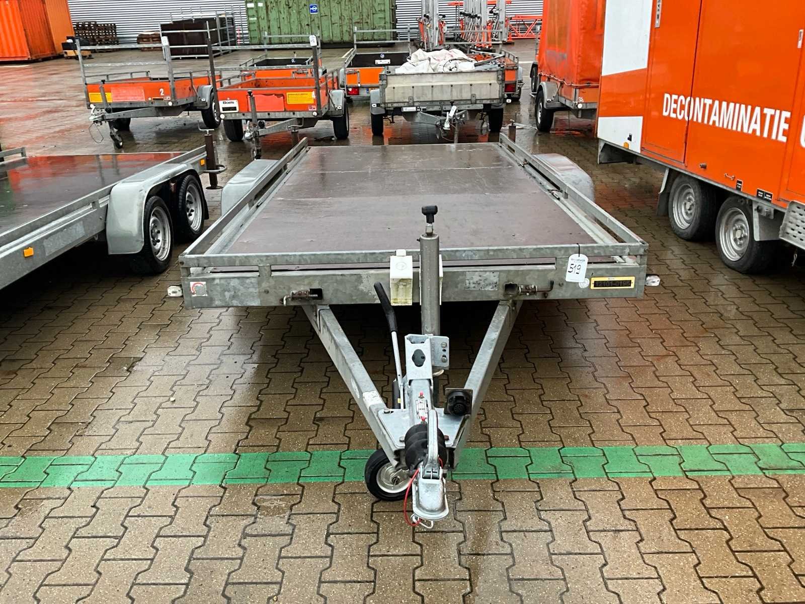 Lengte 5250 mm; breedte 2400 mm; hoogte 1050 mm; gegalvaniseerd staal frame; geremd; neuswiel; oprijplaten; bindogen; staalkabellier handbediend; (de koper dient bij transport over de weg zelf te voorzien in een geldig kenteken; een 7 of 9 polige aansluitstekker of verloopstuk met kabel (verlengsnoer kan ter plaatse tegen betaling aangekocht worden); eventueel extra lichtbalk; Duitse kentekenpapieren; gelijkvormigheidsattest; (VIE-YS159) Nee Merk: Atec Type: Autotransporter Bouwjaar: 2014 Chassisnummer: XPPAB270V13000583 Aantal assen: 2 Laadbak afmeting l: 400cm Laadbak afmeting b: 190cm Ledig gewicht: 580kg Laadvermogen: 1920kg