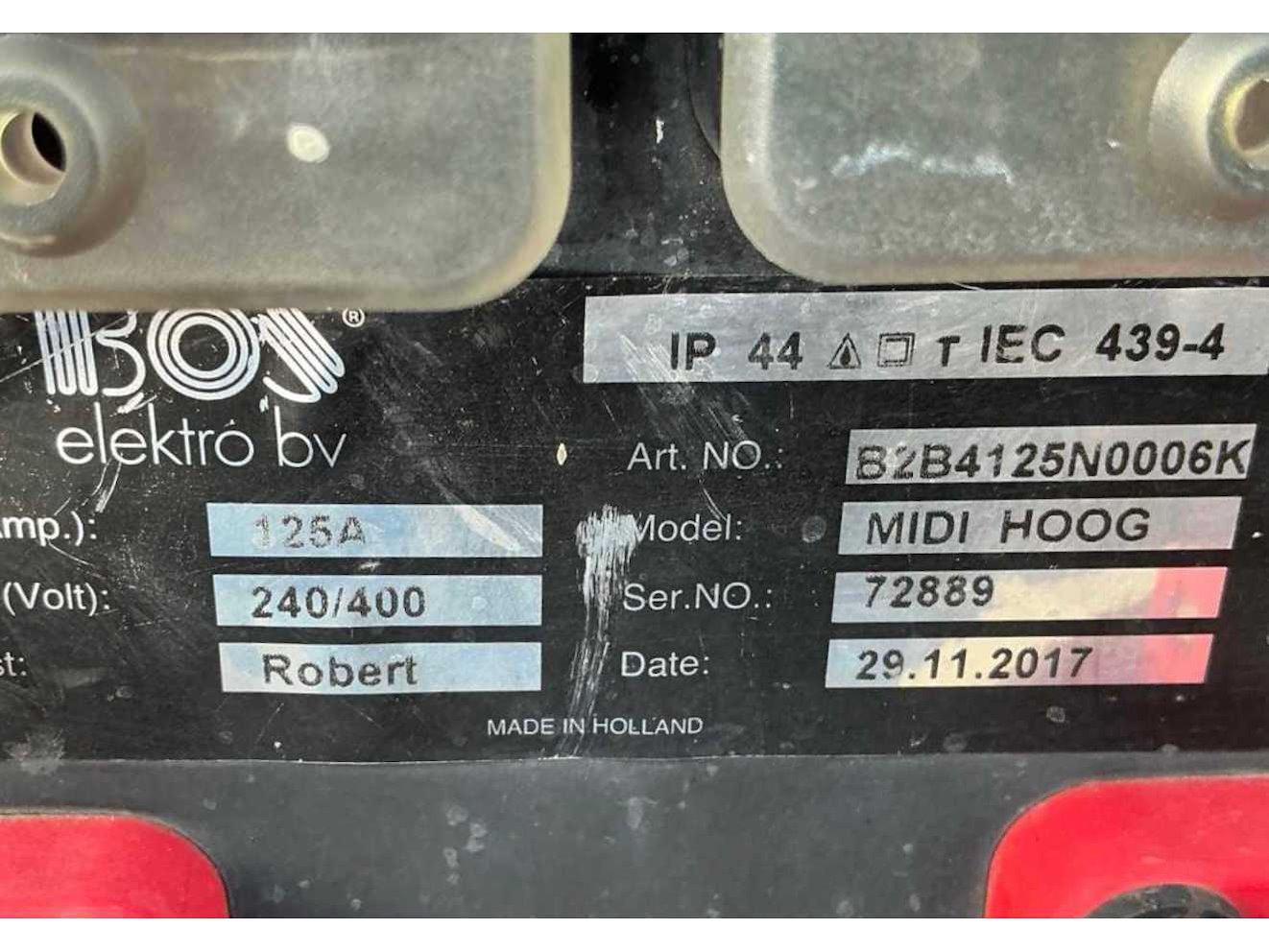 Volrubber behuizing; hoofdschakelaar; interne zekeringen; gegalvaniseerd staal onderstel; working condition not verified; Nee Merk: Bos Type: Midi Hoog Bouwjaar: 2017 Serienummer: 72889 Aansluiting: 125A Aantal uitgangen 230v: 6 Aantal uitgangen 380 v / 32 a: 4 Totale afmeting L: 600mm Totale afmeting Breedte: 600mm Totale afmeting Hoogte: 1150mm