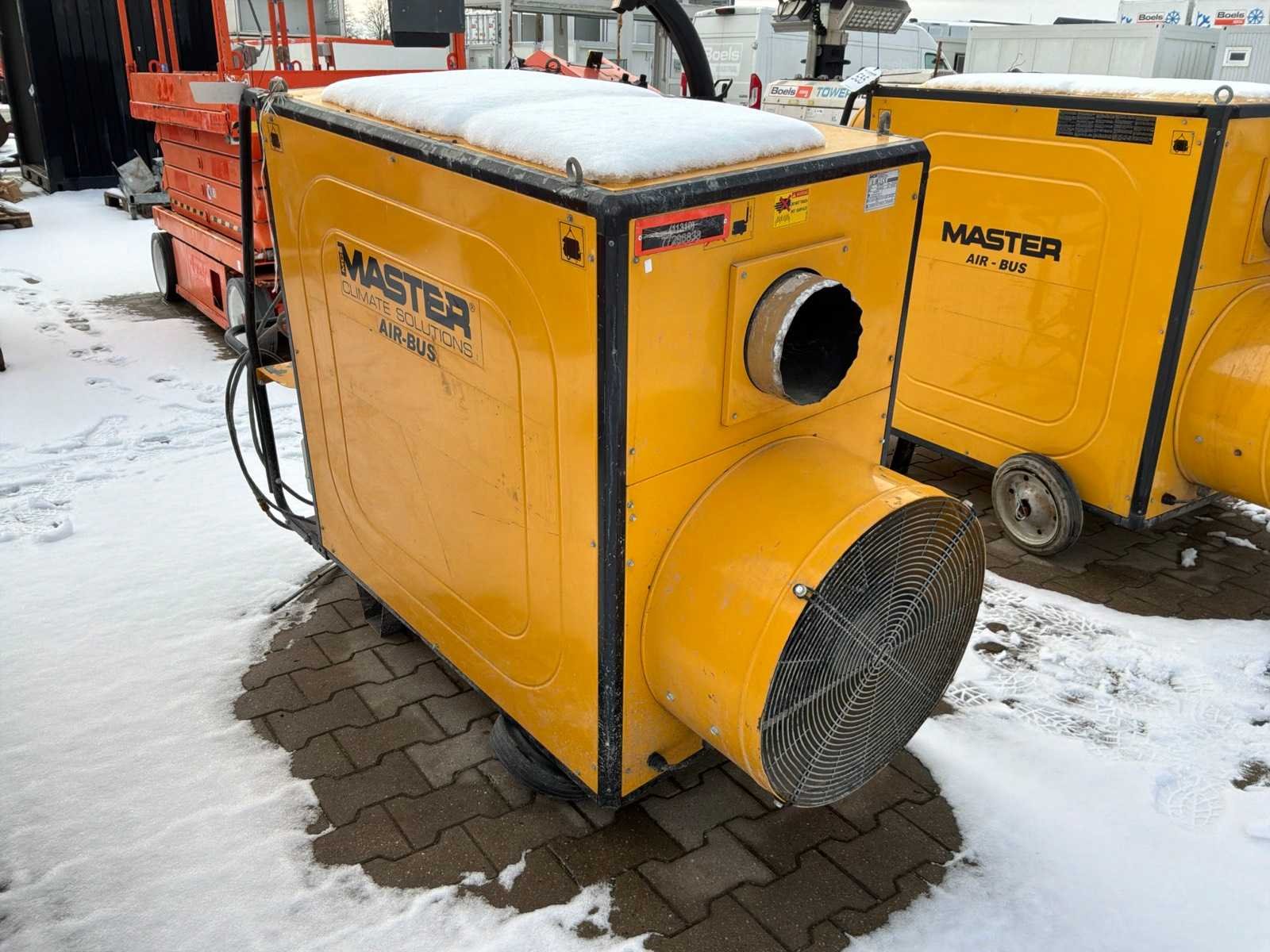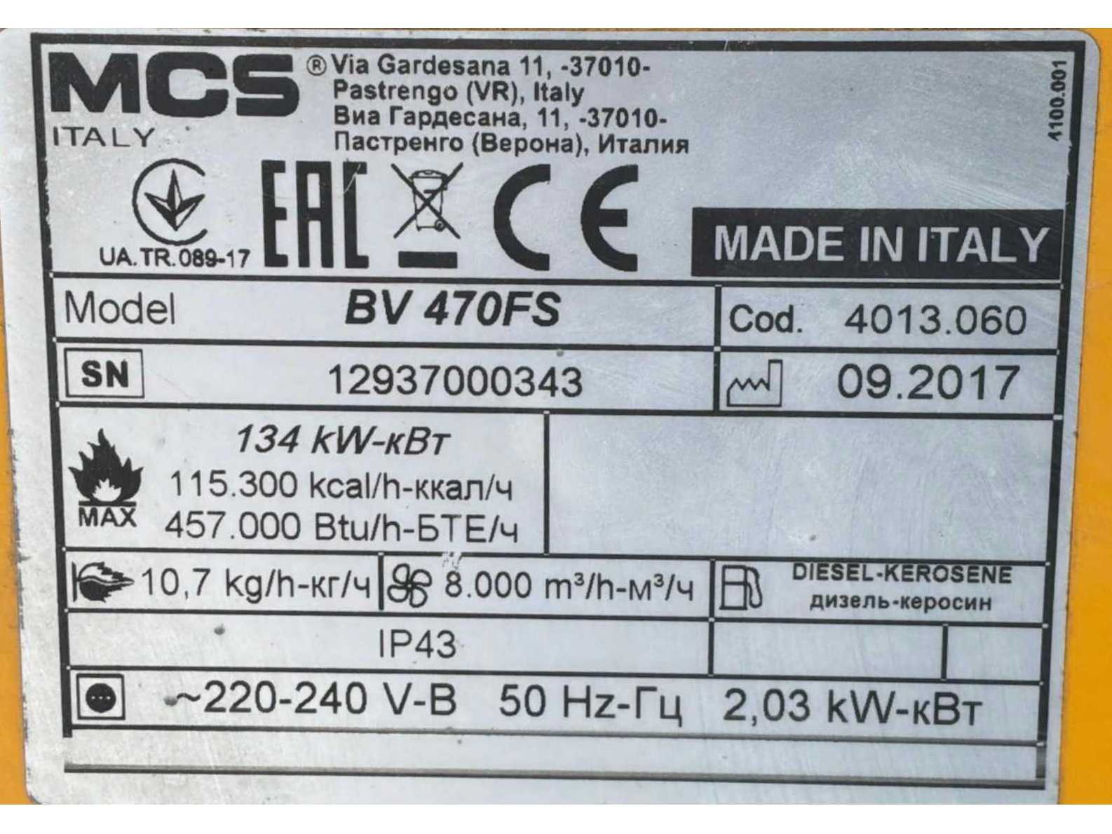 Verrijdbaar; diesel gestookt; brander Riello; volumestroom 8000 m3 / uur; 230 Volt; 8,8 Ampère; 2 kW; 4x luchtuitlaat diameter 270 mm; rookgasafvoer; brandstofleiding; 1x wiel verbogen; working condition not verified; Nee Merk: MCS Type: Master Air-Bus BV 470 FS Bouwjaar: 2017 Serienummer: 12937000343 Vermogen: 134kW Ventilator: true Totale afmeting L: 1700mm Totale afmeting Breedte: 900mm Totale afmeting Hoogte: 1650mm Aansluiting: 230V