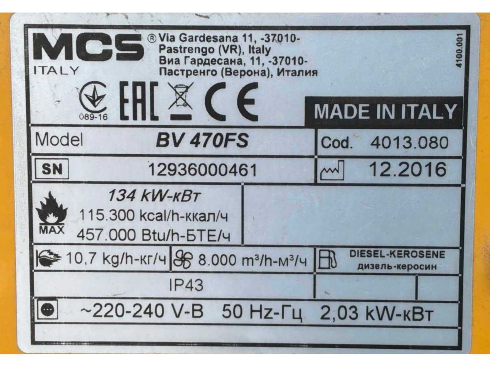 Verrijdbaar; diesel gestookt; brander Riello; volumestroom 8000 m3 / uur; 230 Volt; 8,8 Ampère; 2 kW; 4x luchtuitlaat diameter 270 mm; rookgasafvoer; brandstofleiding; working condition not verified; Nee Merk: MCS Type: Master Air-Bus BV 470 FS Bouwjaar: 2016 Serienummer: 12936000461 Vermogen: 134kW Ventilator: true Totale afmeting L: 1700mm Totale afmeting Breedte: 900mm Totale afmeting Hoogte: 1650mm