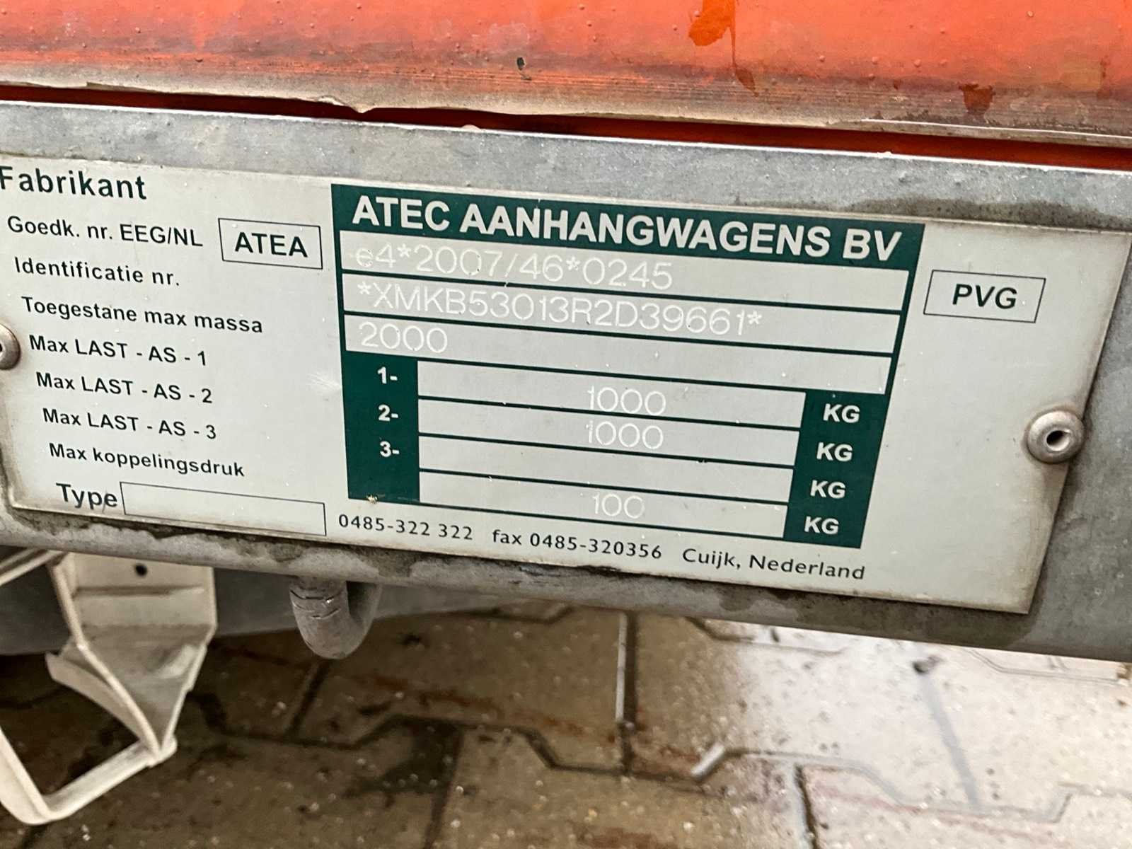 Lengte 4700 mm; breedte 1800 mm; hoogte 2100 mm; huif aanhangwagen; gegalvaniseerd staal frame; hout schotten; neuswiel; oplooprem; (de koper dient bij transport over de weg zelf te voorzien in een geldig kenteken; een 7 of 9 polige aansluitstekker of verloopstuk met kabel (verlengsnoer kan ter plaatse tegen betaling aangekocht worden); eventueel extra lichtbalk); Duitse kentekenpapieren; gelijkvormigheidsattest; (VIE-YK411) Nee Merk: Atec Type: EB2 2-1 Bouwjaar: 2013 Chassisnummer: XMKB53013R2D39661 Aantal assen: 2 Laadbak afmeting l: 300cm Laadbak afmeting b: 130cm Ledig gewicht: 540kg Laadvermogen: 1460kg Zeiltrailer: true