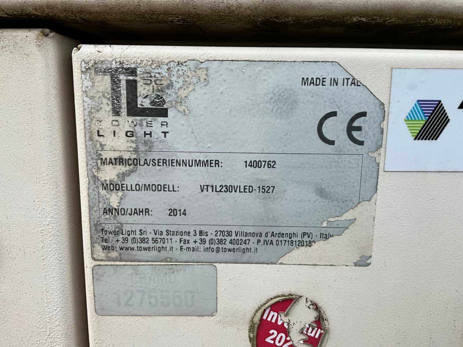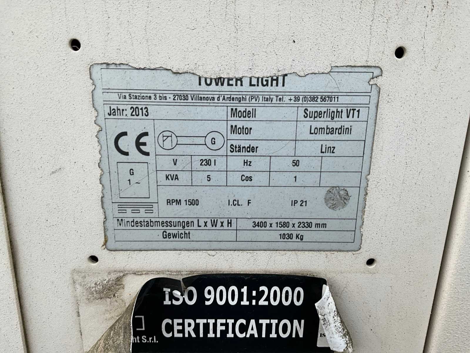 Lengte 3440 mm; breedte 1600 mm; hoogte 2400 mm; Kubota D1105 EU2 diesel motor; Linz alternator; afgelezen urenstand 1130; 4x1000 Watt Metal Halide lampen; maximale masthoogte 9 meter; lichtsensor; tijdschakelaar; 230 Volt aansluiting; aansluitbaar op netstroom; heftruck vorksleuven; 4x stabilisator stempels; ingebouwde brandstoftank; trekboom; neuswiel; not working condition; (de koper dient bij transport over de weg zelf te voorzien in een geldig kenteken; een 7 of 9 polige aansluitstekker of verloopstuk met kabel (verlengsnoer kan ter plaatse tegen betaling aangekocht worden); eventueel extra lichtbalk); Duitse kentekenpapieren; gelijkvormigheidsattest; (M-QT127) Nee Merk: Tower Light Type: SuperLight VT1 Bouwjaar: 2014 Chassisnummer: ZA9VT1A0014H77130 Aantal assen: 1 Ledig gewicht: 1115kg Gesloten opbouw: true