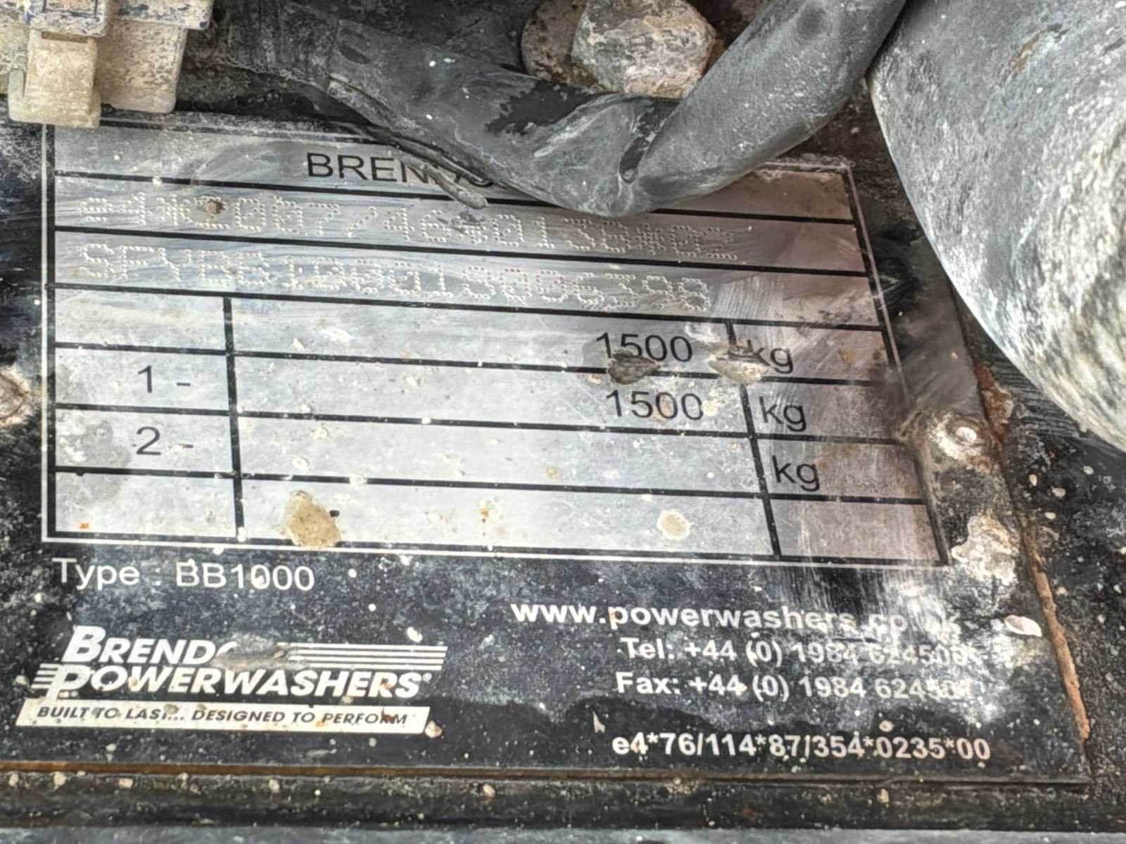 Lengte 3400 mm; breedte 1500 mm; hoogte 1250 mm; kunststof watertank; kunststof zeeptank; Honda benzine motor GX 390;pomp niet aanwezig;slanghaspel;working condition; (de koper dient bij transport over de weg zelf een 7 of 9 polige aansluitstekker of verloopstuk met kabel (verlengsnoer kan ter plaatse tegen betaling aangekocht worden); eventueel extra lichtbalk); ; zonder gelijkvormigheidsattest; lxl Nee Merk: Brendon Powerwashers Type: BBW1000 Bouwjaar: 2007 Chassisnummer: SFYBB100018006398 Aantal assen: 1 Ledig gewicht: 504kg Laadvermogen: 996kg Kenteken: 77-WT-DP Zelf rijdend exporteren: Niet mogelijk No self drive export!: true