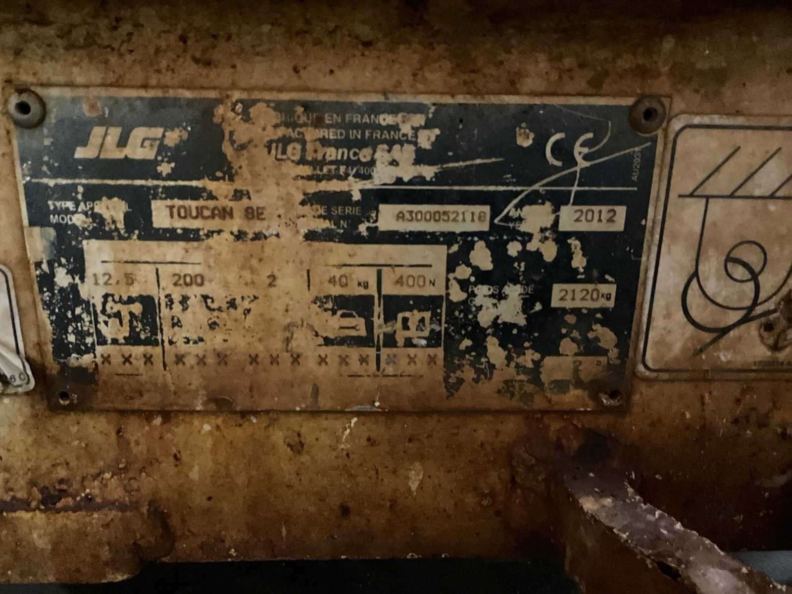 Platform vloerhoogte 6200 mm; kooibediening; 230 Volt stroom aansluiting platform; ingebouwde acculader; 24 Volt / 230 Volt; working condition Nee Merk: JLG Type: Toucan 8E Bouwjaar: 2012 Elektrisch: true Knikarm hoogwerker: true Masthoogwerker: true Werkhoogte: 8200mm Horizontale rijkwijdte: 2000mm Plateau afm. l: 900mm Plateau afm. b: 700mm Platform capaciteit: 200kg Afgelezen urenstand: 768 Eigen gewicht: 2120kg Totale afmeting L: 2100mm Totale afmeting Breedte: 1000mm Totale afmeting Hoogte: 2100mm