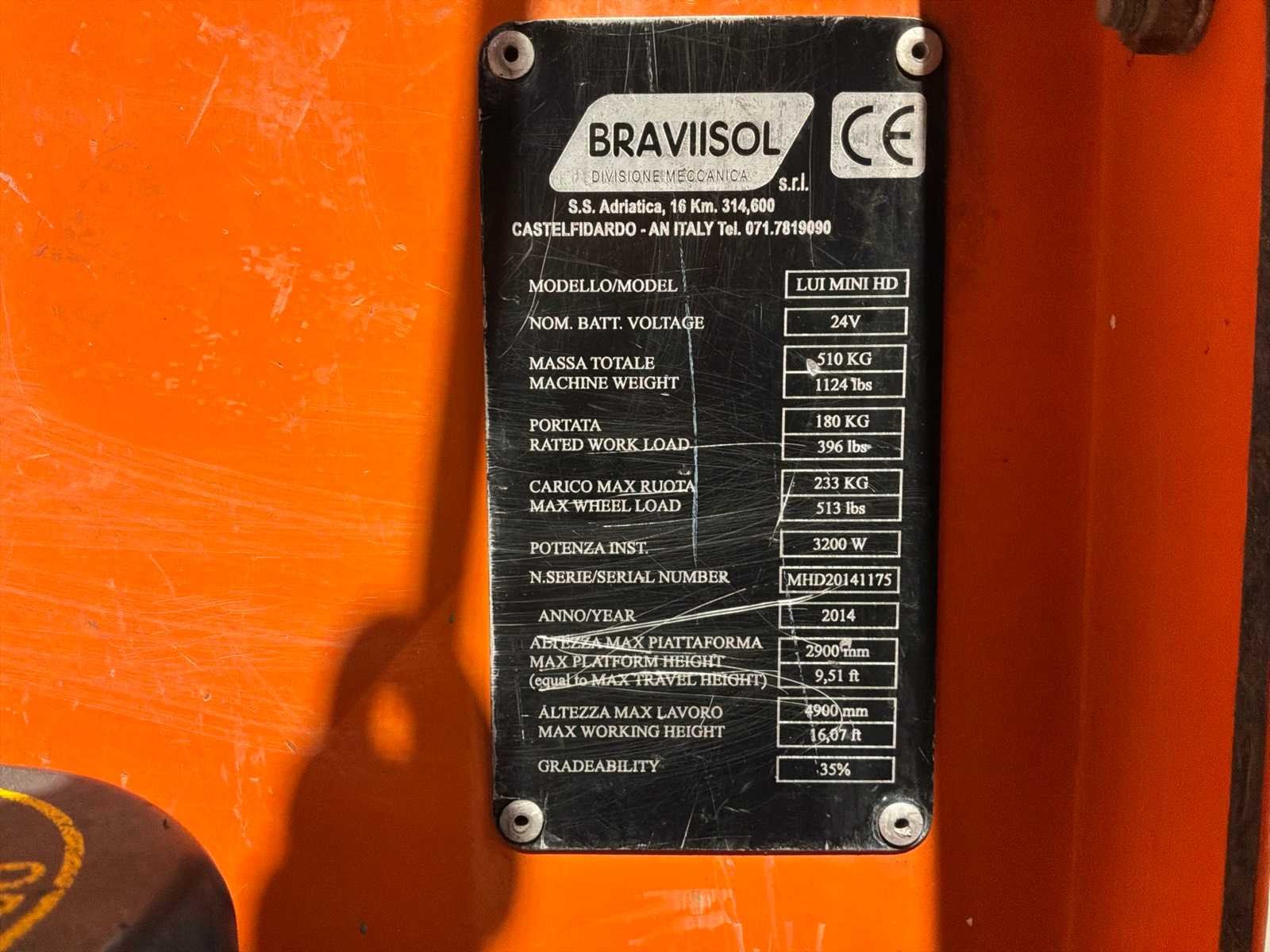 Staal; maximale platform vloerhoogte 2900 mm; kooibediening; uitschuifbaar plateau 1650x600 mm; ingebouwde acculader; 230 Volt; heftruck vorksleuven; working condition; Nee Merk: Braviisol Leonardo Type: LUI MINI HD Bouwjaar: 2014 Elektrisch: true Motorvermogen (kW): 3.2kW Masthoogwerker: true Werkhoogte: 4900mm Plateau afm. l: 1100mm Plateau afm. b: 600mm Platform capaciteit: 180kg Accu lader: true Afgelezen urenstand: 276 Eigen gewicht: 510kg Totale afmeting L: 1200mm Totale afmeting Breedte: 750mm Totale afmeting Hoogte: 1750mm