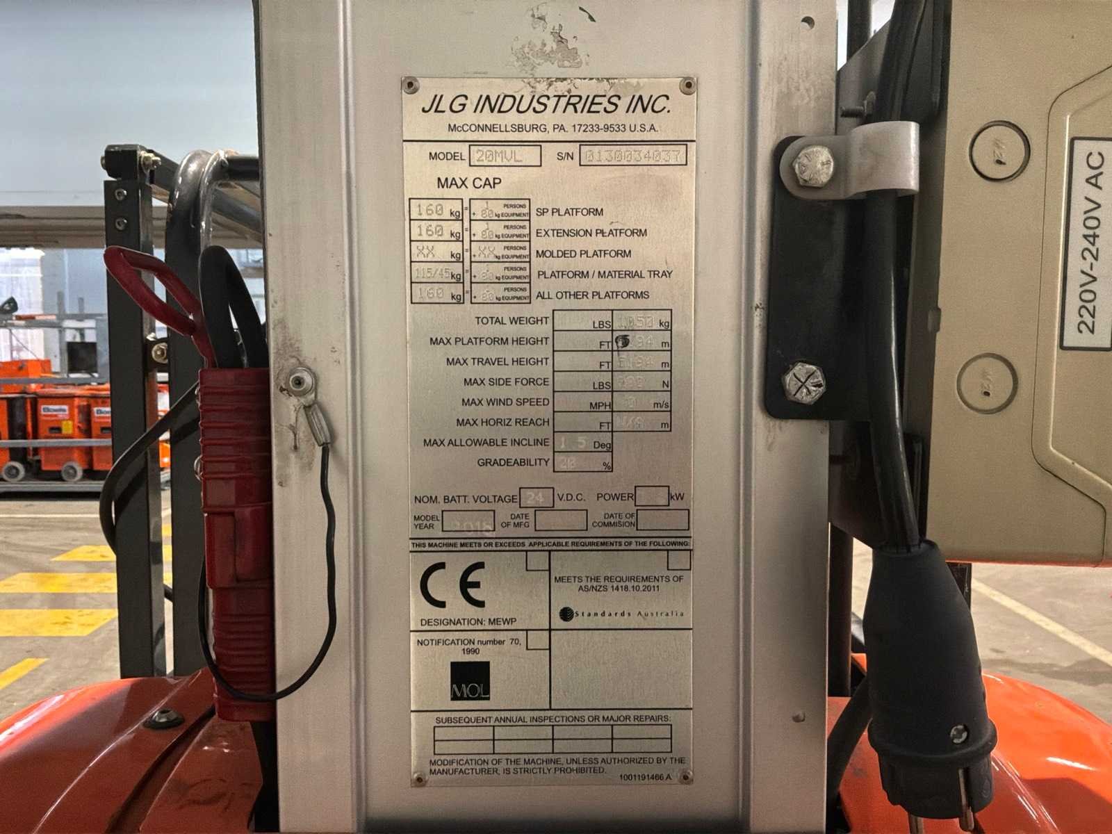 Verrijdbaar; staal / aluminium; maximum platform vloerhoogte 5940 mm; kooibediening; 230 Volt stroom aansluiting platform; uitschuifbaar plateau afmeting 1200x650 mm; ingebouwde acculader; 24 Volt; 230 Volt; working condition; Nee Merk: JLG Type: 20MVL Bouwjaar: 2018 Serienummer: 0130034037 Elektrisch: true Masthoogwerker: true Werkhoogte: 5940mm Plateau afm. l: 650mm Plateau afm. b: 650mm Platform capaciteit: 160kg Accu lader: true Afgelezen urenstand: 195.9 Eigen gewicht: 1050kg Totale afmeting L: 1050mm Totale afmeting Breedte: 800mm Totale afmeting Hoogte: 2050mm