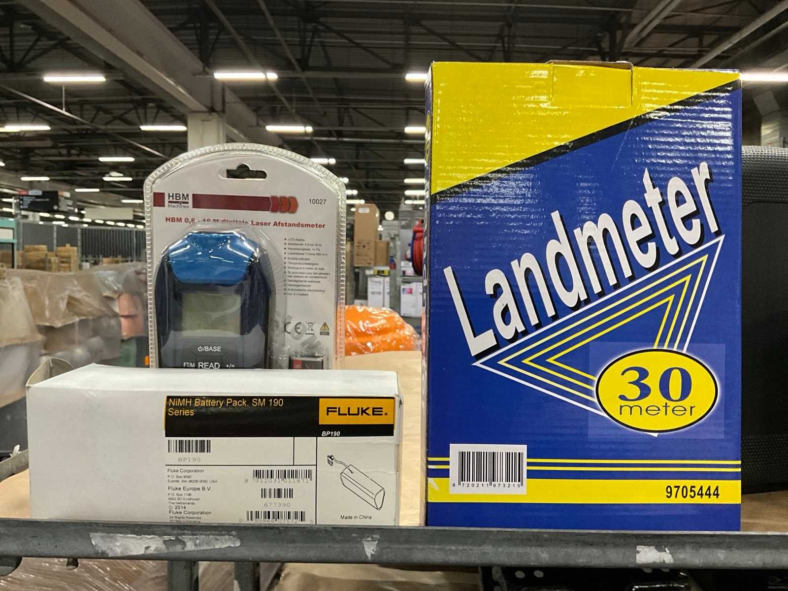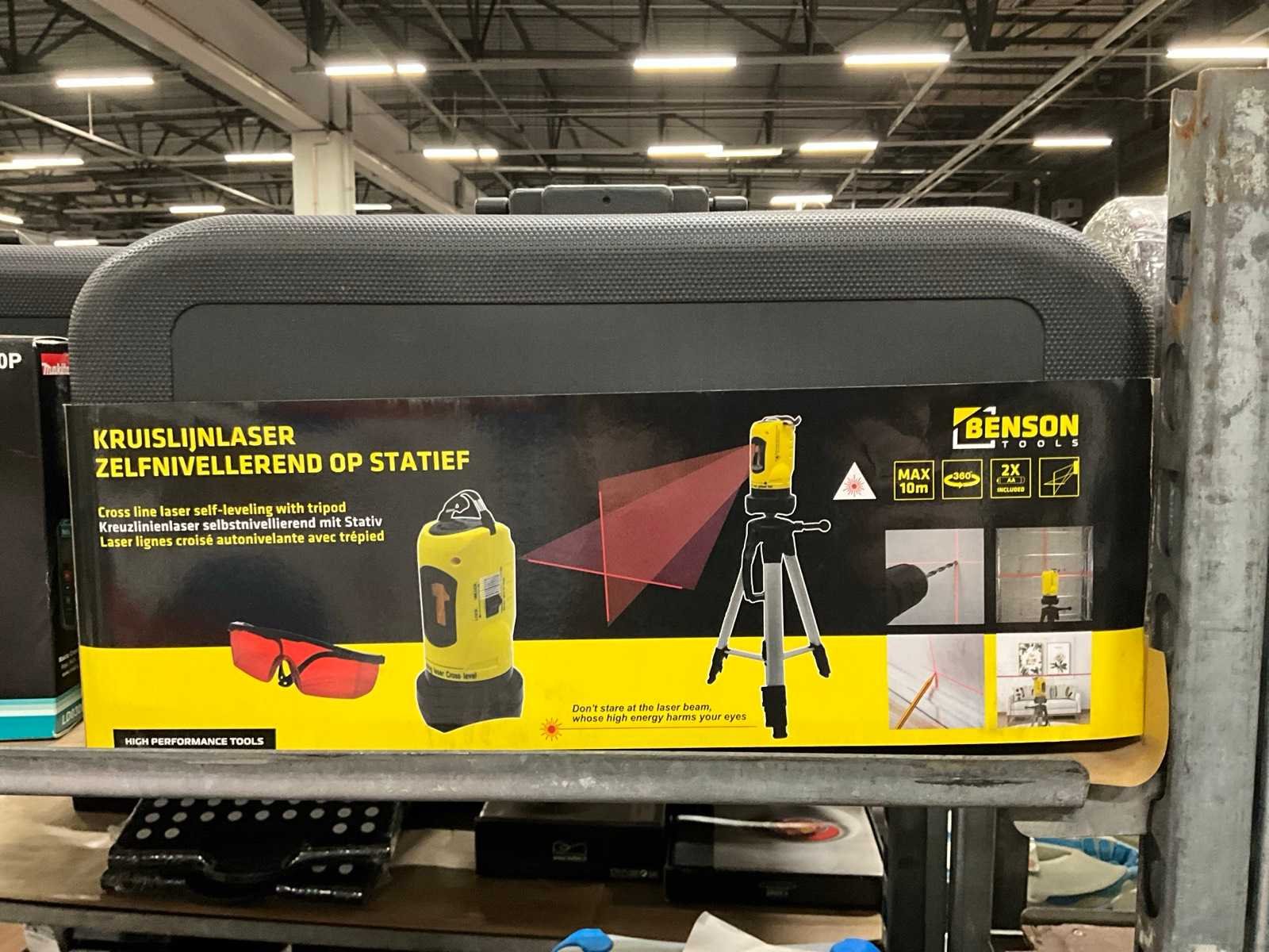 Bestaande uit: 2x Benson kruislijnlaser zelfnivellerend op statief, Makita LD030P afstandsmeter, 30 meter landmeter, HBM 10027 digitale laser afstandsmeter Nee