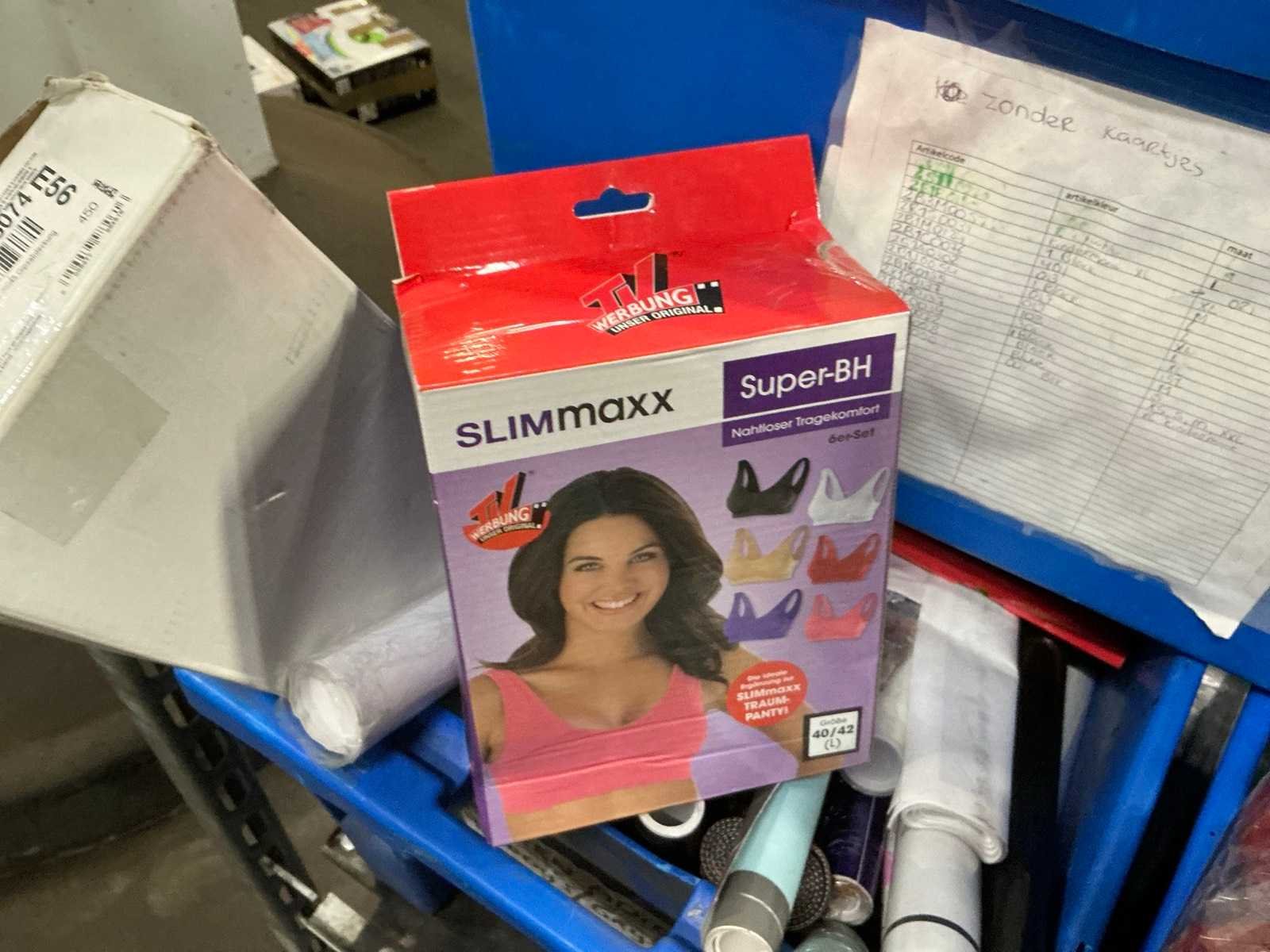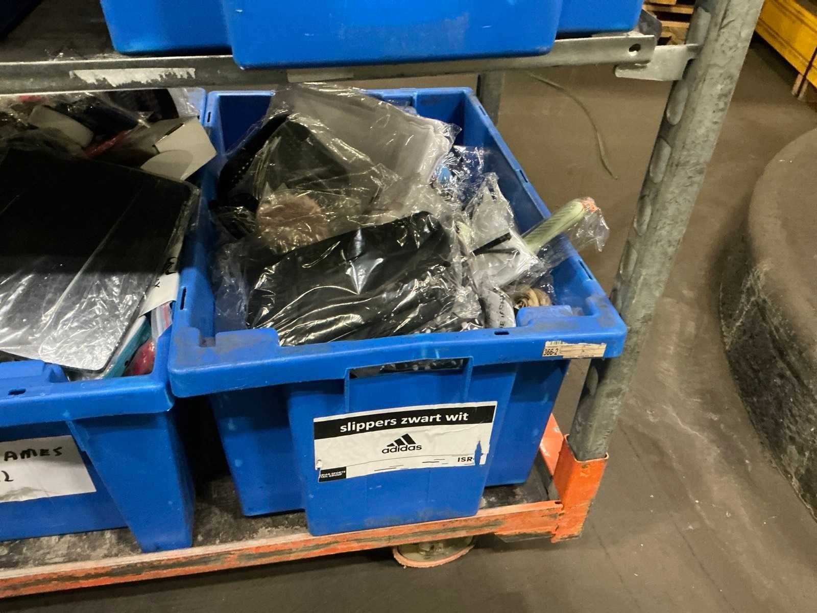 Verschillende soorten en maten in en met 8 stapelkratten. Zonder Deense kar. Bestaande uit onder andere pc kabels, slippers, decoratie materiaal, Durex condooms. Nee