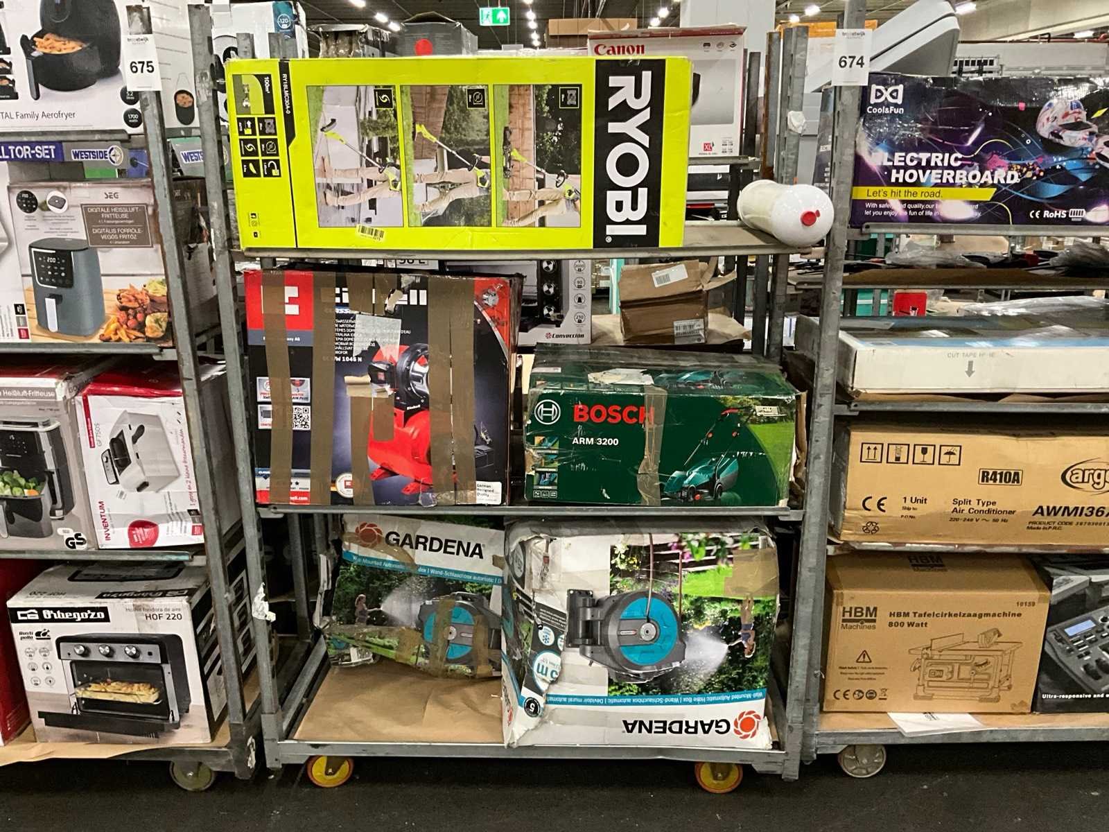 Waaronder: Ryobi bosmaaier, Einhell hydrofoorpomp, Bosch grasmaaier, Gardena slanghaspel, etc; Deense kar niet inbegrepen Nee