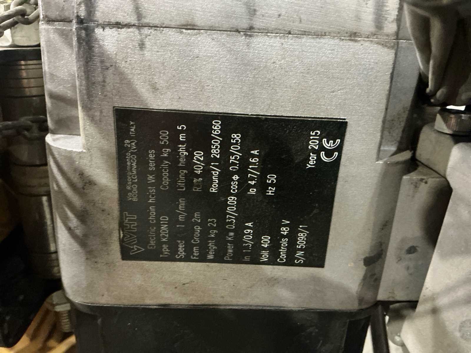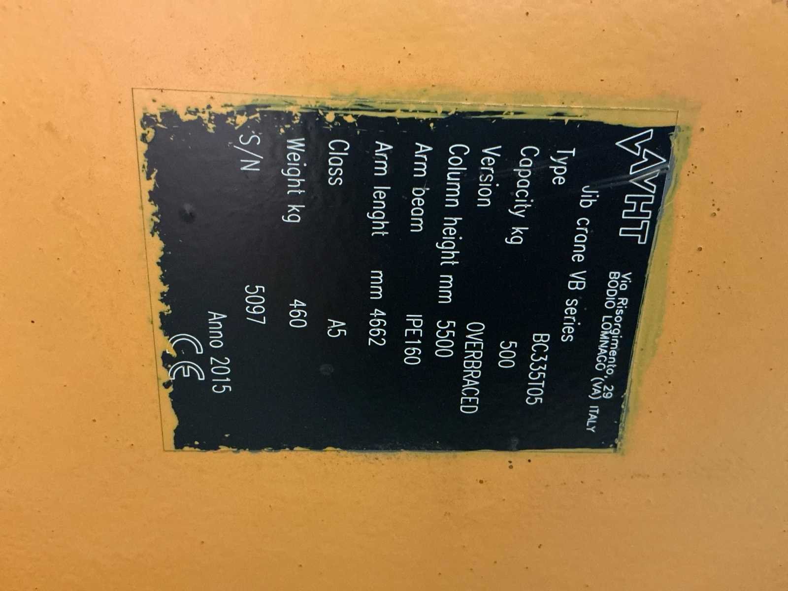 Merk kraan: VHT Type: Jib crane VB series Model: BC335T05 Capaciteit: 500 kg Arm lengte: 4662 mm Kolomhoogte: 5500 mm Versie: Overbraced Armprofiel: IPE160 Bouwjaar kraan: 2015 Merk takel: VHT Type: K2DN1D – VK series Capaciteit: 500 kg Hefsnelheid: 1 m/min Hijsbereik: 5 m Voeding: 400 V – 50 Hz Stuurspanning: 48 V Vermogen motor: 0.37 / 0.09 kW Stroom: In 1,3 / 0,9 A Takelgewicht: 23 kg (vermeld op plaat) FEM-classificatie: Groep 2m Bouwjaar takel: 2015 Serie-/identificatienummer takel: 5098/1 Nee Merk: VHT Type: BC335T05 Bouwjaar: 2015 Serienummer: 5097 Hijsvermogen: 500kg Armlengte: 4662mm Eigen gewicht: 460kg Totale afmeting L: 5250mm Totale afmeting Breedte: 560mm Totale afmeting Hoogte: 5550mm