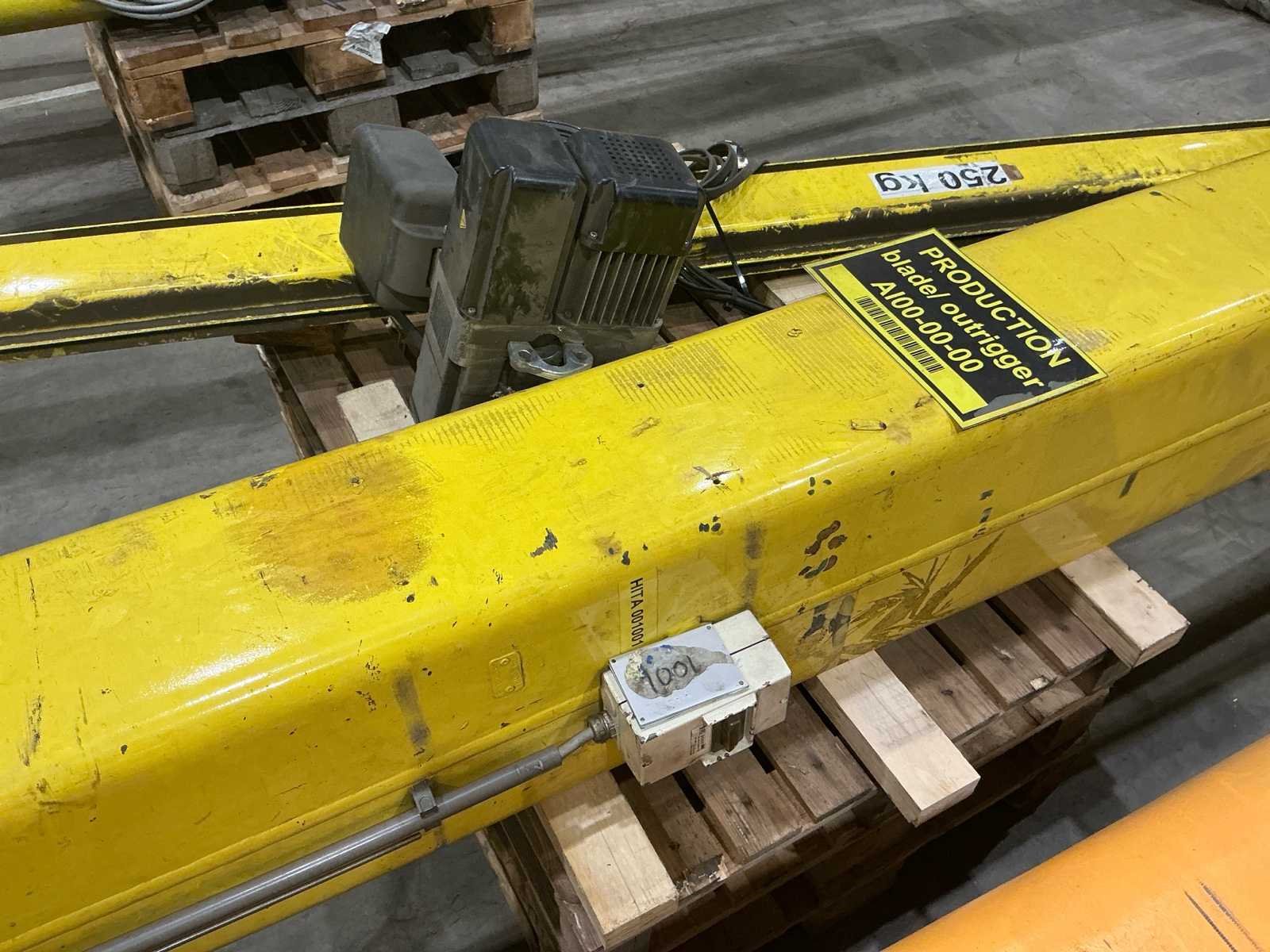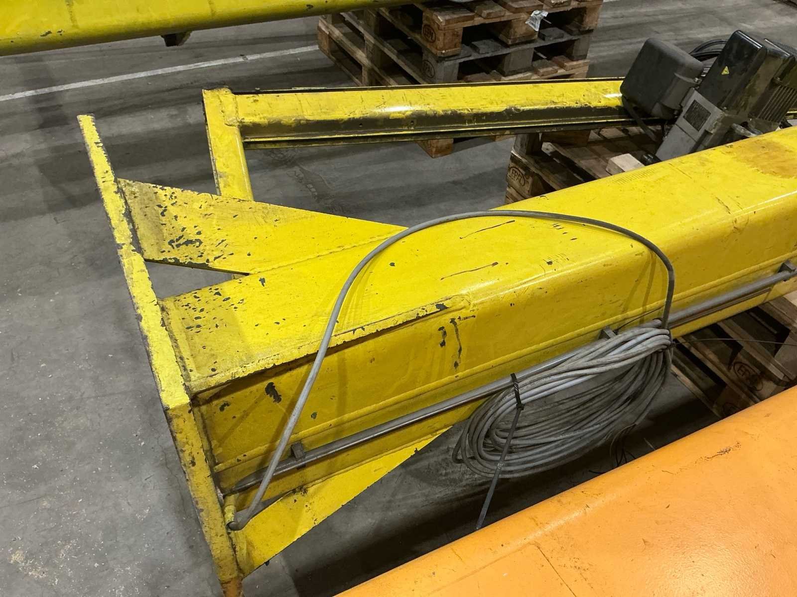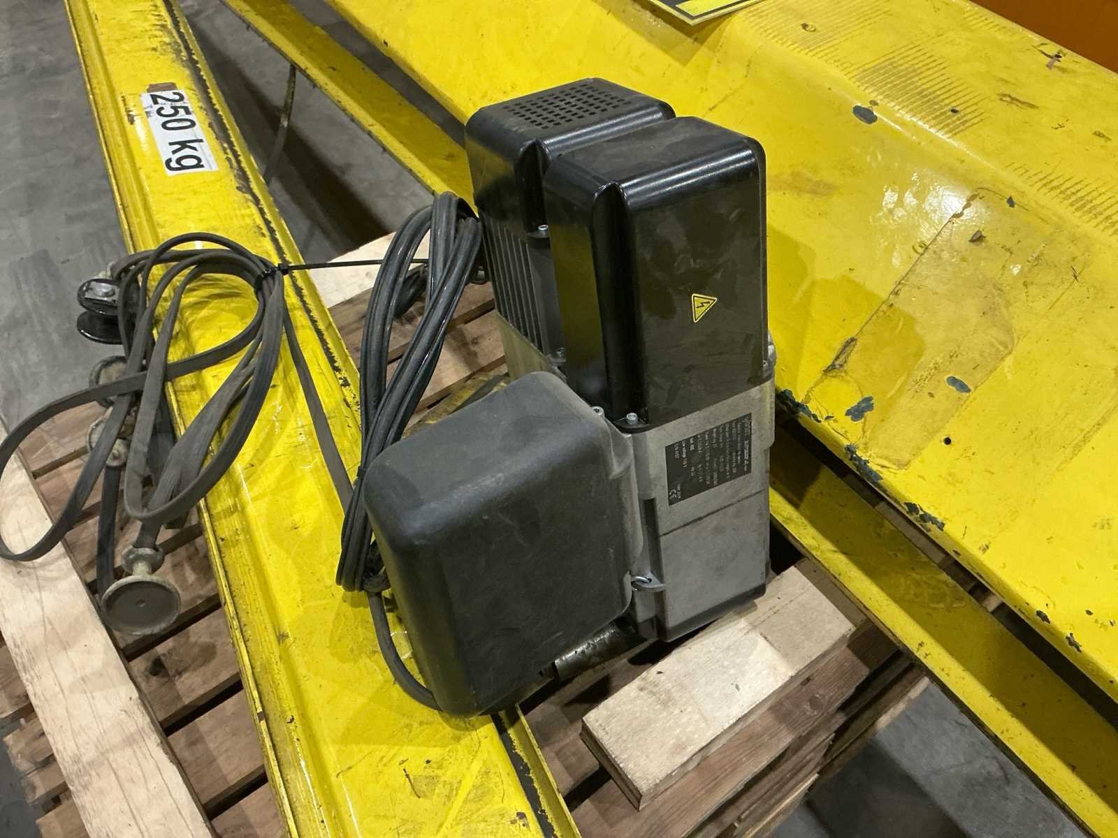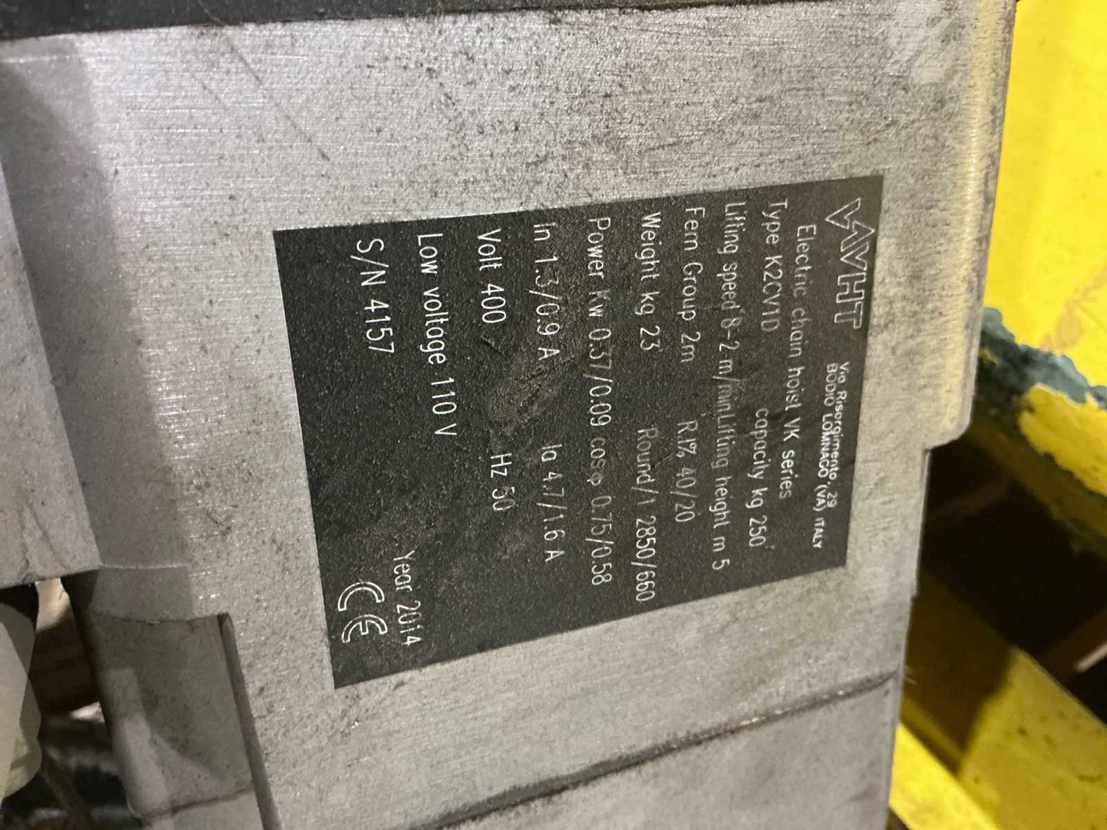 Merk takel: VHT (Vigor Hoisting Technology) Type takel: K2CV10 (IK series) Serienummer: 4157 Capaciteit: 250 kg Hijsmechanisme: Elektrische kettingtakel Hefsnelheid: 8 - 2 m/min Minimale hijslengte: 5 meter Voeding: 400 V – 50 Hz Hulpvoeding: 110 V Vermogen (motor): 0.37 / 0.09 kW Gewicht takel: 23 kg Bouwjaar takel: 2014 FEM classificatie: Groep 2m CE-markering No Merk: Demag Totale afmeting L: 5100mm Totale afmeting Breedte: 550mm Totale afmeting Hoogte: 4100mm