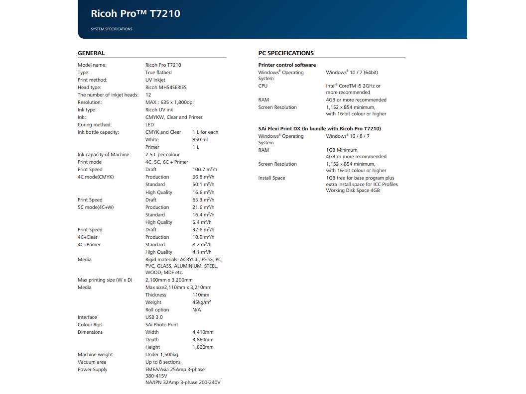 Koppen van de primer en transparant moeten vervangen worden. (De printer werkt ook zonder.) Voor verdere specificaties, zie laatste foto. Heftruck aanwezig voor laden. Nee Merk: Ricoh Type: Pro T7210 Bouwjaar: 2019 Afdrukformaat l: 2440mm Afdrukformaat b: 1220mm Resolutie (nr): 6351800dpi Aantal printkoppen: 12pcs Werkstuk dikte max.: 110mm Print snelheid: 100m²/hr Digitale besturing: true Machinegewicht: 1500kg Totale afmeting L: 4400mm Totale afmeting Breedte: 4500mm Totale afmeting Hoogte: 1600mm