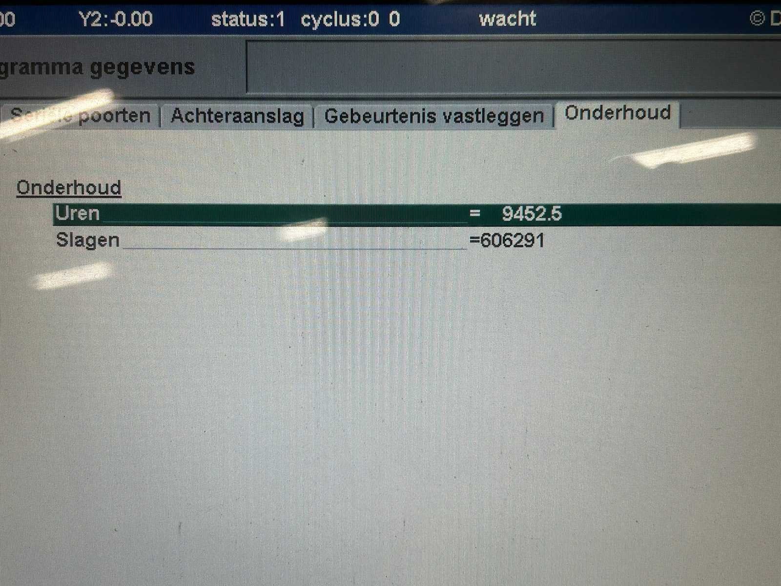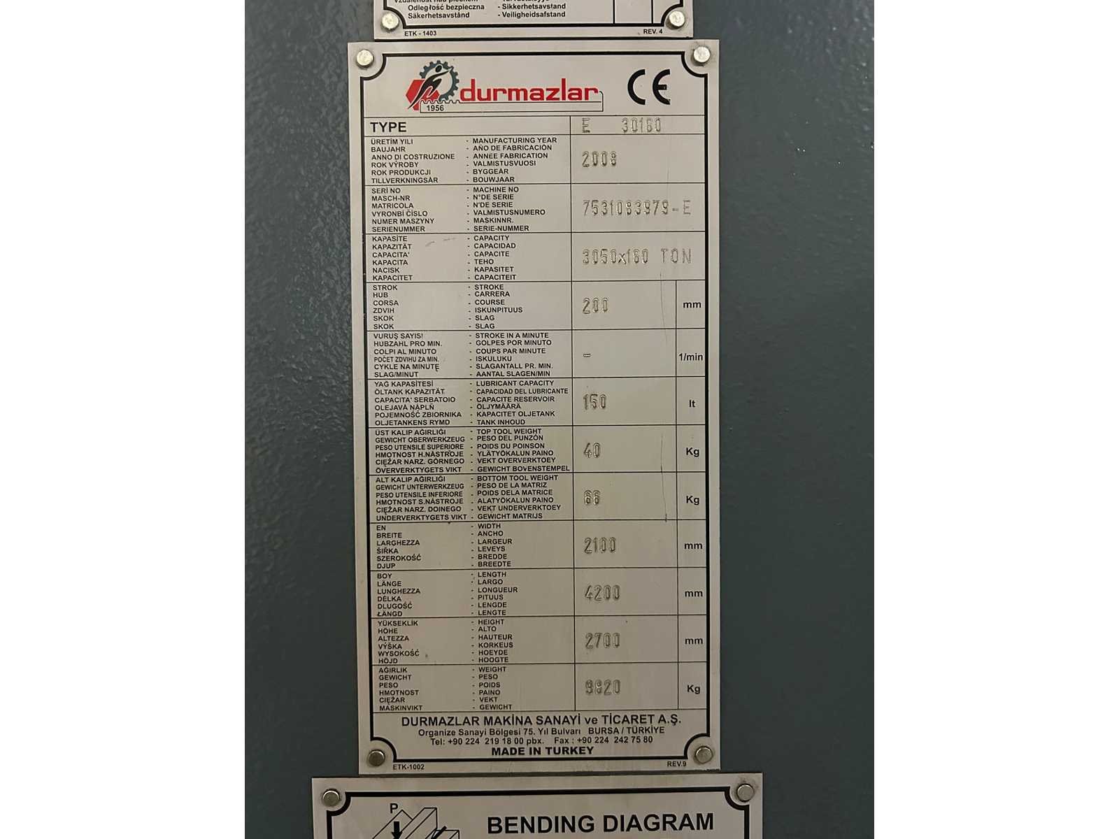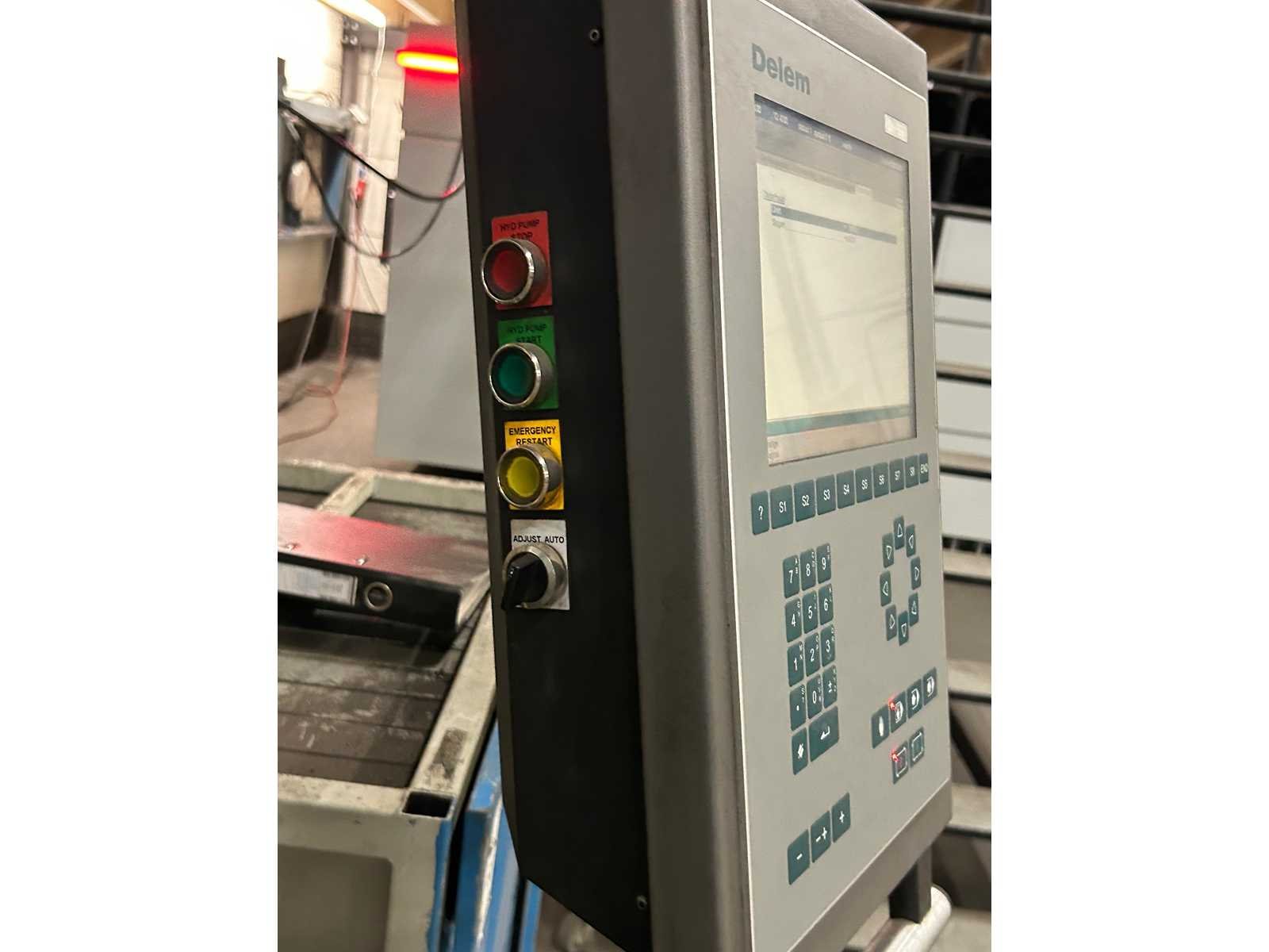European Style Bovenklemming. Motorische Bombering. Beveiliging voorzijde door SICK lichtscherm. Bediening door voetpedaal. 4 achteraanslagen handmatig te verplaatsen. Stroke 200 mm. Inclusief gereedschapskast met inhoud (1000x900x1200) per direct beschikbaar. No Merk: Durma Type: E30160 Bouwjaar: 2008 Serienummer: 7531083979-E Capaciteit.: 160t Werklengte: 3050mm Voetbediening: true Achteraanslag handbediend: true CNC-besturing, merk, type: DELEM DA-56 Afgelezen urenstand: 9452 Machinegewicht: 9820kg Afmeting l: 4200mm Afmeting b: 2100mm Afmeting h: 2700mm Leveringsvoorwaarden: Niet gefundeerd - onverpakt