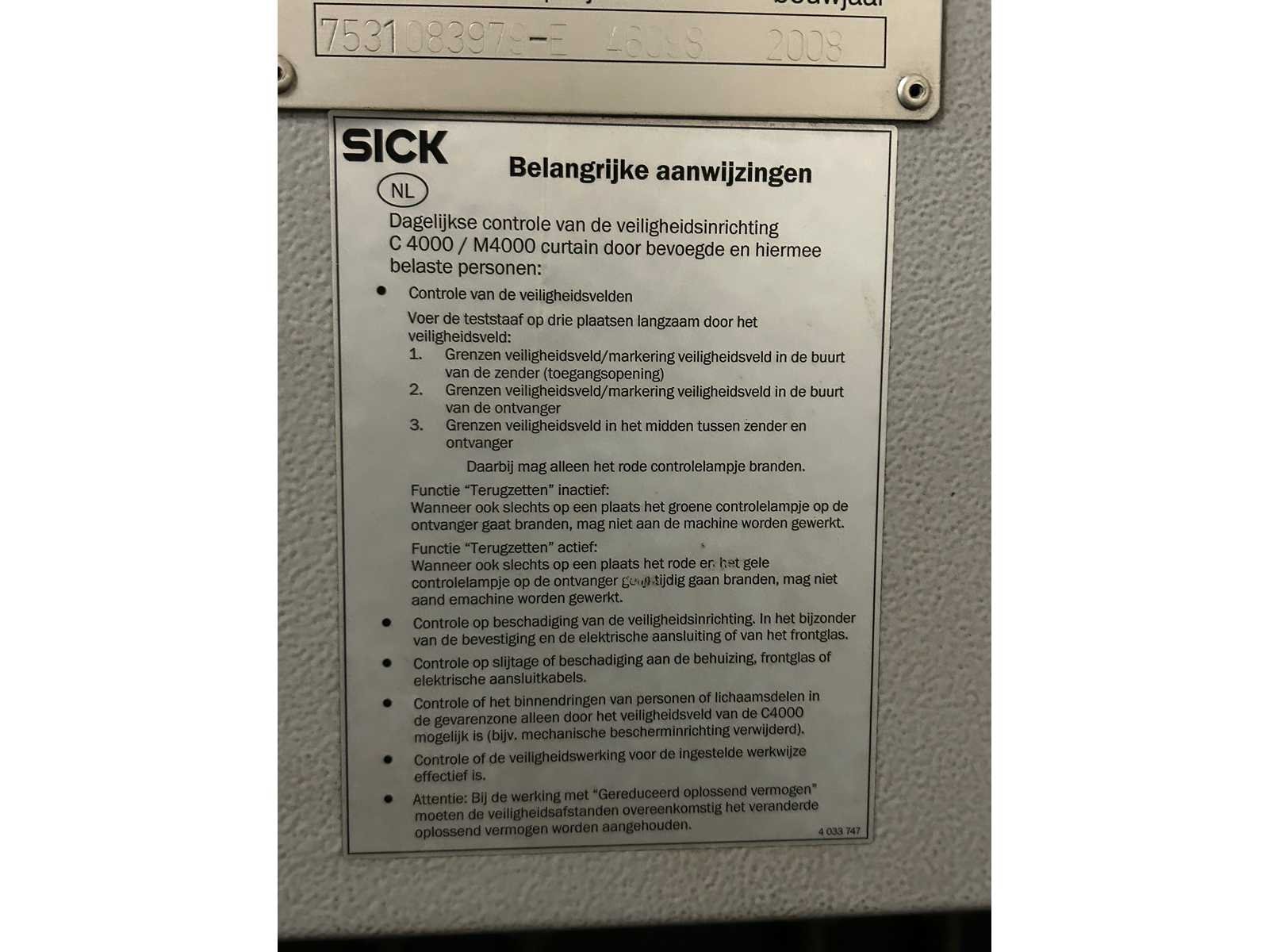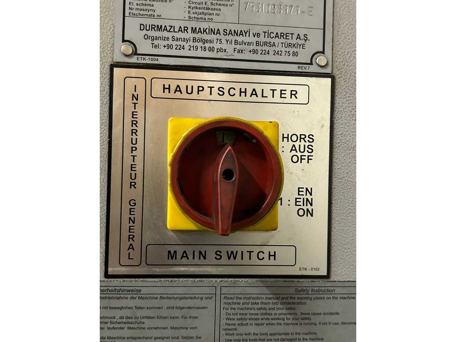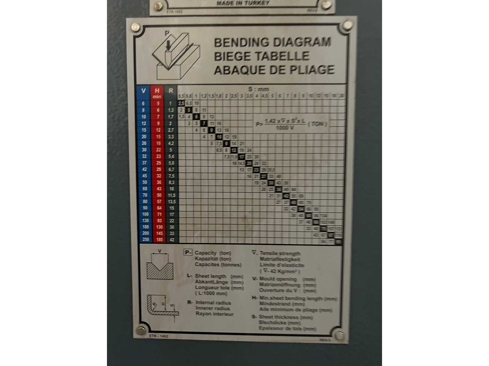 European Style Bovenklemming. Motorische Bombering. Beveiliging voorzijde door SICK lichtscherm. Bediening door voetpedaal. 4 achteraanslagen handmatig te verplaatsen. Stroke 200 mm. Inclusief gereedschapskast met inhoud (1000x900x1200) per direct beschikbaar. No Merk: Durma Type: E30160 Bouwjaar: 2008 Serienummer: 7531083979-E Capaciteit.: 160t Werklengte: 3050mm Voetbediening: true Achteraanslag handbediend: true CNC-besturing, merk, type: DELEM DA-56 Afgelezen urenstand: 9452 Machinegewicht: 9820kg Afmeting l: 4200mm Afmeting b: 2100mm Afmeting h: 2700mm Leveringsvoorwaarden: Niet gefundeerd - onverpakt
