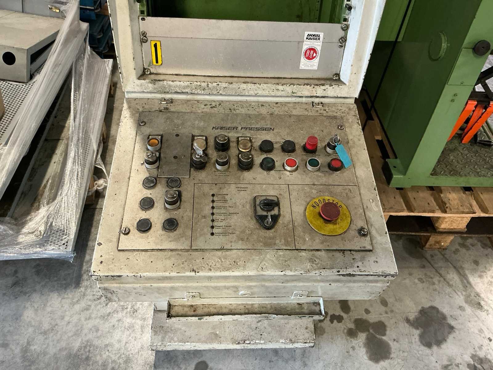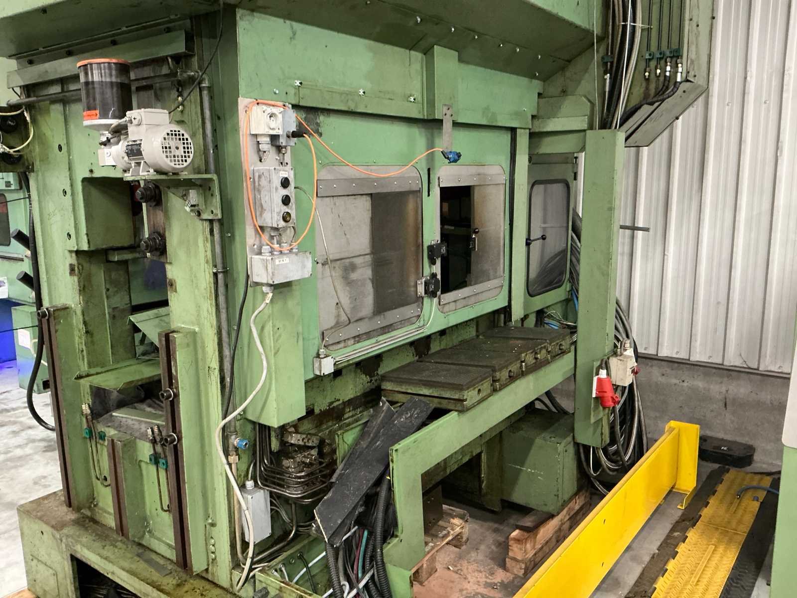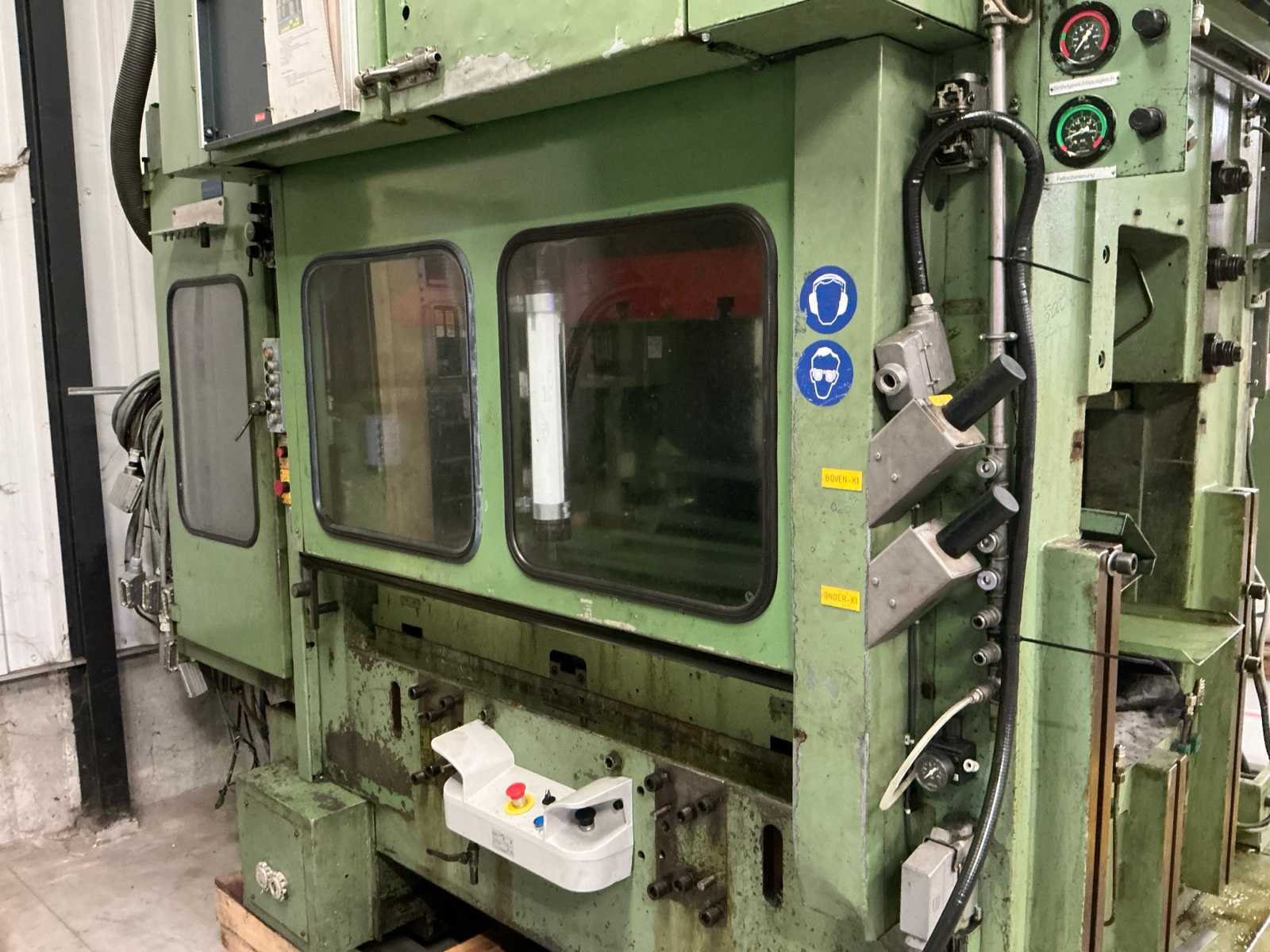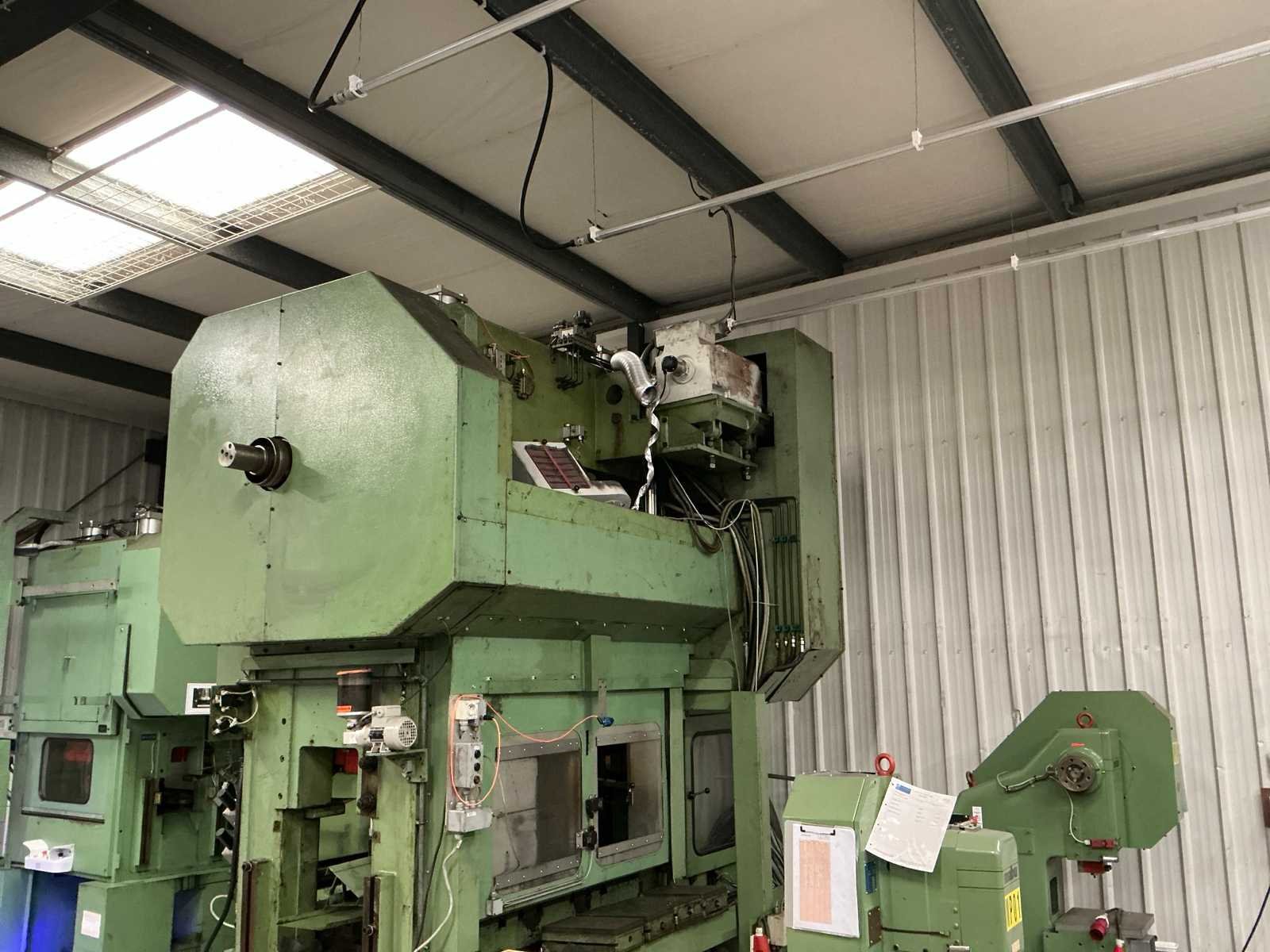 Voorzien van: slag 20-120mm, ruimte tussen kolommen 1500mm, tafelmaat 1420x900, tafelhoogte 890, No Merk: Kaiser Type: 160 T Bouwjaar: 1990 Serienummer: 131143 Capaciteit.: 160t Aansluiting: 400V Machinegewicht: 25000kg Afmeting l: 3500mm Afmeting b: 2200mm Afmeting h: 4000mm
