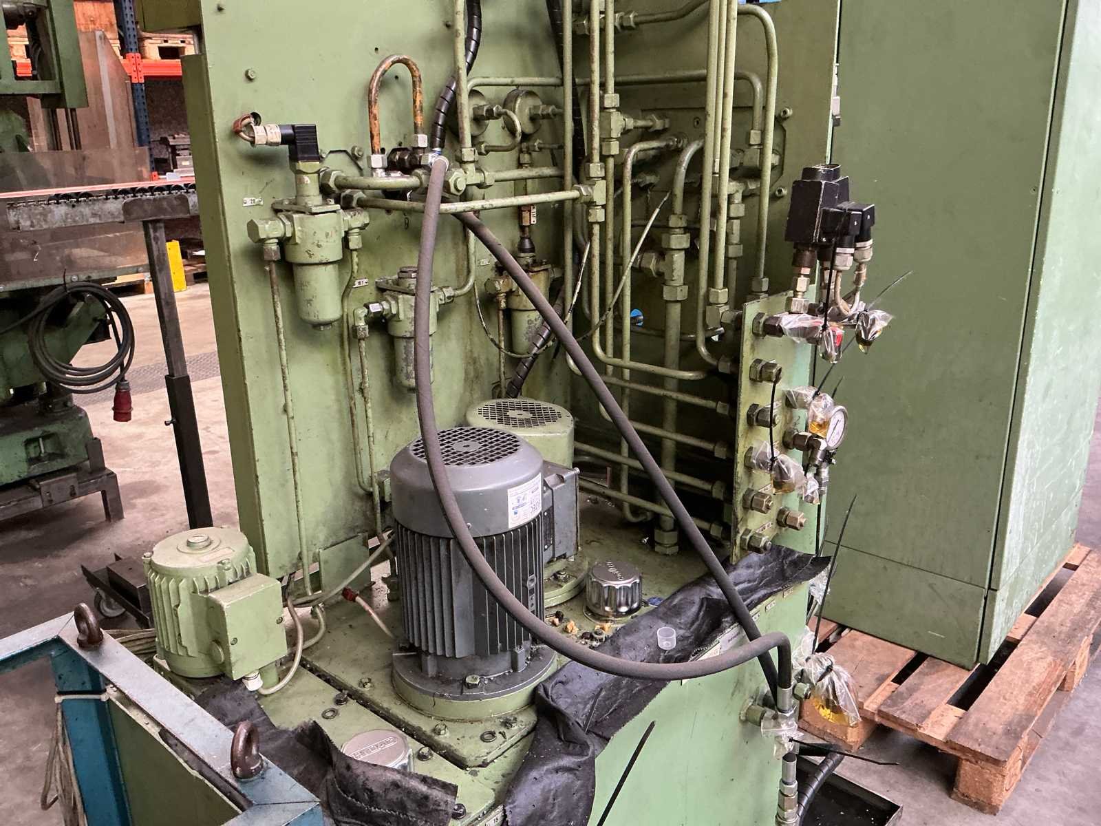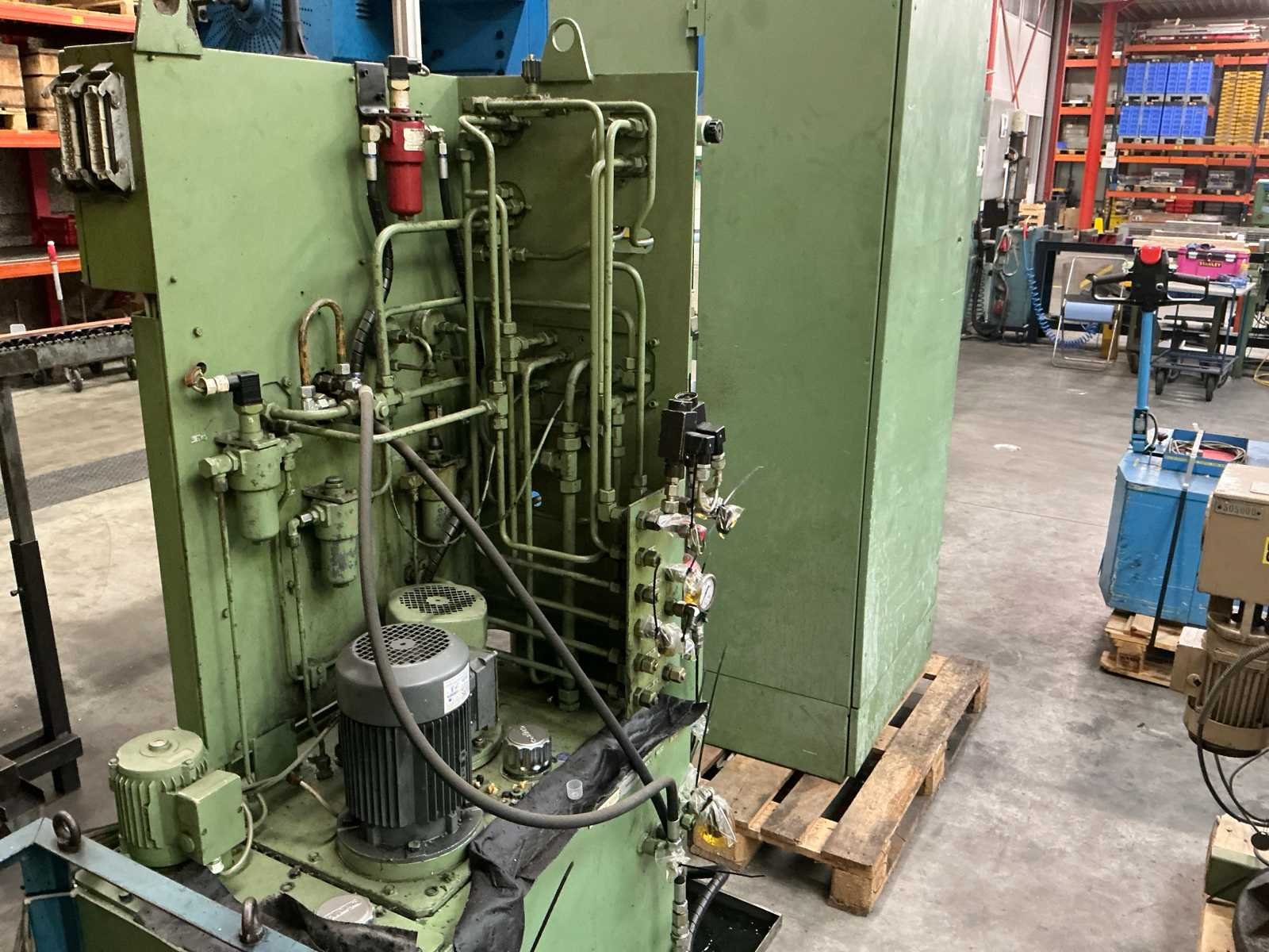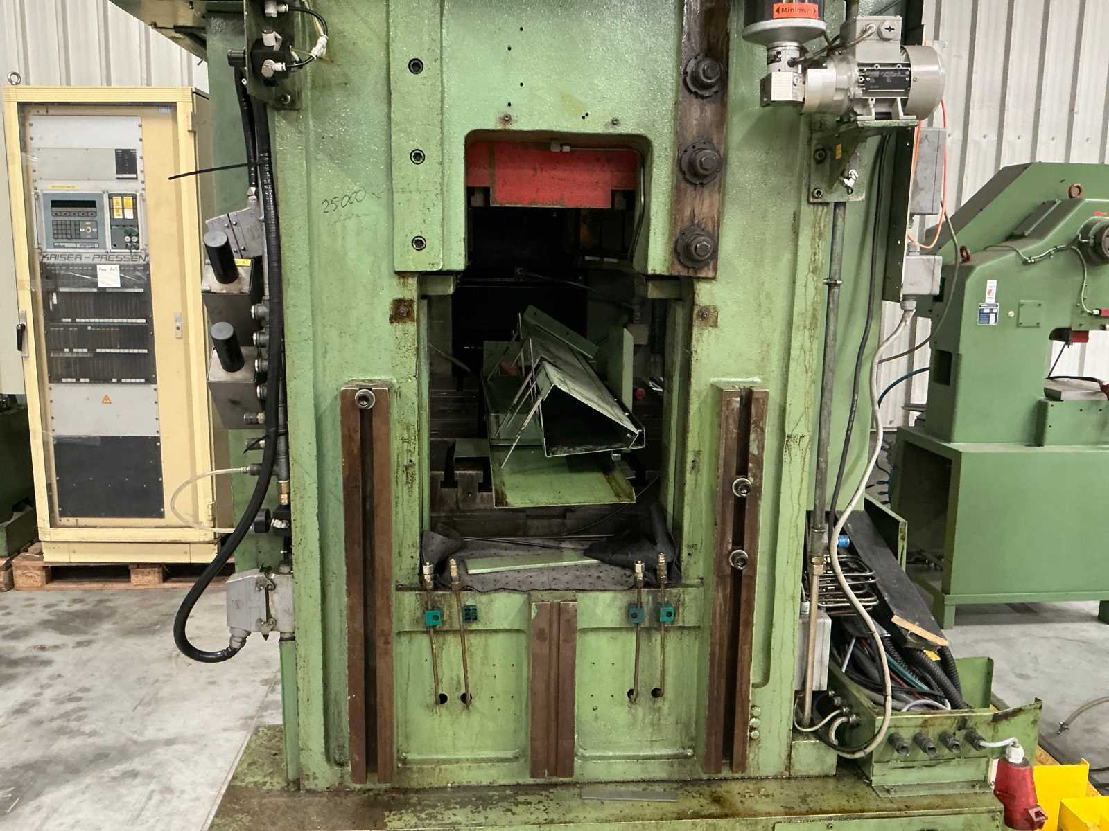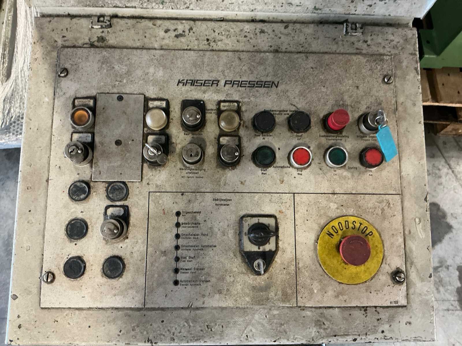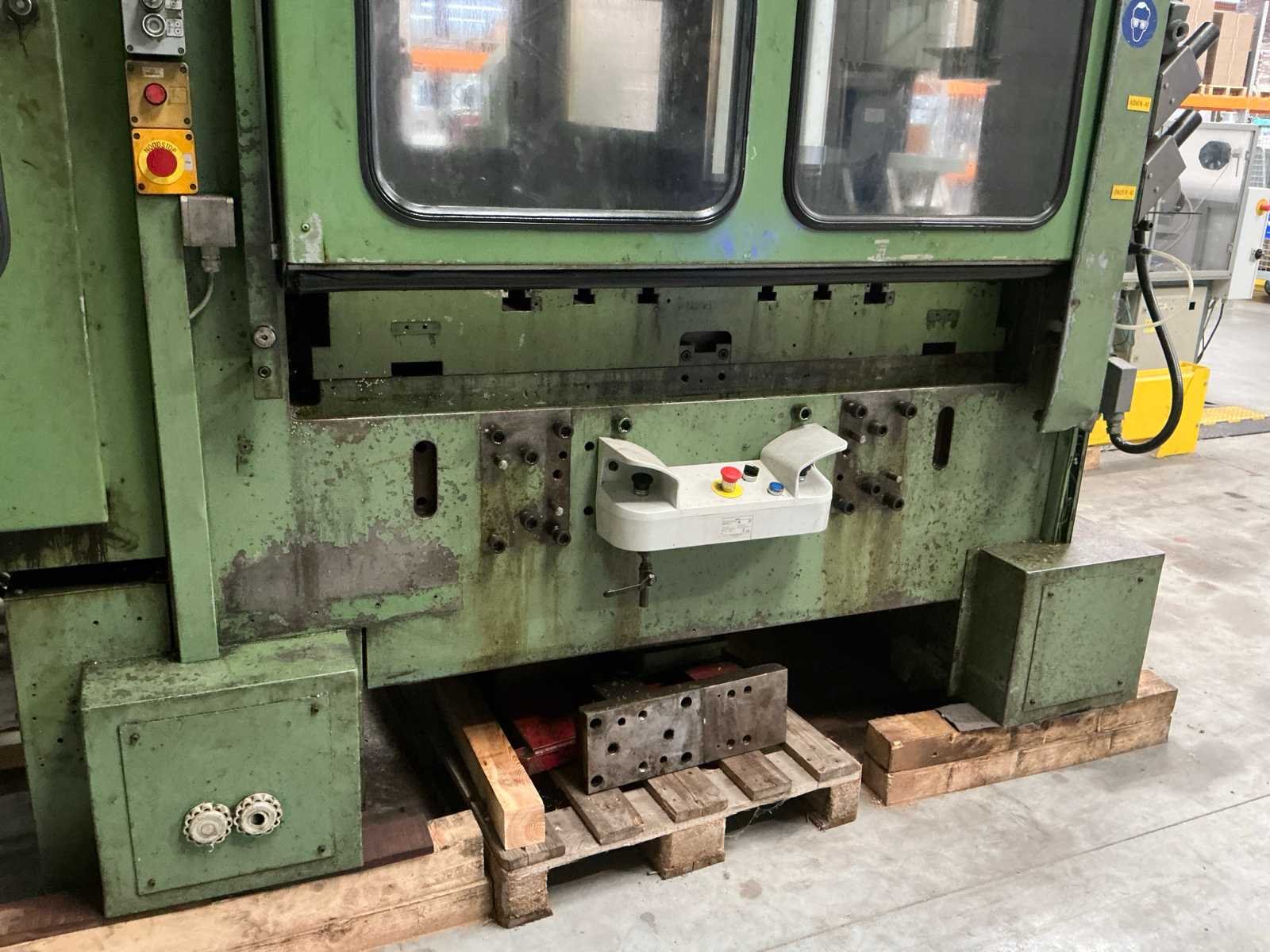 Voorzien van: slag 20-120mm, ruimte tussen kolommen 1500mm, tafelmaat 1420x900, tafelhoogte 890, No Merk: Kaiser Type: 160 T Bouwjaar: 1990 Serienummer: 131143 Capaciteit.: 160t Aansluiting: 400V Machinegewicht: 25000kg Afmeting l: 3500mm Afmeting b: 2200mm Afmeting h: 4000mm