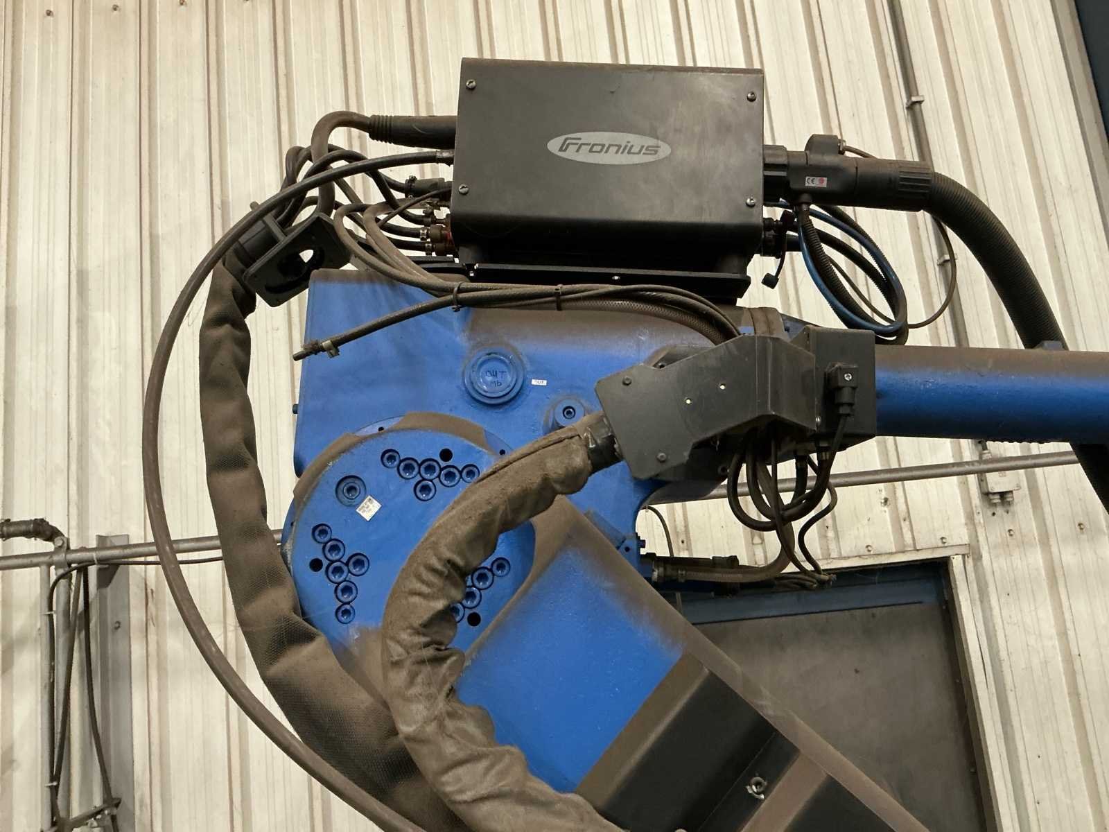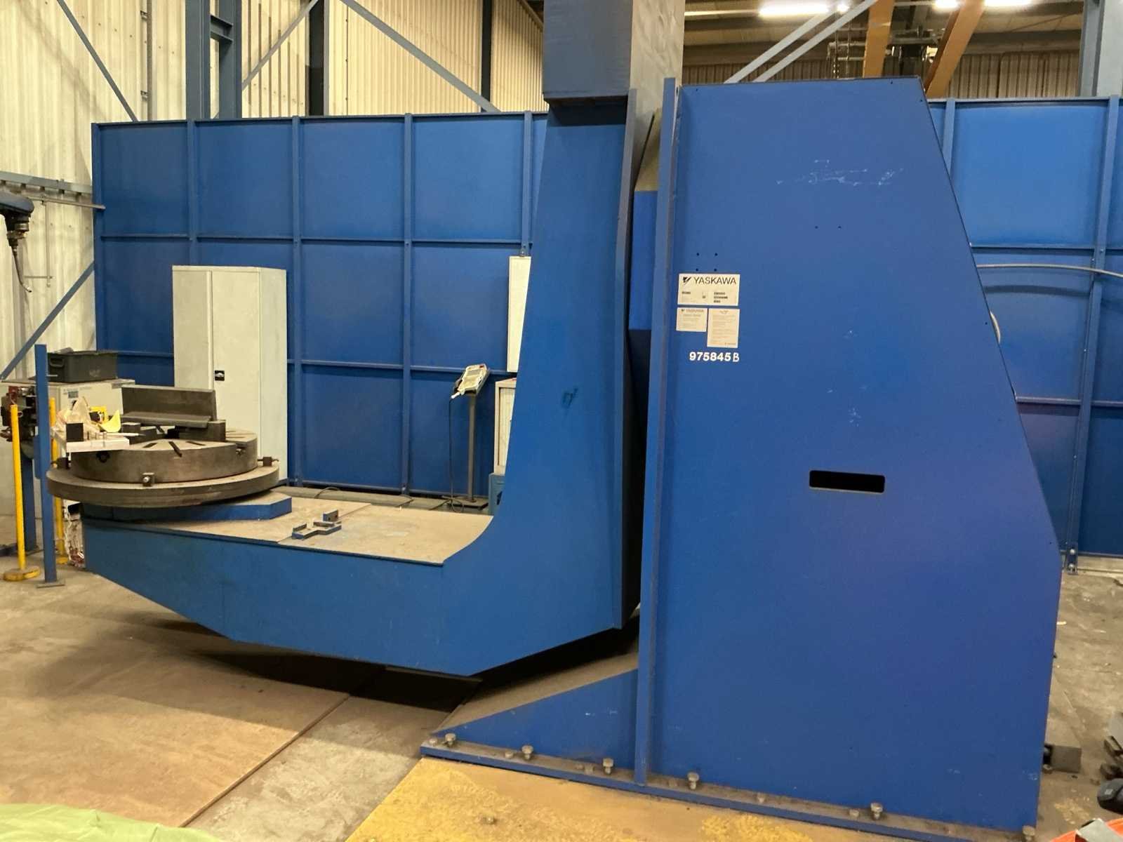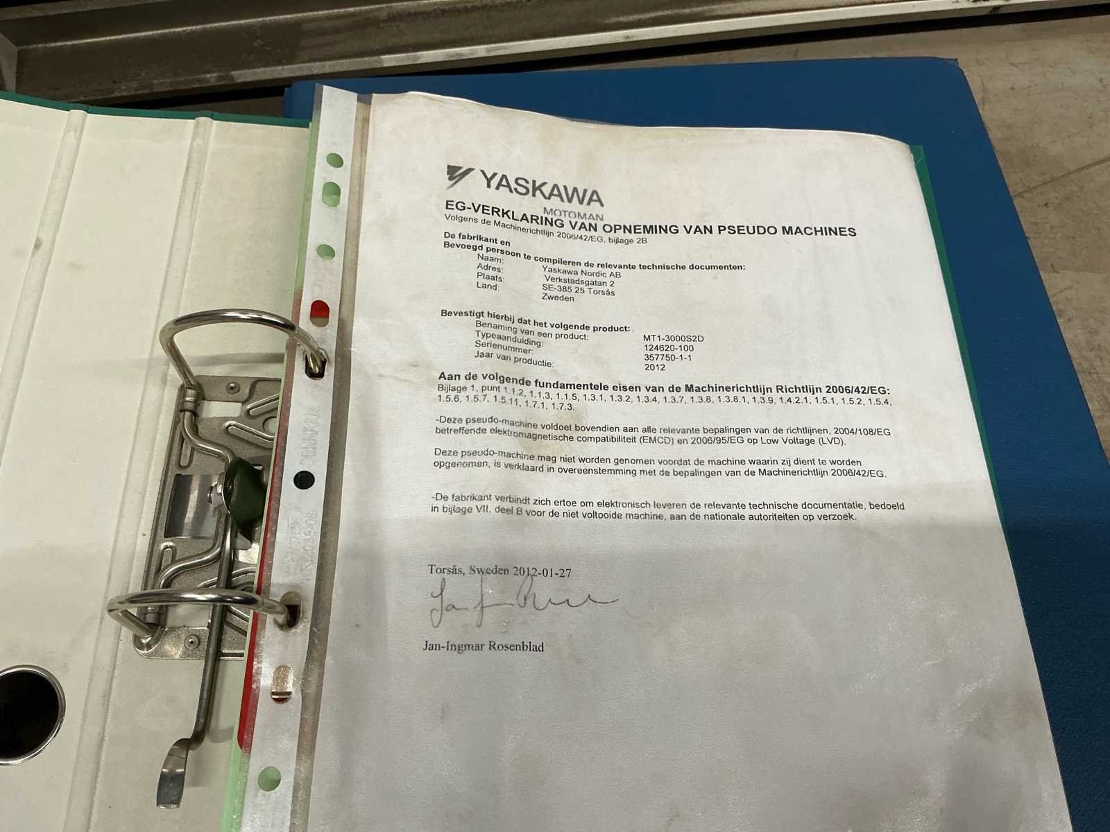 Bestaat uit: lasrobot, huidige opstelling 8000x5000mm, Yaskawa MT1-3000-S2D, MIG/MAG of TIG-laswerkplekken, aantal assen, 2-as (tilt + rotatie), maximaal draagvermogen 3,000 kg, ilting-as (tilt-as) — statisch / dynamisch koppel± 15.058 Nm (dynamic / static) in de MT1-3000S2D specificatie, tilting-as rotatiesnelheid (nominaal) 0 – 1.9 rpm (nominaal), max. ≈ 2.5 rpm, rotatie-as (turntable) — statisch / dynamisch koppel ± 10.498 Nm (dynamic / static) voor de rotatie-as volgens MT1-3000S2D datasheet, rotatie-as rotatiesnelheid (nominaal / max) 0 – 2.7 rpm (nominaal), max. ≈ 3.6 rpm, maximale verplaatsing van het zwaartepunt (offset COG) ≈ 285 mm (voor tilt/rotate configuratie zoals MT1-3000), gewicht unit (positioner zelf) ca. 7,061 kg voor MT1-3000S2D (volgens datasheet), station-configuratie 1 station (enkel positioneringsstation), toepassing voor manipulatie, positionering van werkstukken — veelvuldig gebruikt bij lassen, snijden, handling van zware onderdelen, ronius FK 4000-r Fc, koelvermogen: 1360 W (bij 25 °C en een debiet van 1 l/min), koelvloeistofcapaciteit: 5,5 liter, maximale opvoerhoogte: ~30.000 mm (30 m)., vloerplaat manipulator 2500x2800x30, voetplaat onder rotatie 2060x3000x10mm, lasrobot Yaskawa Motoman MH50-20, draagvermogen: 20 kg, aantal assen: 6, bereik: 3.106 mm, herhaalbaarheid: ±0,15 mm, massa (robot): 495 kg, montage: vloer, controlleropties: DX100, DX200, toepassingen: booglassen, coaten, doseren, machinebediening, materiaalbehandeling, snijden, incl.SICK M4000 veiligheidslichtscherm, veiligheidsinrichting met meerdere lichtbundels. Compleet werkende installatie, met veel nieuwe slijtdelen. Complete documentatie aanwezig, handleidingen, schema's. Lasrobot, manipulator, adapters, slede, koelunit, lasapparaat, schakelkast, kabelgoten met kabels, veiligheidshekken, en veiligheid lichtscherm, vloerplaten. Alles nog opgesteld, professionele demontage voor koper, datum en tijdstip in overleg met verkoper. Nee Merk: Yaskawa Type: MT1-3000-S2D Bouwjaar: 2012 Serienummer: 609955-357750-1-1 Draagcapaciteit: 3000kg Aantal assen: 6 Bedieningsunit type: DX100 - DX200 Merk en type lasmachine: Yaskawa Aansluiting: 400V Machinegewicht: 7150kg Afmeting l: 4200mm Afmeting b: 1300mm Afmeting h: 3100mm