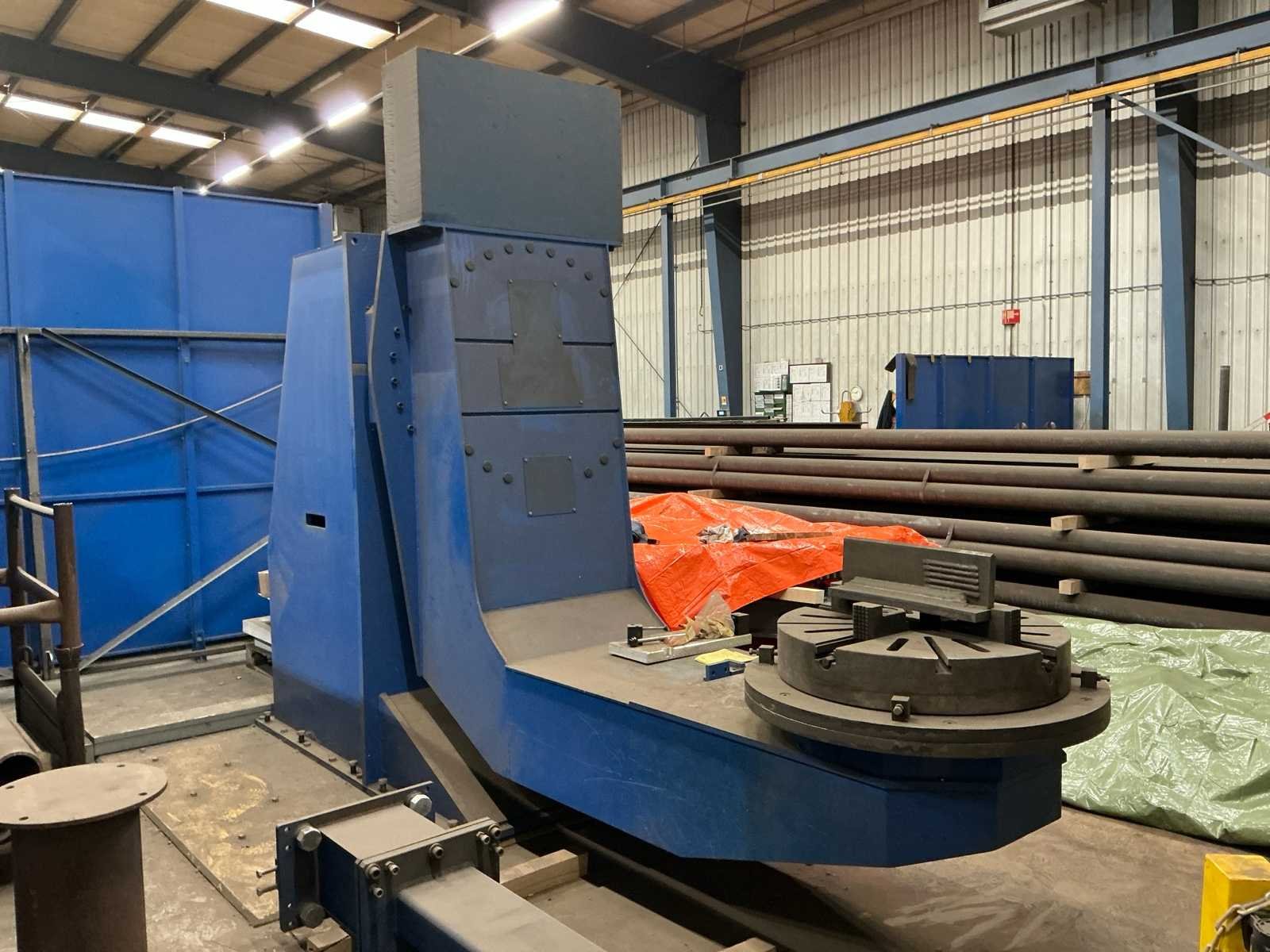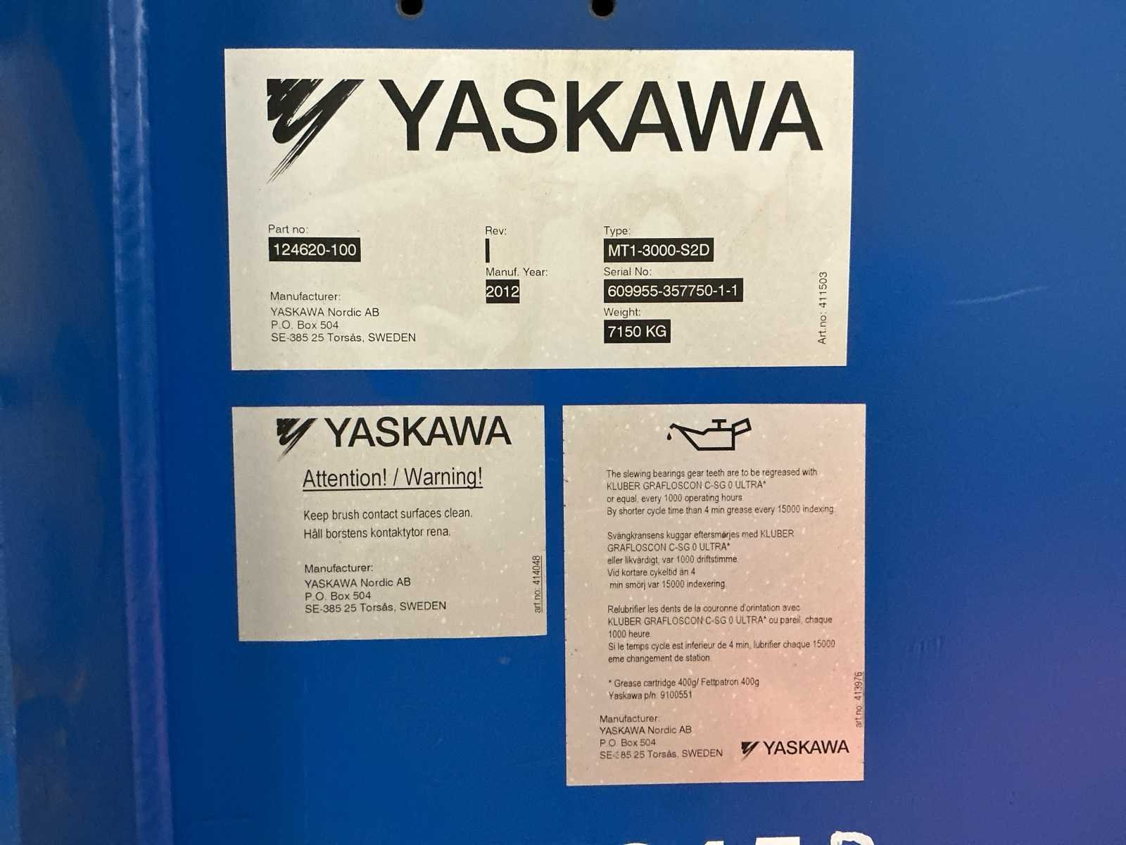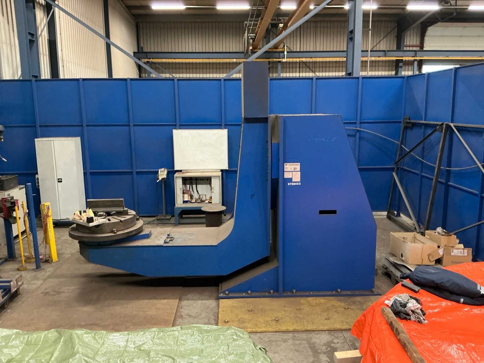 Bestaat uit: lasrobot, huidige opstelling 8000x5000mm, Yaskawa MT1-3000-S2D, MIG/MAG of TIG-laswerkplekken, aantal assen, 2-as (tilt + rotatie), maximaal draagvermogen 3,000 kg, ilting-as (tilt-as) — statisch / dynamisch koppel± 15.058 Nm (dynamic / static) in de MT1-3000S2D specificatie, tilting-as rotatiesnelheid (nominaal) 0 – 1.9 rpm (nominaal), max. ≈ 2.5 rpm, rotatie-as (turntable) — statisch / dynamisch koppel ± 10.498 Nm (dynamic / static) voor de rotatie-as volgens MT1-3000S2D datasheet, rotatie-as rotatiesnelheid (nominaal / max) 0 – 2.7 rpm (nominaal), max. ≈ 3.6 rpm, maximale verplaatsing van het zwaartepunt (offset COG) ≈ 285 mm (voor tilt/rotate configuratie zoals MT1-3000), gewicht unit (positioner zelf) ca. 7,061 kg voor MT1-3000S2D (volgens datasheet), station-configuratie 1 station (enkel positioneringsstation), toepassing voor manipulatie, positionering van werkstukken — veelvuldig gebruikt bij lassen, snijden, handling van zware onderdelen, ronius FK 4000-r Fc, koelvermogen: 1360 W (bij 25 °C en een debiet van 1 l/min), koelvloeistofcapaciteit: 5,5 liter, maximale opvoerhoogte: ~30.000 mm (30 m)., vloerplaat manipulator 2500x2800x30, voetplaat onder rotatie 2060x3000x10mm, lasrobot Yaskawa Motoman MH50-20, draagvermogen: 20 kg, aantal assen: 6, bereik: 3.106 mm, herhaalbaarheid: ±0,15 mm, massa (robot): 495 kg, montage: vloer, controlleropties: DX100, DX200, toepassingen: booglassen, coaten, doseren, machinebediening, materiaalbehandeling, snijden, incl.SICK M4000 veiligheidslichtscherm, veiligheidsinrichting met meerdere lichtbundels. Compleet werkende installatie, met veel nieuwe slijtdelen. Complete documentatie aanwezig, handleidingen, schema's. Lasrobot, manipulator, adapters, slede, koelunit, lasapparaat, schakelkast, kabelgoten met kabels, veiligheidshekken, en veiligheid lichtscherm, vloerplaten. Alles nog opgesteld, professionele demontage voor koper, datum en tijdstip in overleg met verkoper. Nee Merk: Yaskawa Type: MT1-3000-S2D Bouwjaar: 2012 Serienummer: 609955-357750-1-1 Draagcapaciteit: 3000kg Aantal assen: 6 Bedieningsunit type: DX100 - DX200 Merk en type lasmachine: Yaskawa Aansluiting: 400V Machinegewicht: 7150kg Afmeting l: 4200mm Afmeting b: 1300mm Afmeting h: 3100mm