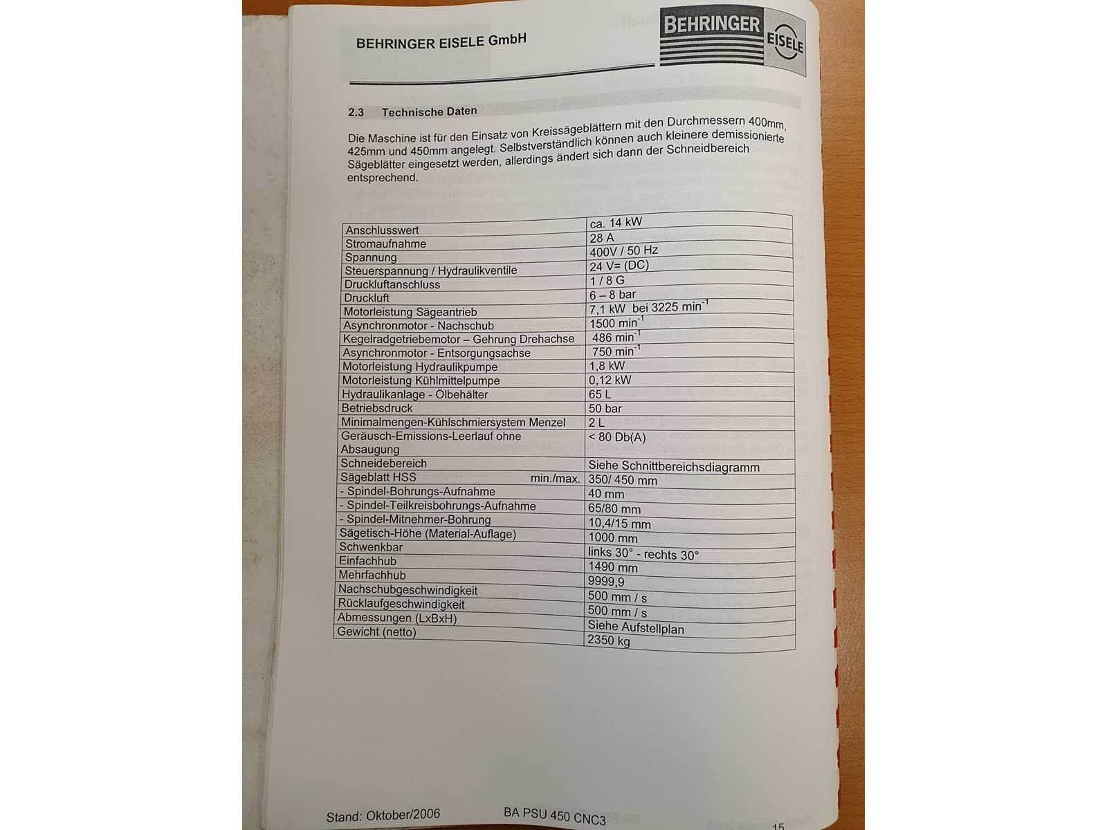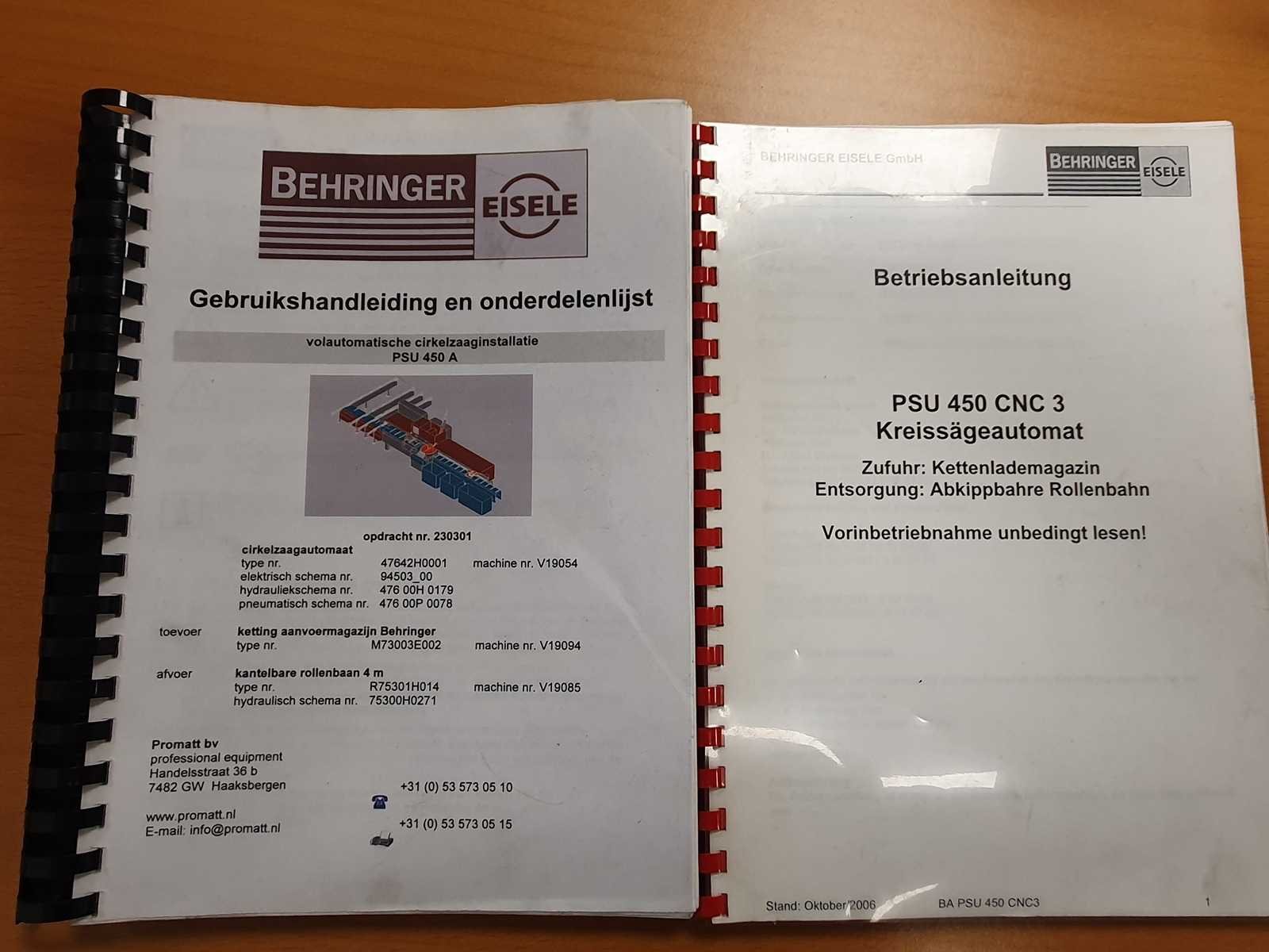 Zaagbereik Ø / vierkant bij 90° 150 mm / 240 mm x 70 mm Zaagbereik Ø / vierkant bij 45° 145 mm / 170 mm x 70 mm Zaagbereik Ø / vierkant bij 30° 120 mm / 120 mm x 70 mm Kleinste materiaalafmetingen Ø / vlak 10 mm / 10 mm x 10 mm Minimale reststuklengte bij 90° automatisch vanaf 115 mm Minimale zaaglengte bij 90° automatisch vanaf 20 mm Toerental 10 – 40 min⁻¹ Hoeveelheid koelsmeermiddel 30 l Systeemdruk 50 bar Motorvermogen zaagaandrijving 7,1 kW Motorvermogen hydrauliekpomp 1,8 kW Motorvermogen spanentransporteur 0,18 kW Aansluitwaarde 13 kW Spanning 400 V, 50 Hz Stuursapanning / hydrauliekventielspanning 24 V = (DC) Stroomopname 28 A Afzekering 35 A Doorsnede toevoer min. 5 x 6 mm² Zaagblad max. 450 mm Machine is geheel gedemonteerd i.v.m. plaats gebrek door verandering van werkzaamheden. Bezichtiging mogelijk op afspraak, echter weinig aan te zien omdat de machine in opslag staat. Lading d.m.v Heftruck op/in vrachtauto wordt verzorgd op afspraak. Afhaallocatie wordt bekend gemaakt na sluiting van de veiling. Nee Merk: Behringer Type: PSU 450 CNC Bouwjaar: 2006 Zaagblad Ø: 400-425-450mm Verstekhoek max.: 30° Machinegewicht: 2600kg Afmeting l: 4700mm Afmeting b: 2300mm Afmeting h: 2500mm