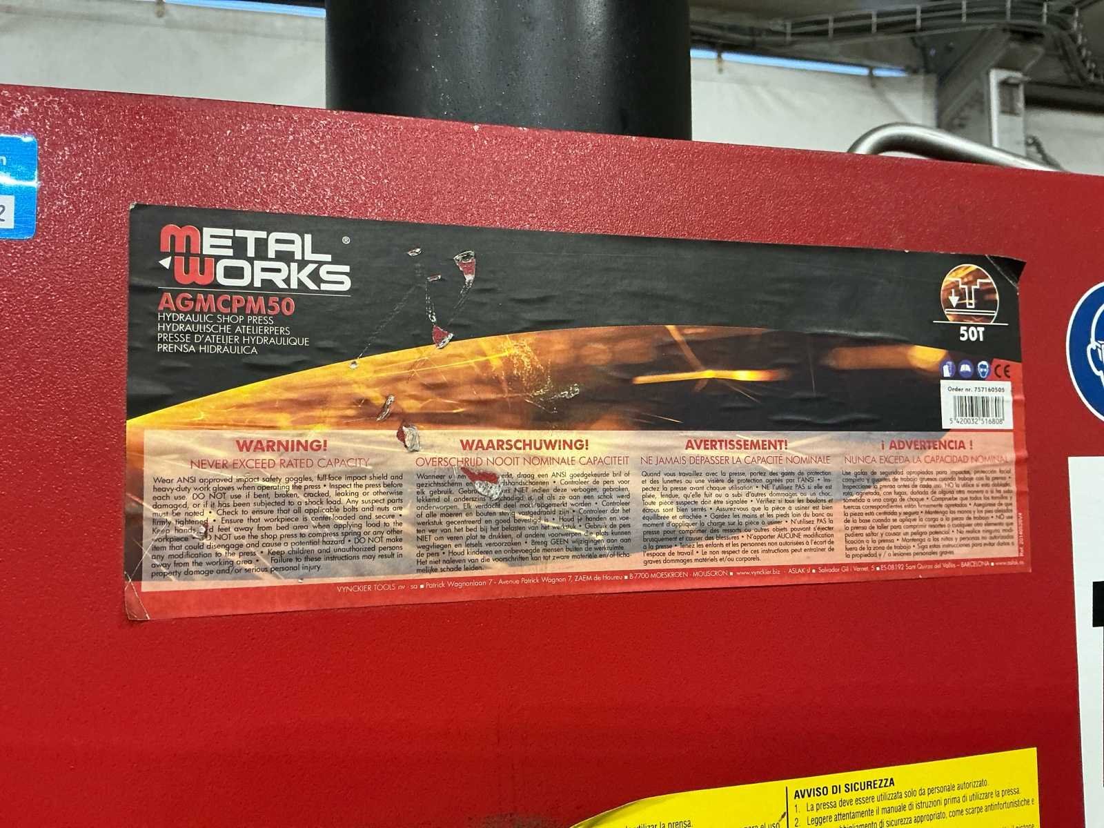 Motor: Valtaro Motori, 2,2 kW, 230/400V, IP55 Hydrauliekpomp: Bosch Rexroth (label: R932010893) Bouwjaar: Waarschijnlijk 2015 (volgens pomp) No Merk: Metal Works Type: PPH50B Bouwjaar: 2015 Serienummer: 101826325 Perskracht: 490.5kN Aansluiting: 400V Handboek aanwezig: true Machinegewicht: 282kg Afmeting l: 660mm Afmeting b: 1550mm Afmeting h: 2200mm