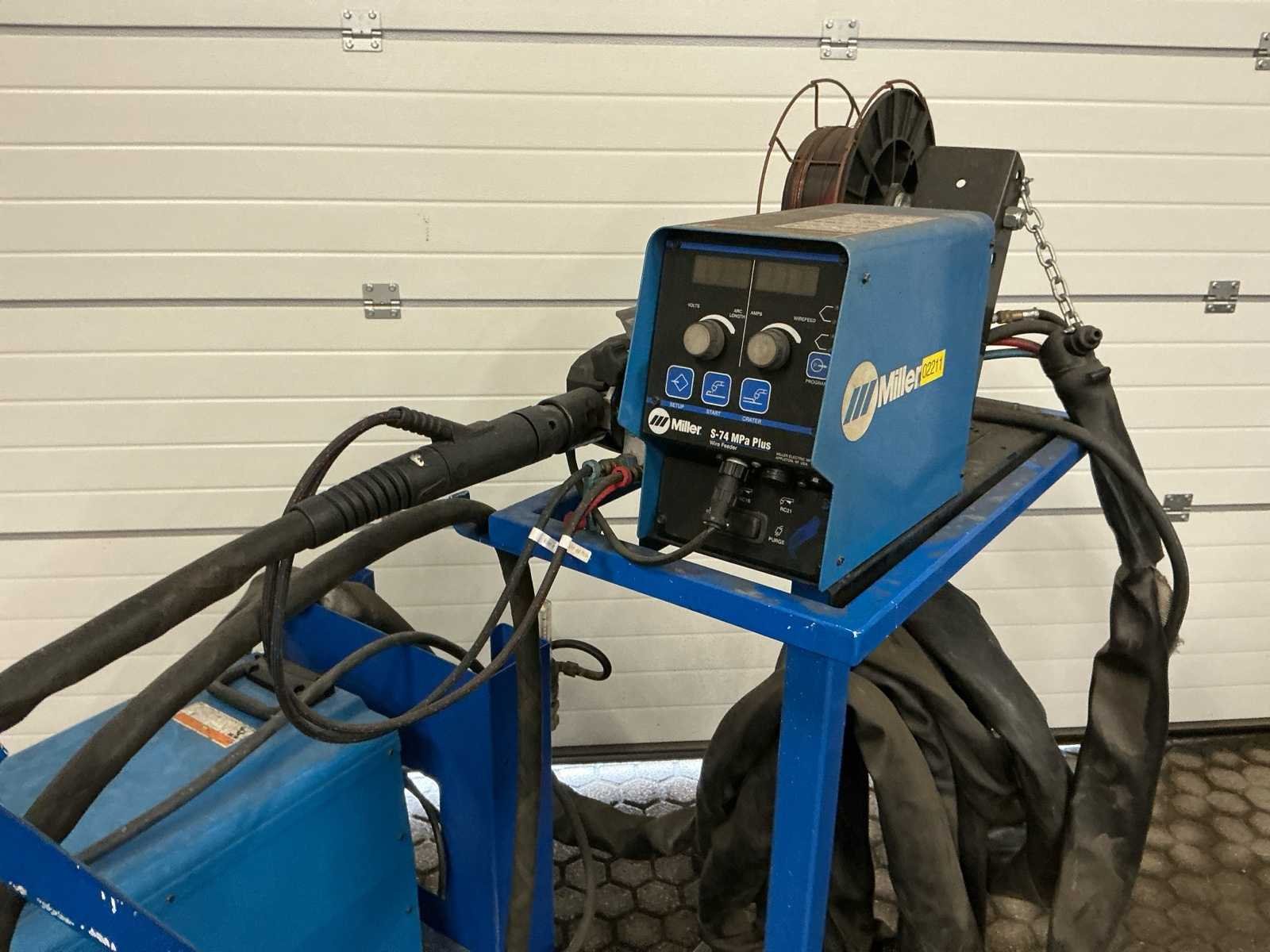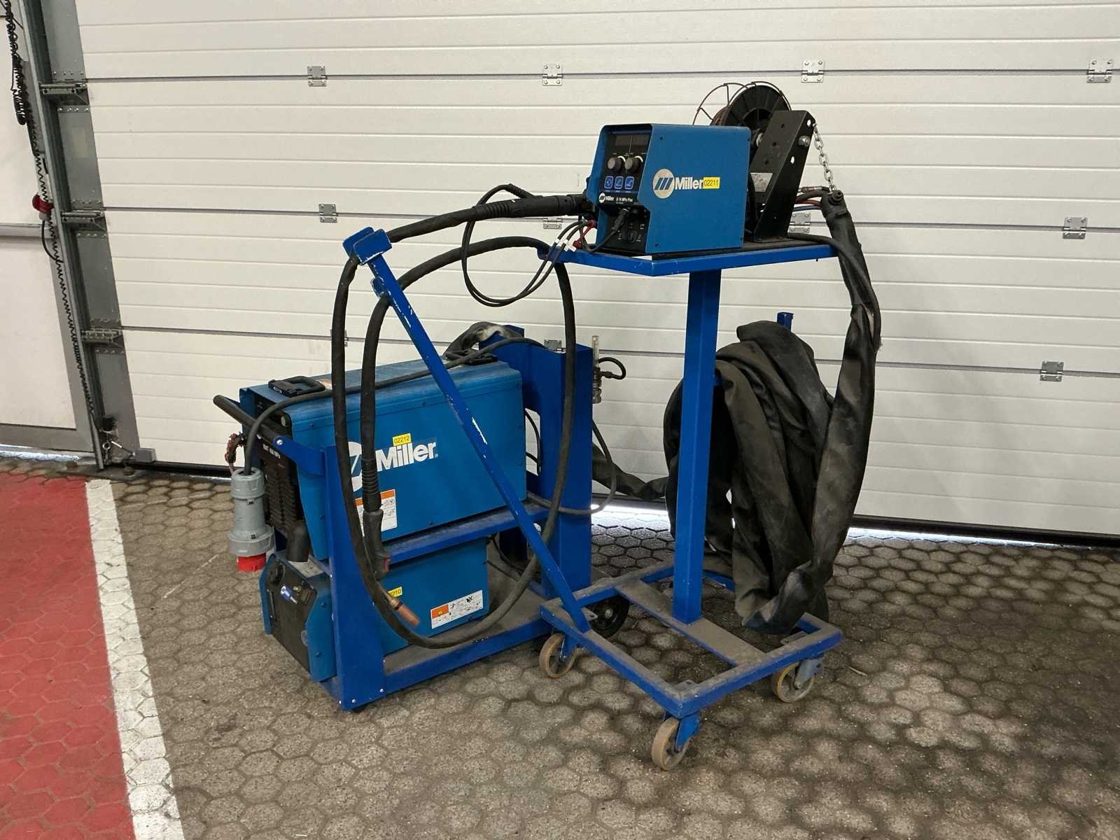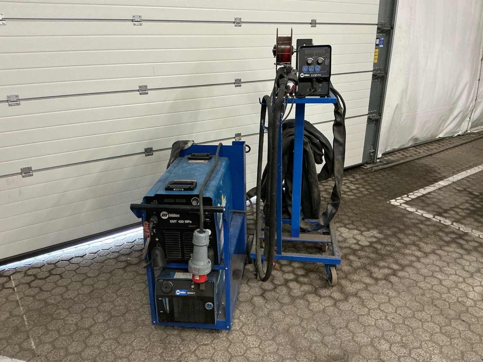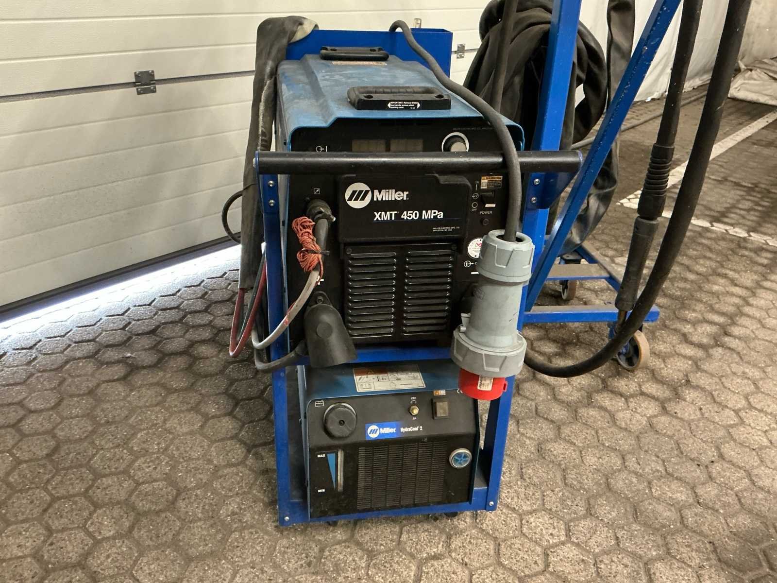 Miller XMT 450 MPa lasbron, bouwjaar 2012, vermogen 450A bij 100% inschakelduur, 3-fase aansluiting op 400V. Miller HydraCool 2 V.11S waterkoeler, bouwjaar 2014, voeding 115V, met koelcapaciteit van 1,76 kW bij 1 l/min @ 0,6 MPa. Draadaanvoerunit Miller (24V / 10A), bouwjaar vermoedelijk 2014–2015, type met synergische regeling en lastoorts inbegrepen. De set is compleet opgebouwd op een verrijdbare stalen trolley, inclusief lastoorts, CEE-aansluitstekker, slangenpakket en gasaansluiting. De draadaanvoerunit is voorzien van bedieningsconsole en is verbonden met de XMT-lasbron via industriële kabels. Digitale uitlezing op de lasbron en nauwkeurige regeling, geschikt voor MIG/MAG toepassingen met waterkoeling. HydraCool koeler beschikt over vulniveau-indicatie en separate netschakelaar. Nee Merk: Miller Type: XMT 450 MPa Bouwjaar: 2014 Serienummer: MG4125311U Max. lasvermogen: 450A Aansluiting: 400V Digitale uitlezing: true