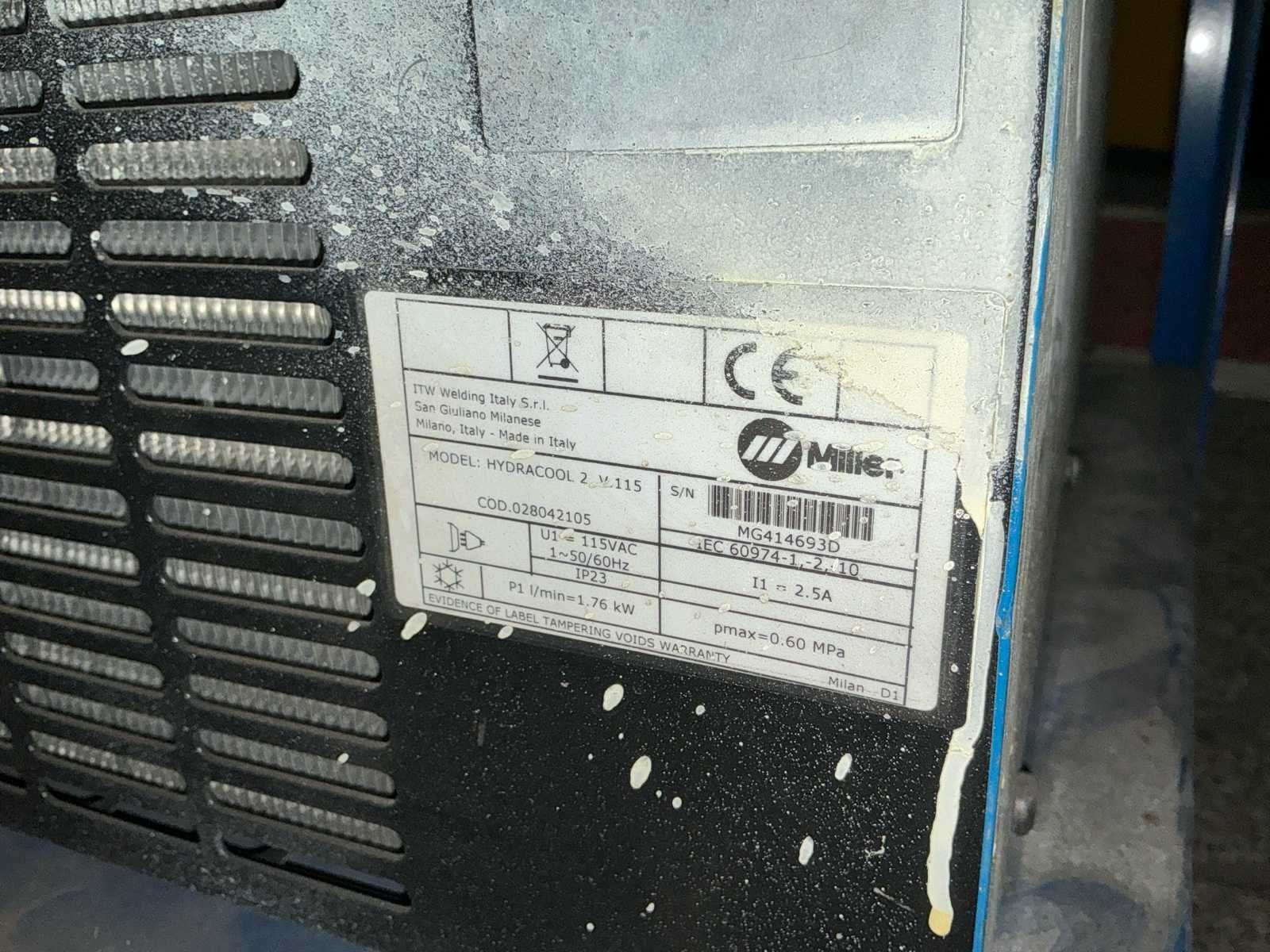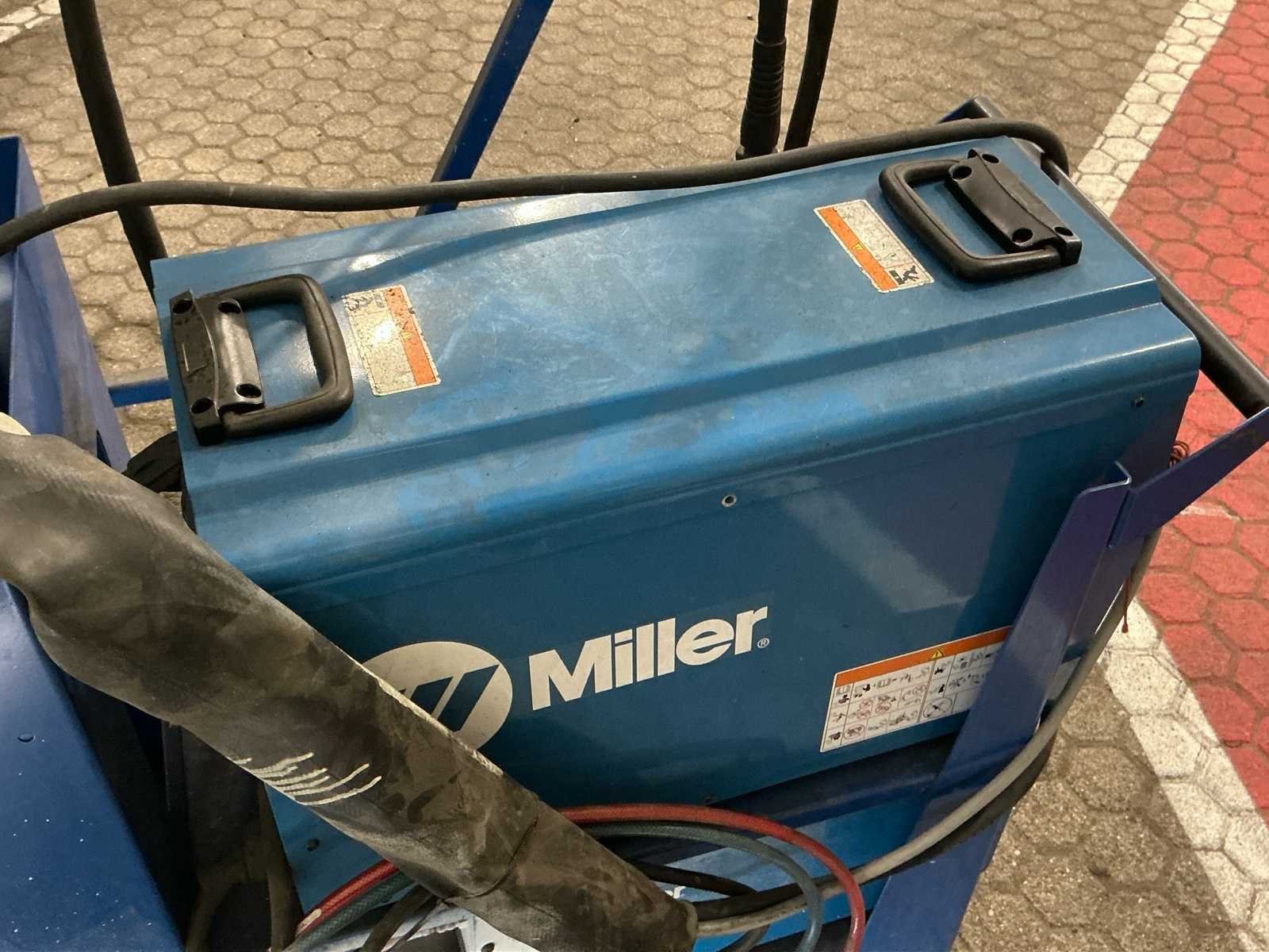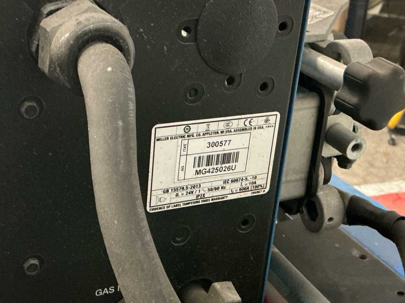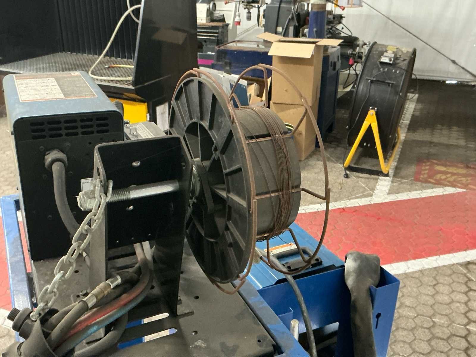 Miller XMT 450 MPa lasbron, bouwjaar 2012, vermogen 450A bij 100% inschakelduur, 3-fase aansluiting op 400V. Miller HydraCool 2 V.11S waterkoeler, bouwjaar 2014, voeding 115V, met koelcapaciteit van 1,76 kW bij 1 l/min @ 0,6 MPa. Draadaanvoerunit Miller (24V / 10A), bouwjaar vermoedelijk 2014–2015, type met synergische regeling en lastoorts inbegrepen. De set is compleet opgebouwd op een verrijdbare stalen trolley, inclusief lastoorts, CEE-aansluitstekker, slangenpakket en gasaansluiting. De draadaanvoerunit is voorzien van bedieningsconsole en is verbonden met de XMT-lasbron via industriële kabels. Digitale uitlezing op de lasbron en nauwkeurige regeling, geschikt voor MIG/MAG toepassingen met waterkoeling. HydraCool koeler beschikt over vulniveau-indicatie en separate netschakelaar. Nee Merk: Miller Type: XMT 450 MPa Bouwjaar: 2014 Serienummer: MG4125311U Max. lasvermogen: 450A Aansluiting: 400V Digitale uitlezing: true