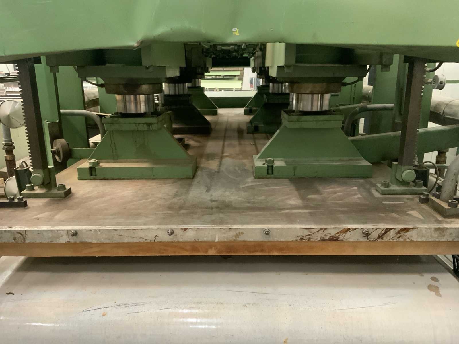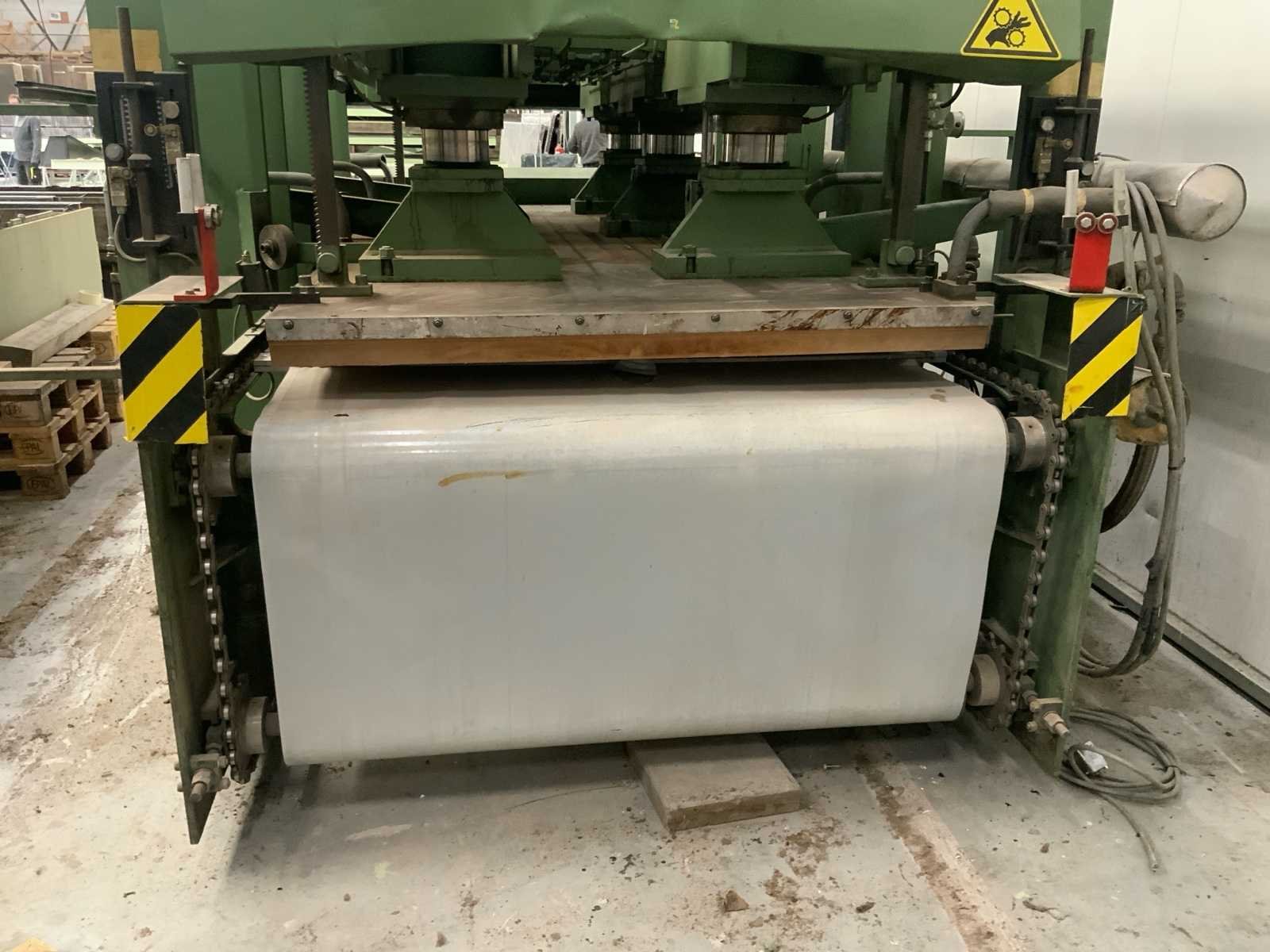 Robuuste industriële hydraulische warmpers voor het verlijmen en persen van fineer, panelen, deuren of multiplex-elementen. * Maximale persdruk: ca. 90 ton * Verwarming: olie- of elektrische verwarming via geïntegreerde platen * max werkstuk hoogte 150mm * vermogen 11Kw * inclusief besturing / pompkast (reeds gedemonteerd maar werkend weggezet) afmeting circa 320x240x460cm (hoogte is demontabel tot circa 235cm) * diverse documentatie aanwezig Nee Merk: Paul Ott KG Type: D99/270 Bouwjaar: 1977 Serienummer: 9981 Max. formaat l: 3200mm Max. formaat b: 1400mm Aantal cilinders: 6 Aansluiting: 380V Machinegewicht: 3500kg Afmeting l: 4500mm Afmeting b: 2750mm Afmeting h: 2500mm Leveringsvoorwaarden: Gratis op vrachtwagen