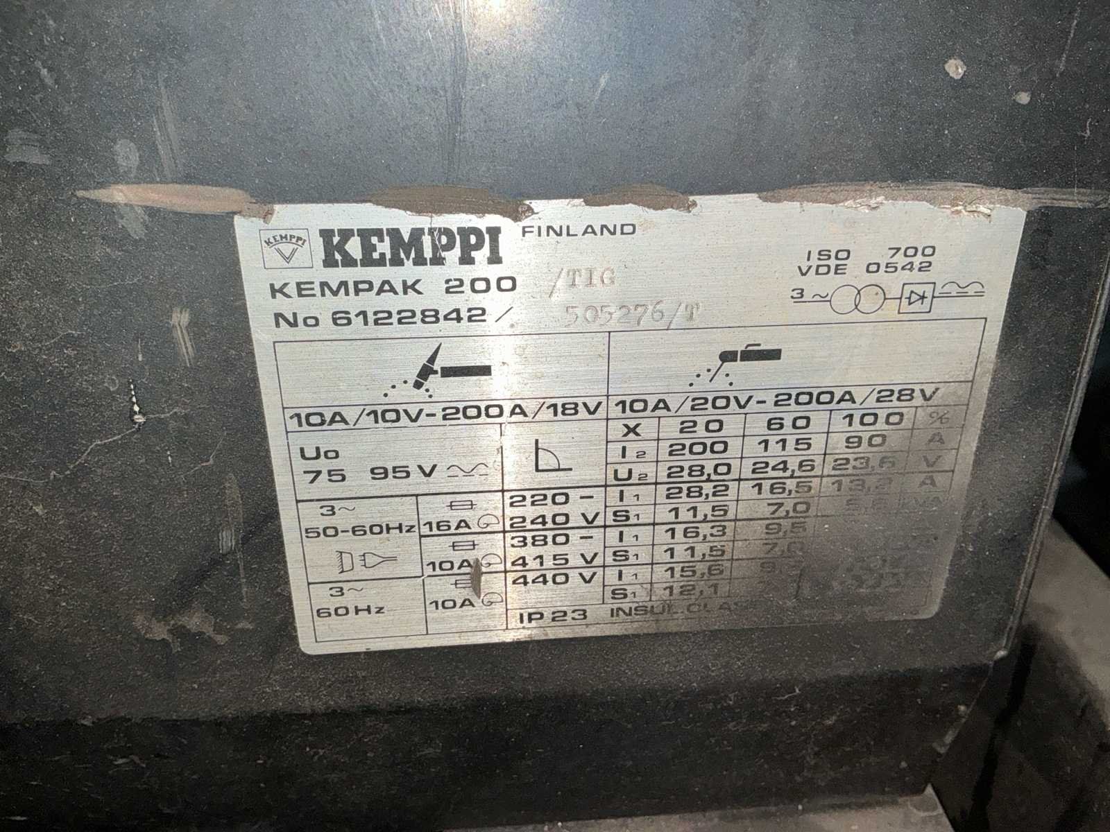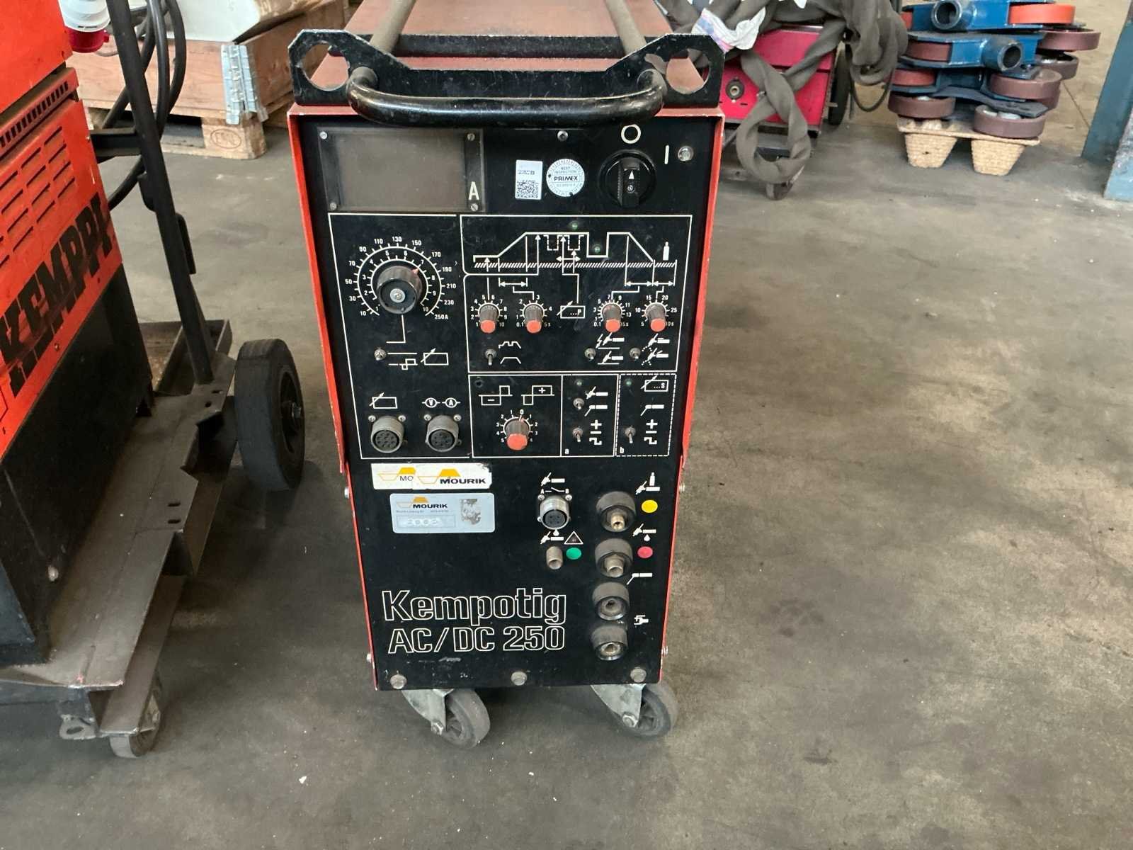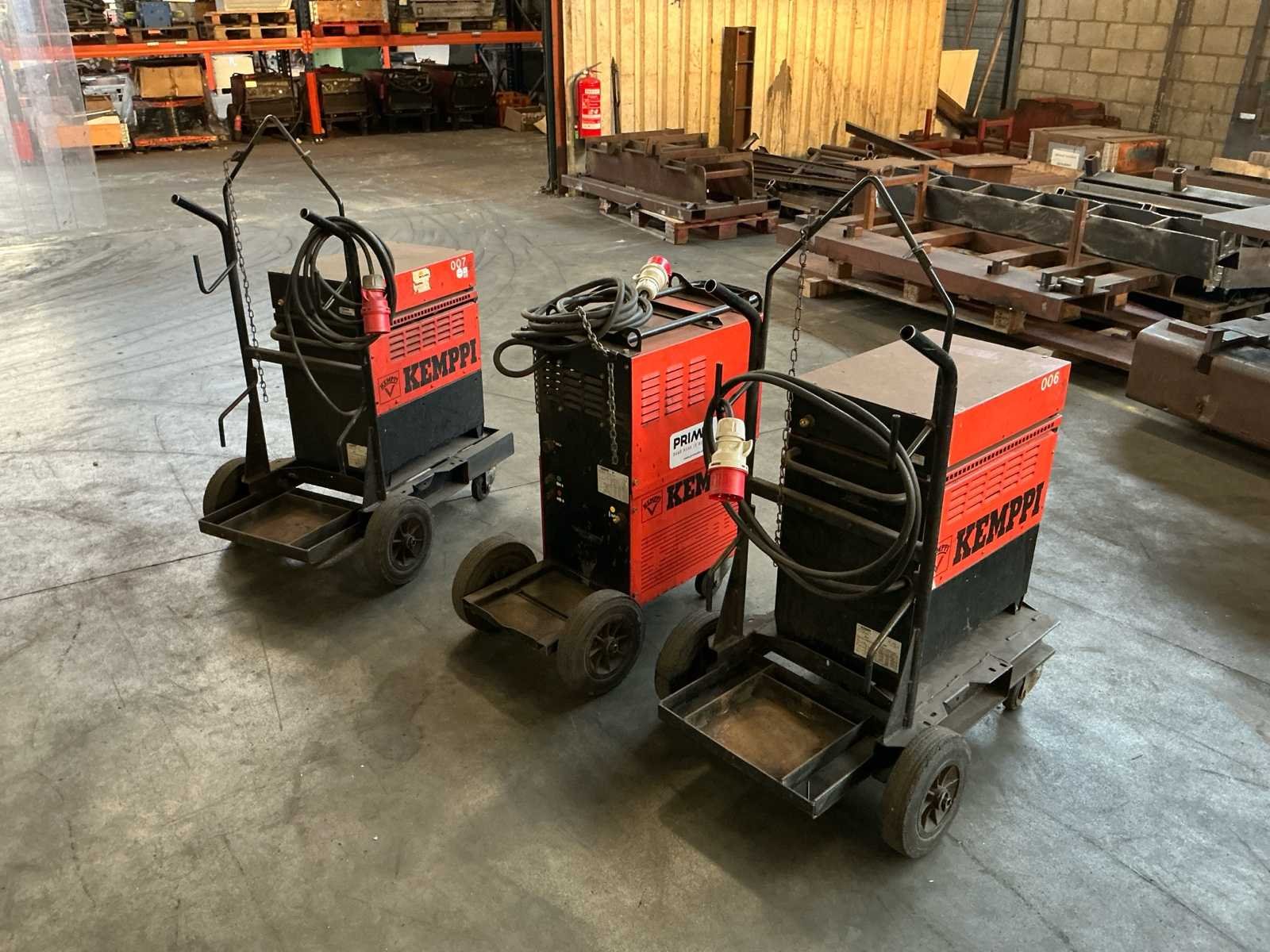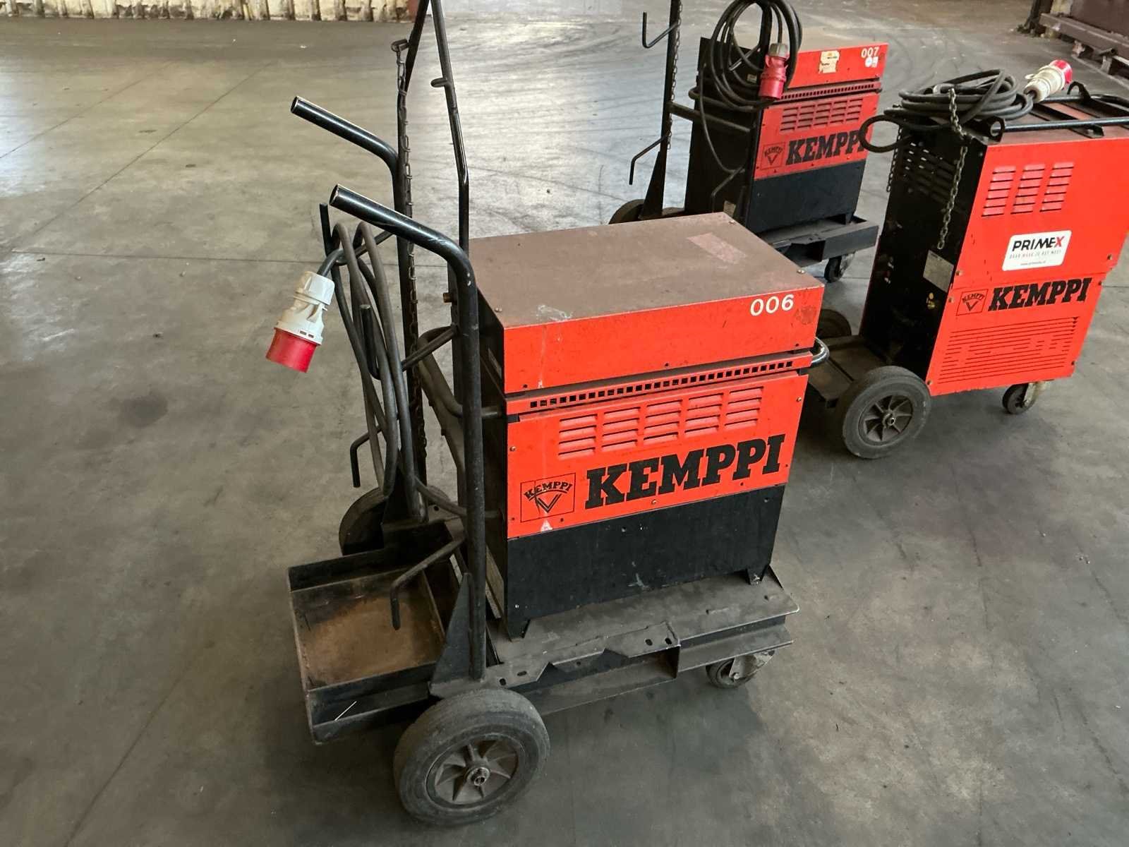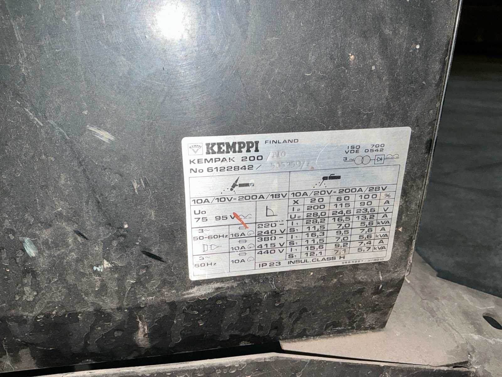 Bestaat uit: Set 3 lasapparaten, 2 stuks Kempi Kempak 200, compacte DC TIG-lasmachine (Gelijkstroom),5A - 200ampère kan leveren en geschikt is voor verschillende materialen zoals staal en roestvrij staal, met functies voor MMA-lassen (elektrode) en een relatief hoge inschakelduur (bijv. 35% bij 170A), 1 stuks Kempi Kempotig AC/DC 250, compacte TIG/MMA (Elektrode) dubbele stroombron, geschikt voor zowel AC (aluminium) als DC (staal, RVS) lassen, ontworpen voor veeleisend gebruik, met standaard instellingen voor diverse methoden, ontworpen voor aansluiting op 400 V (driefasig), maximale lasstroom van 250 A, inschakelduur (Duty Cycle): 30% bij 250 A, 60% bij 180 A, 100% bij 140 A, alle apparaten in werkende toestand, gemonteerd op robuste kar, voorzien van handvaten, en wielen. No Merk: Kempi Type: Kempak 200 Draadaanvoerunit: true