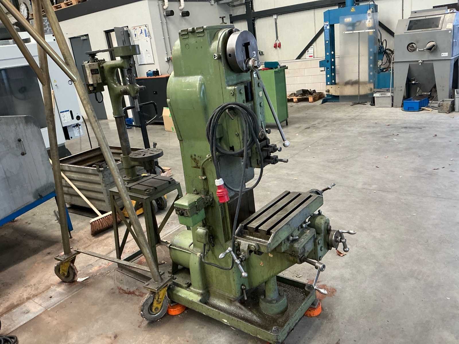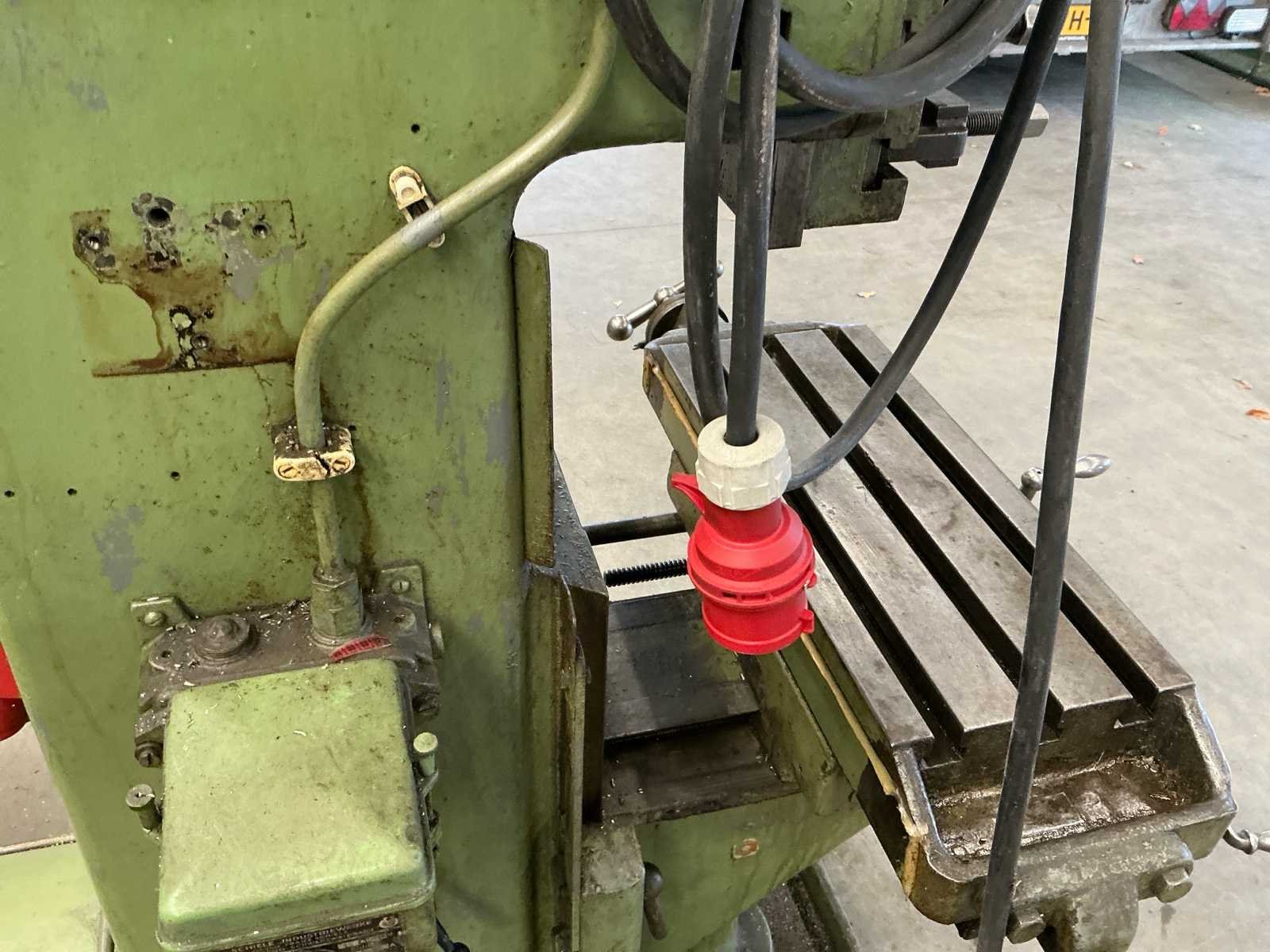 Voorzien van: De Schiele Industriewerke KM 15 III is een Duitse kolomboormachine uit ca. 1965–1980 met een 380 V / 50 Hz driefasemotor van circa 1,1–1,5 kW, een toerentalbereik van ongeveer 150–3.000 omw/min, maximale boordiameter van 15 mm in staal, boorspindel met conus B16 of MK2, tafelafmeting van circa 300 × 300 mm, totale hoogte van ongeveer 1,7 m, gewicht van 150–200 kg Nee Merk: Schiele Industriewerke Type: KM 15 III Serienummer: D23013 Boorcapaciteit: 15mm Tafel afmeting l: 220mm Tafel afmeting b: 500mm