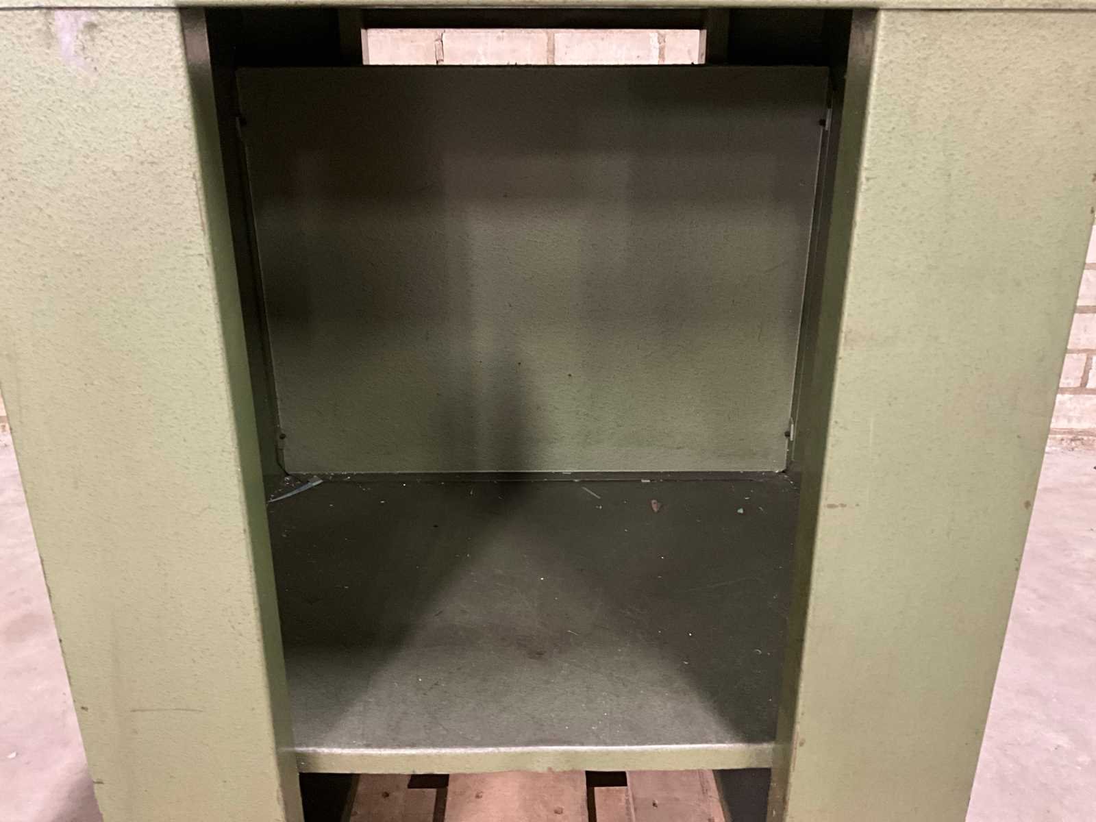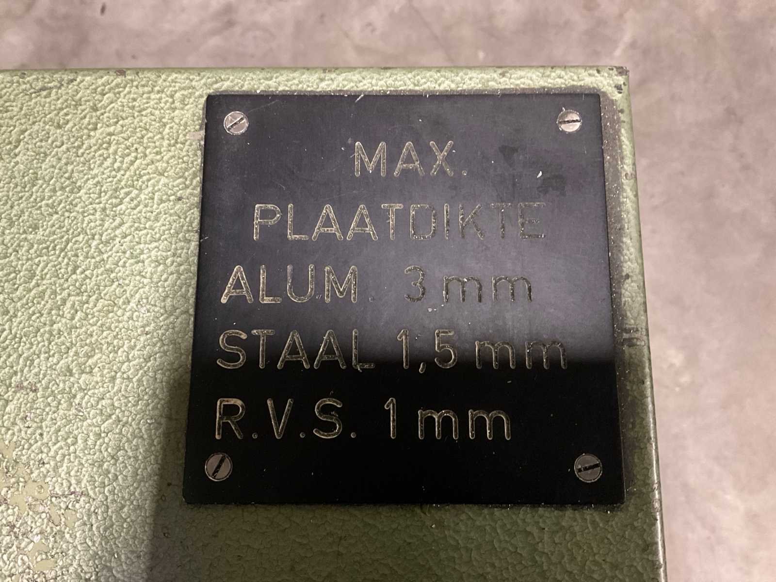 Maximale plaatdikte 3mm aluminium, 1,5mm staal, 1mm RVS; voorzien van: handmatige bediening; LET OP: Koper is zelf verantwoordelijk voor het uithuizen van het kavel. Er is een heftruck aanwezig! Nee Merk: Gerver B.V. Type: GH-1 Bouwjaar: 1978 Serienummer: 11031 Totale afmeting L: 500mm Totale afmeting Breedte: 560mm Totale afmeting Hoogte: 1500mm