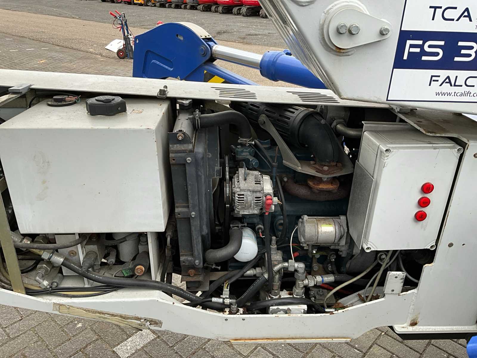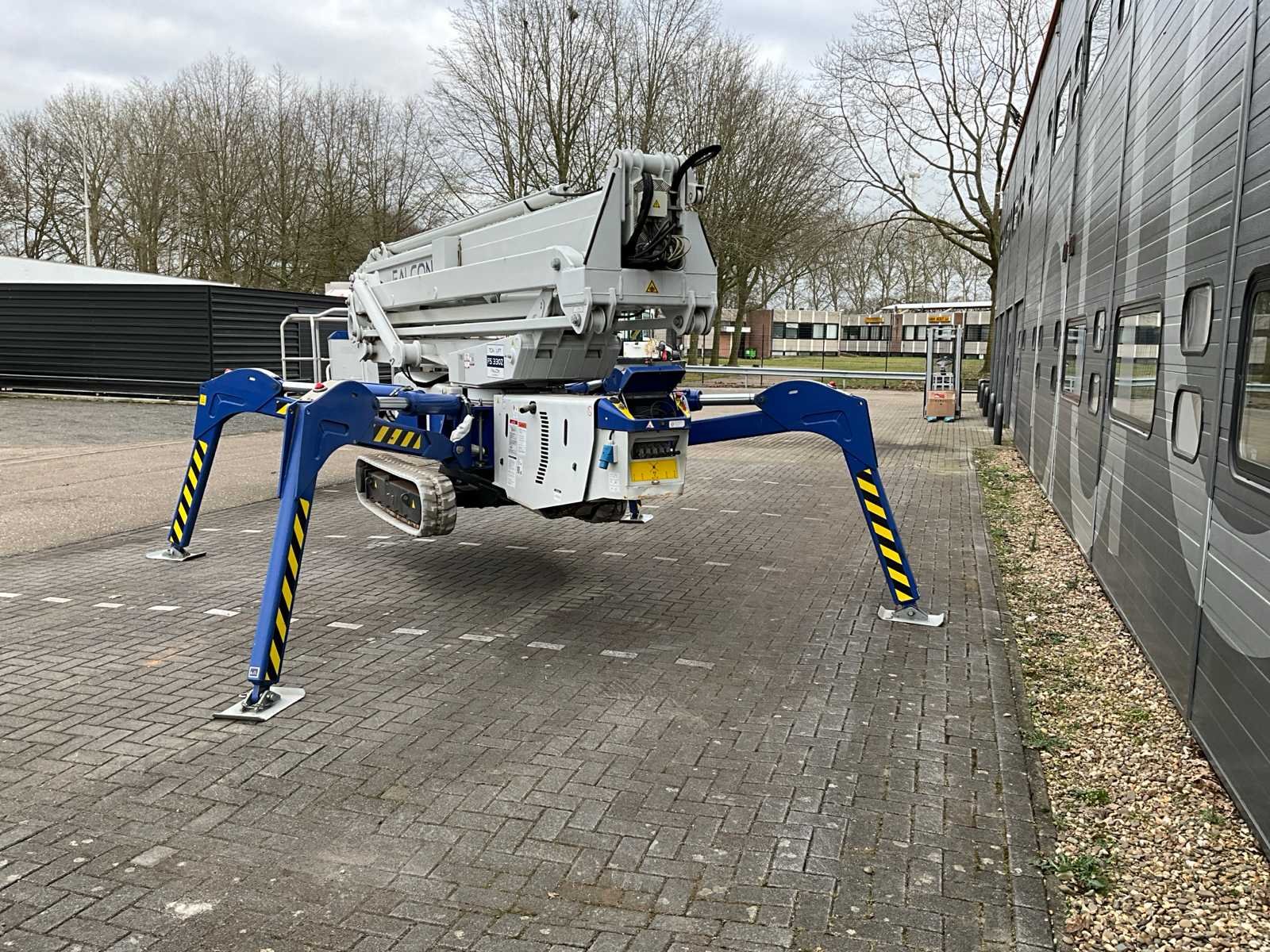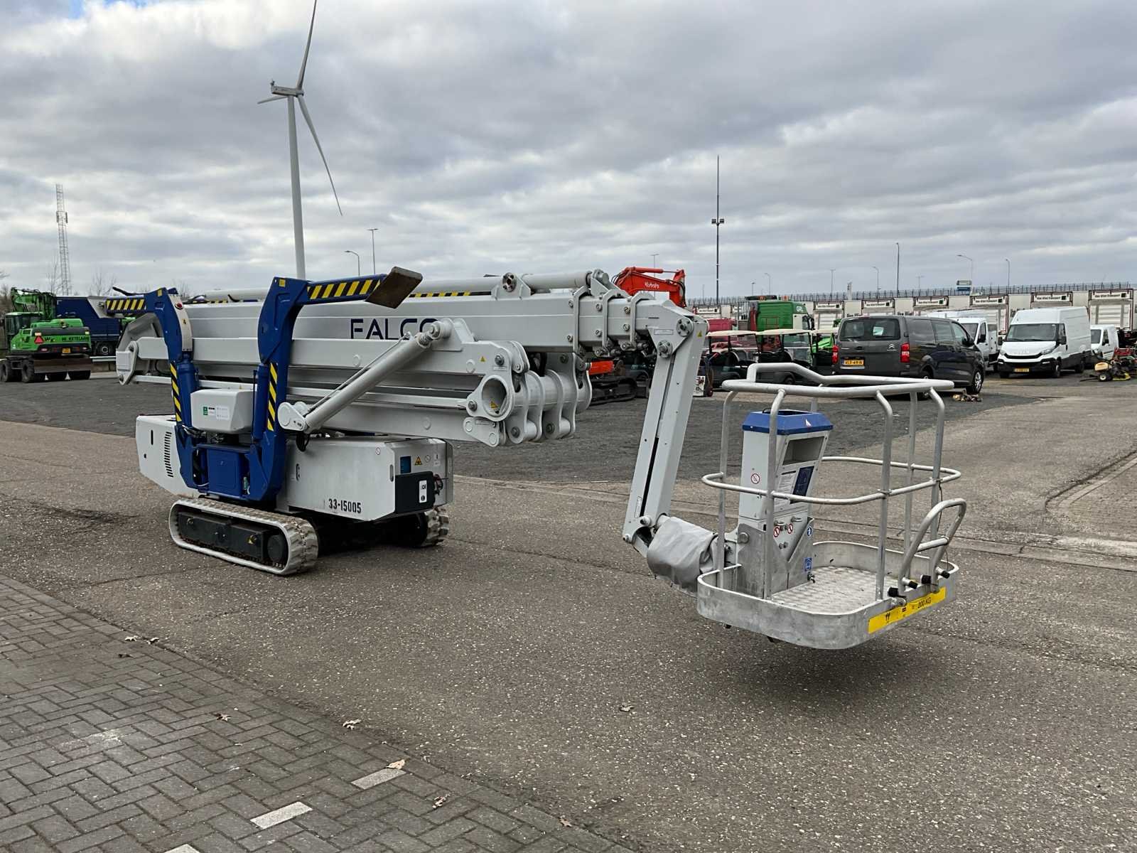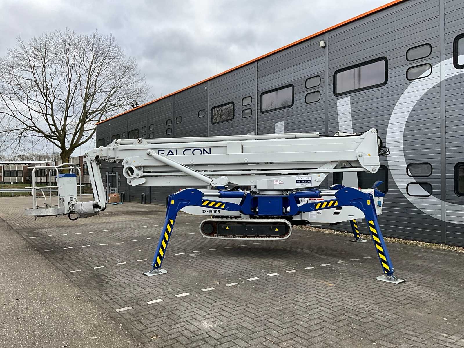 Voorzien van, 3 cyl Kubota Diesel motor, 4x stempels met automatische waterpas afstempeling, Jip-arm 110Gr, 375Gr rotatie, 90Gr werkbak rotatie, Hydraulisch verstelbaar rupsonderstel van 110-150cm, non marking tracks, draadloze afstandbediening Nee Merk: Falcon Type: Spider FS330Z Hybride 33mtr Bouwjaar: 2015 Serienummer: 15005 Diesel: true Elektrisch: true Motorvermogen (kW): 21.7kW Telescoop hoogwerker: true Knikarm hoogwerker: true Werkhoogte: 33000mm Horizontale rijkwijdte: 19000mm Plateau afm. l: 750mm Plateau afm. b: 1400mm Afgelezen urenstand: 1410 Eigen gewicht: 6030kg Totale afmeting L: 73000mm Totale afmeting Breedte: 1250mm Totale afmeting Hoogte: 1990mm