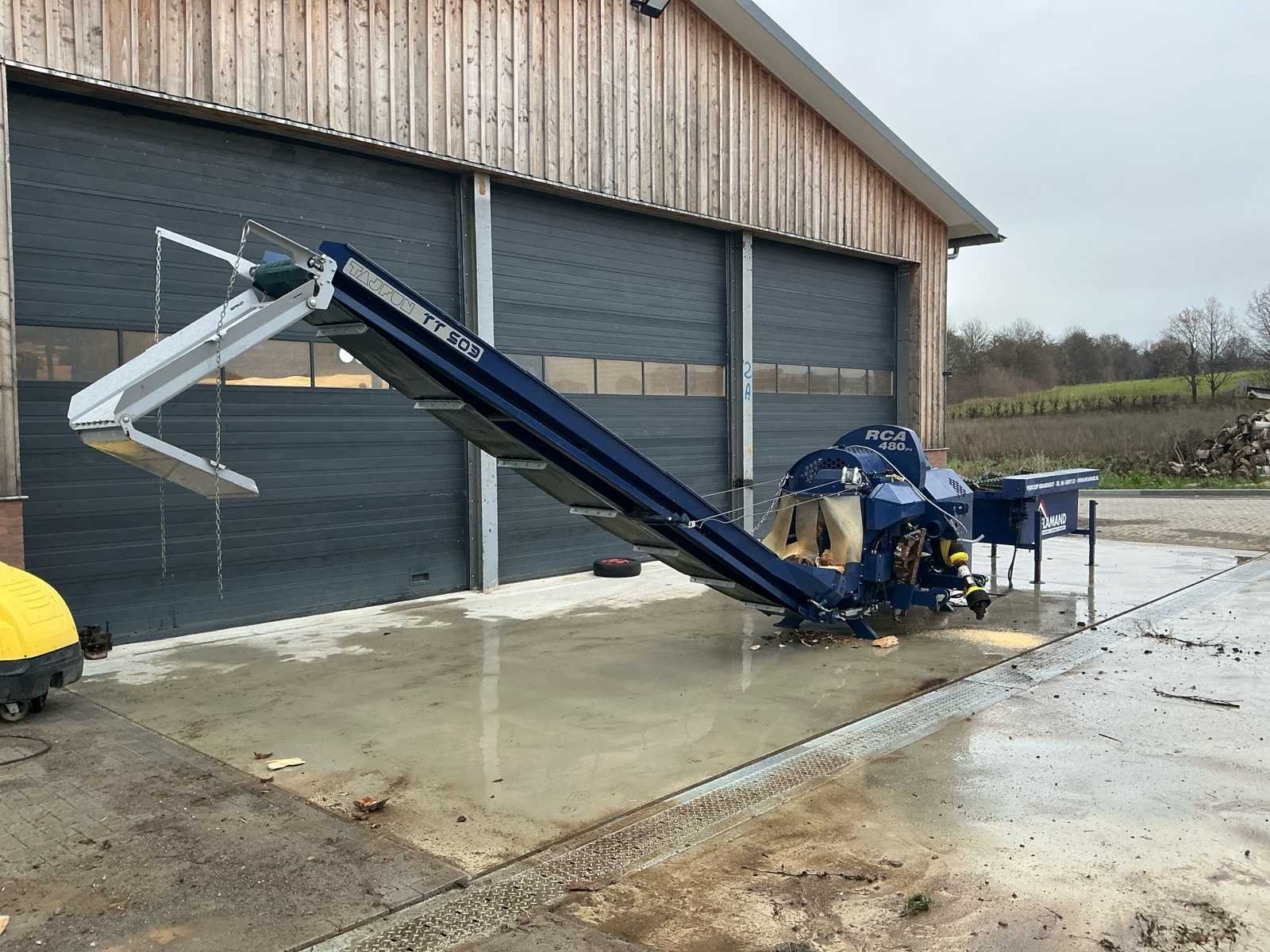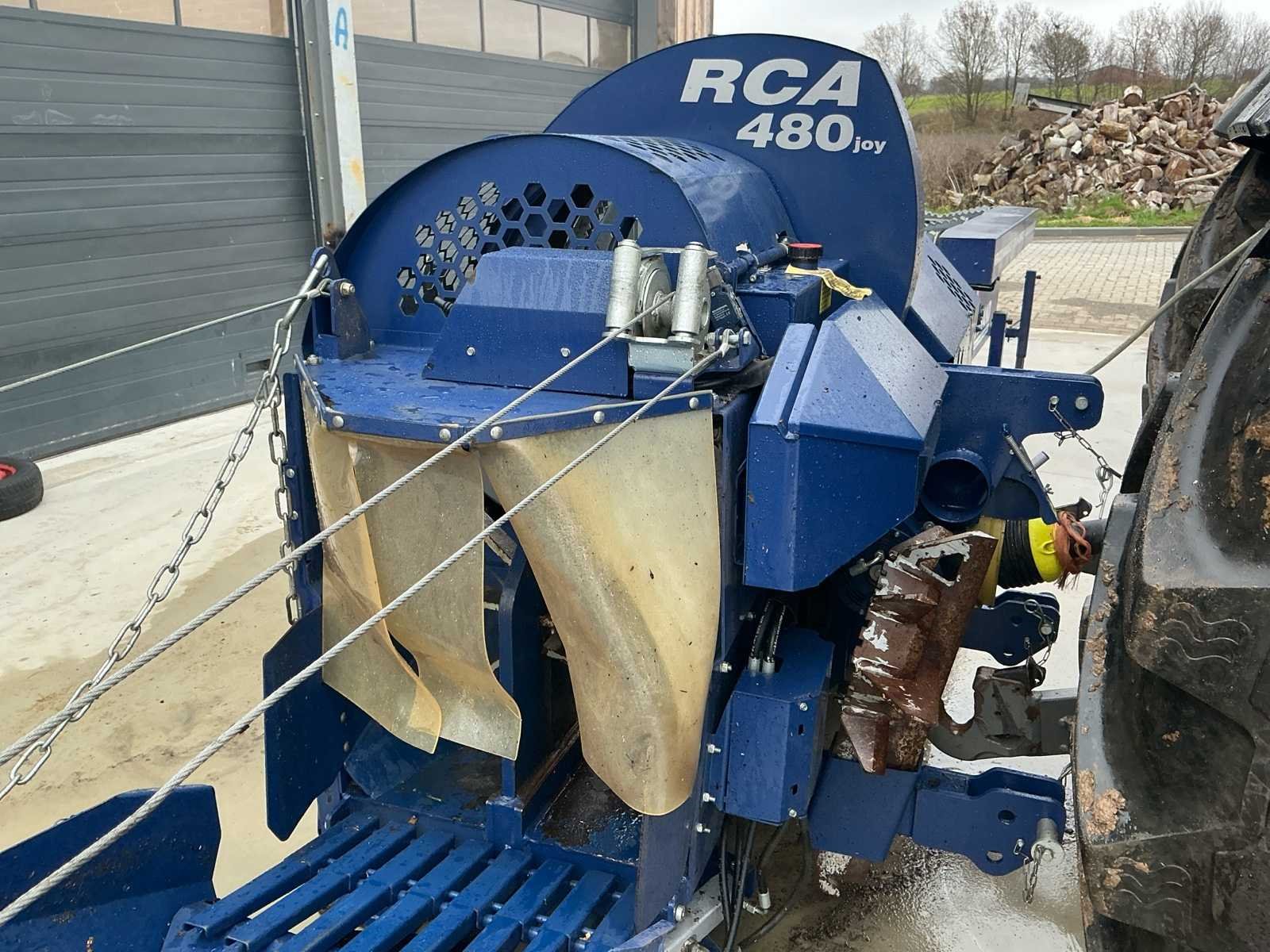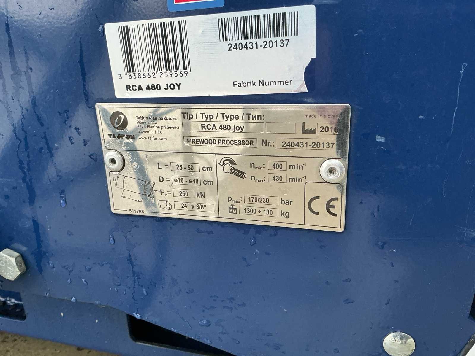Bestaat uit: complete opstelling, eigenbouw hydraulisch aangedreven aanvoerframe, maximale diameter van de boomstam 5–48 cm, lengte van de gezaagde boomstam 25–50 cm, splijtkracht 250 kN, twee splijtsnelheden, zaagblad Oregon 24 inch, b = 1,5 mm, ketting Oregon DuraCutTM 3/8”, 42 tanden, b = 0,058” (1,5 mm), vereist tractorvermogen 30 kW (transport - 70–80 kW), toerental aftakas min.: 400 min-1, max.: 430 min-1 Nee Merk: Tajfun Type: RCA 480 joy Bouwjaar: 2016 Serienummer: 240431-20137 Hydraulisch: true