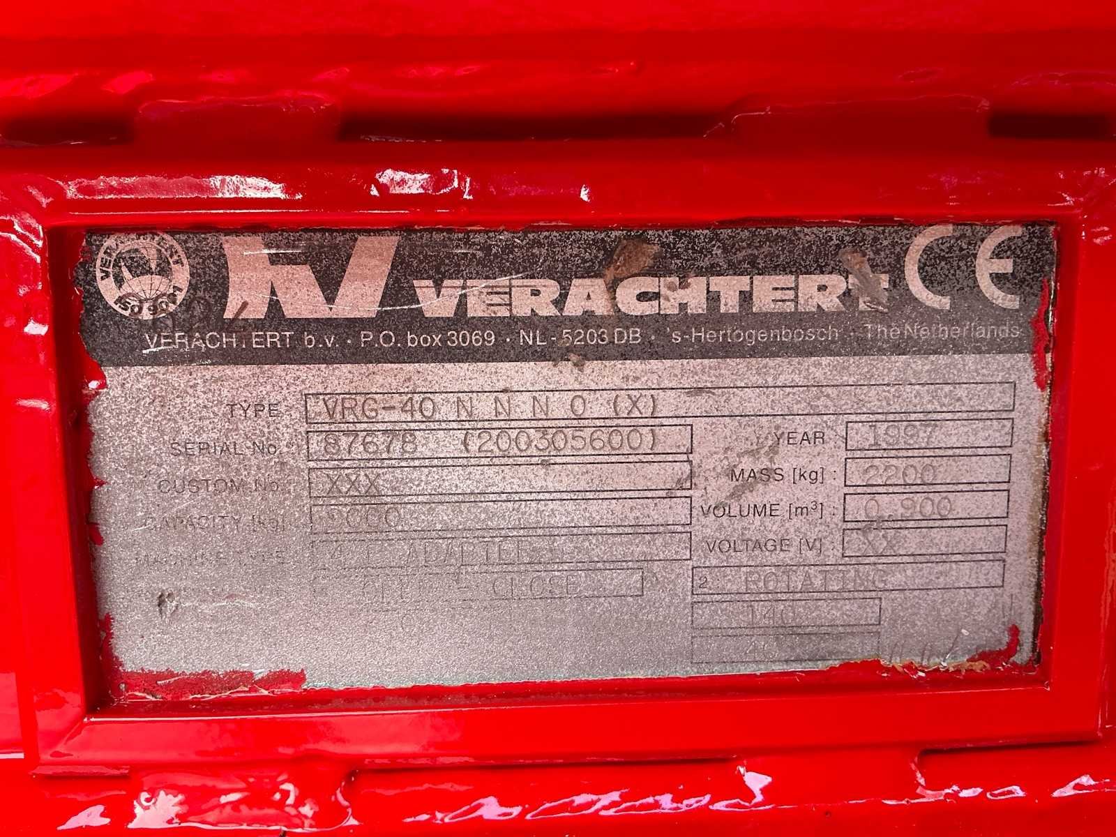 Voorzien van: net een nieuwe laag verf, CW45 BREDE AANSLUITING! De Verachtert VRG-40N is een 2200 kg zware hydraulisch roterende sloop- en sorteergrijper met een openingsbreedte van 210 cm, een volume van 0,9 m³, gebouwd in 1997 en geschikt voor graafmachines van circa 35–50 ton, Type VRG-40 NNNO(X) No Merk: Verachtert Type: VRG-40 Bouwjaar: 1997 Serienummer: 87678 (200305600) Snelwissel: true Eigen gewicht: 2200kg Totale afmeting L: 1360mm Totale afmeting Breedte: 2100mm Totale afmeting Hoogte: 1800mm
