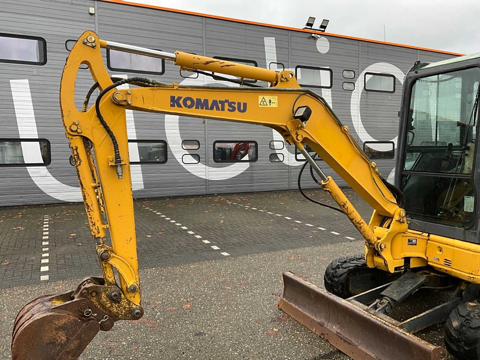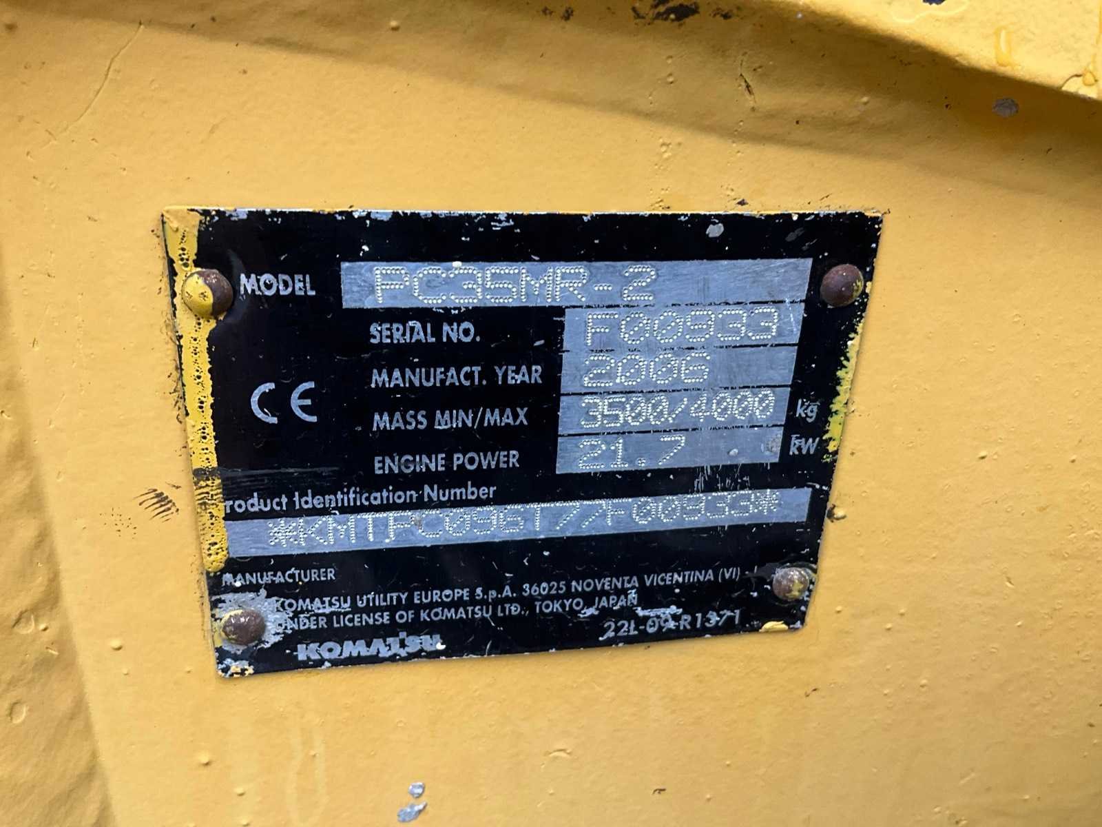Dieplepelbak 400mm, snelwissel met pennen, extra hydraulische functie, zwenkgiek, schuifblad, Nee Merk: Komatsu Type: PC35MR-2 Bouwjaar: 2006 Serienummer: F00933 Merk motor: Yanmar 3D88E Motorvermogen (kW): 22kW Aantal cilinders: 3 Brandstof: Diesel Bedrijfsgewicht: 3750kg Met graafbak: true Graafbak afm. b: 400mm Rups breedte: 300mm Cabine: true Afgelezen urenstand: 8776 Totale afmeting L: 5000mm Totale afmeting Breedte: 1800mm Totale afmeting Hoogte: 2600mm