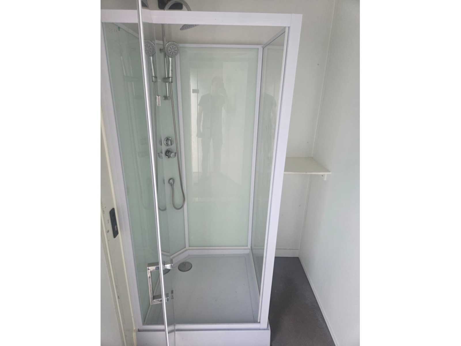 - 20ft highcube container met extra breedte. Inhoud: 4x aparte ruime douche units, Voorzien van: - Aan te sluiten op 400 volt, - rioolafvoer, - wateraanvoer, - luchtafzuigingen, Container rust op 2 H balken, Meterkast met aardlekschakelaar en 5x 230 volt en 1x 400 volt automaten inbegrepen. 2x stopcontacten aanwezig in de container, Afmetingen: Lengte: 606 cm Breedte: 300 cm Hoogte: 305 cm Nee Totale afmeting L: 6060mm Totale afmeting Breedte: 3000mm Totale afmeting Hoogte: 3050mm
