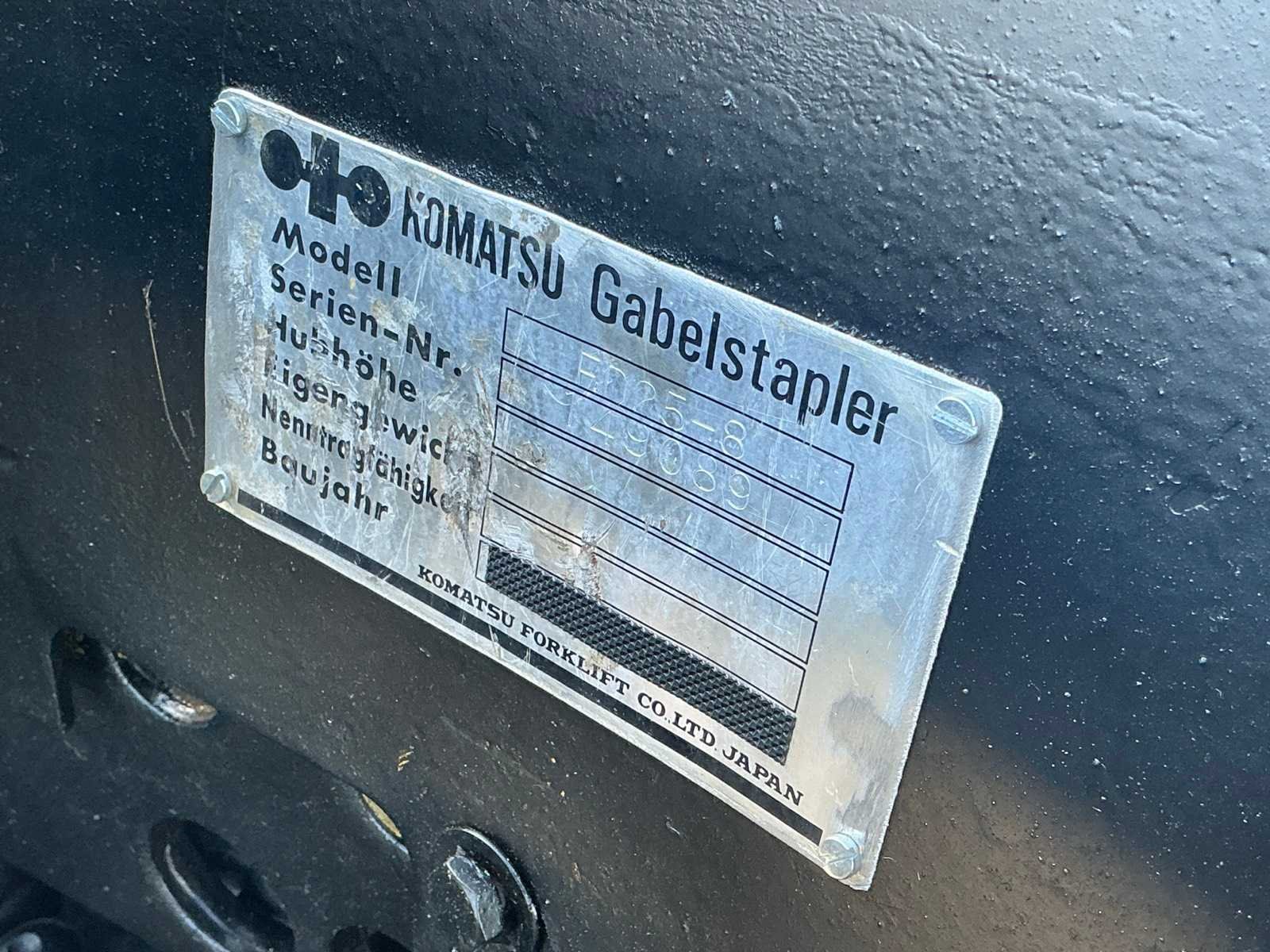 Motor loopt en heft maar rijdt niet. (Breuk in plaat koppel omvormer) voorzien van 3e functie, Nee Merk: Komatsu Type: FD25-8 Serienummer: 149089 Brandstof: Diesel Mast: Duplex Soort band: Volrubber banden Aantal wielen: 4 Afgelezen urenstand: 5492 Duplex mast: true Hefvermogen: 2500kg Lepellengte: 1050mm Hefhoogte: 3700mm Vol rubber banden: true Minimale doorrijhoogte: 2100mm Totale afmeting L: 2550mm Totale afmeting Breedte: 1200mm Totale afmeting Hoogte: 2200mm