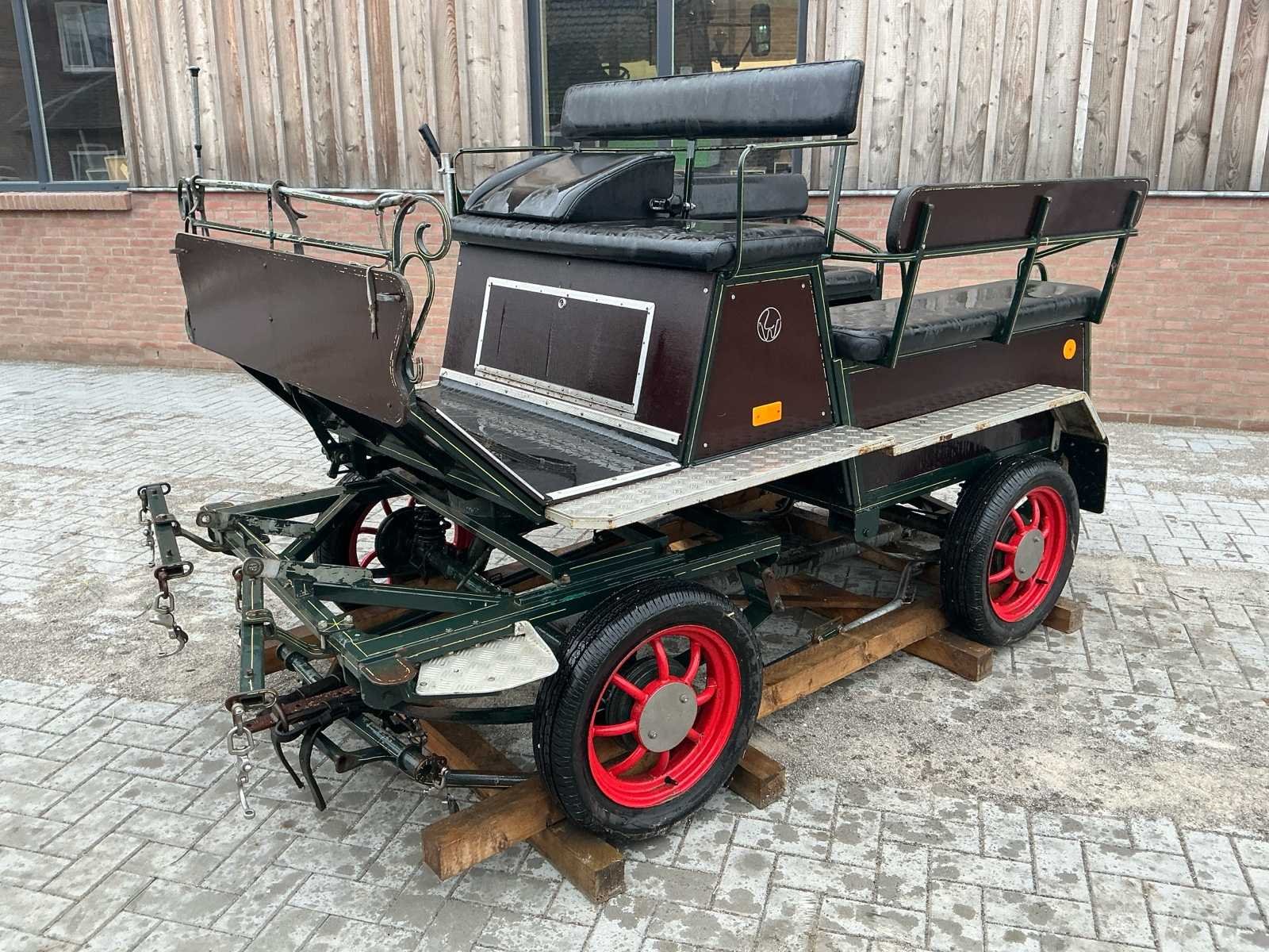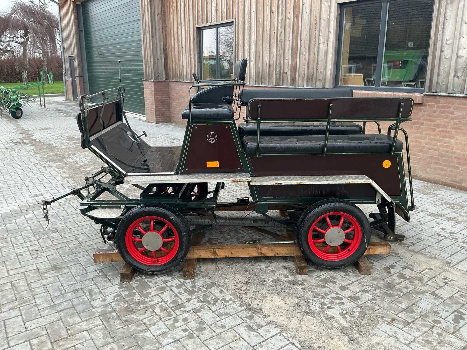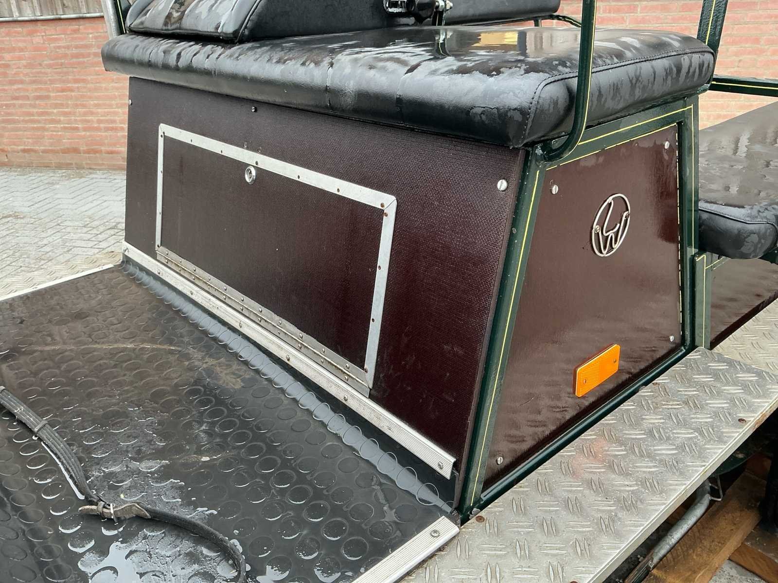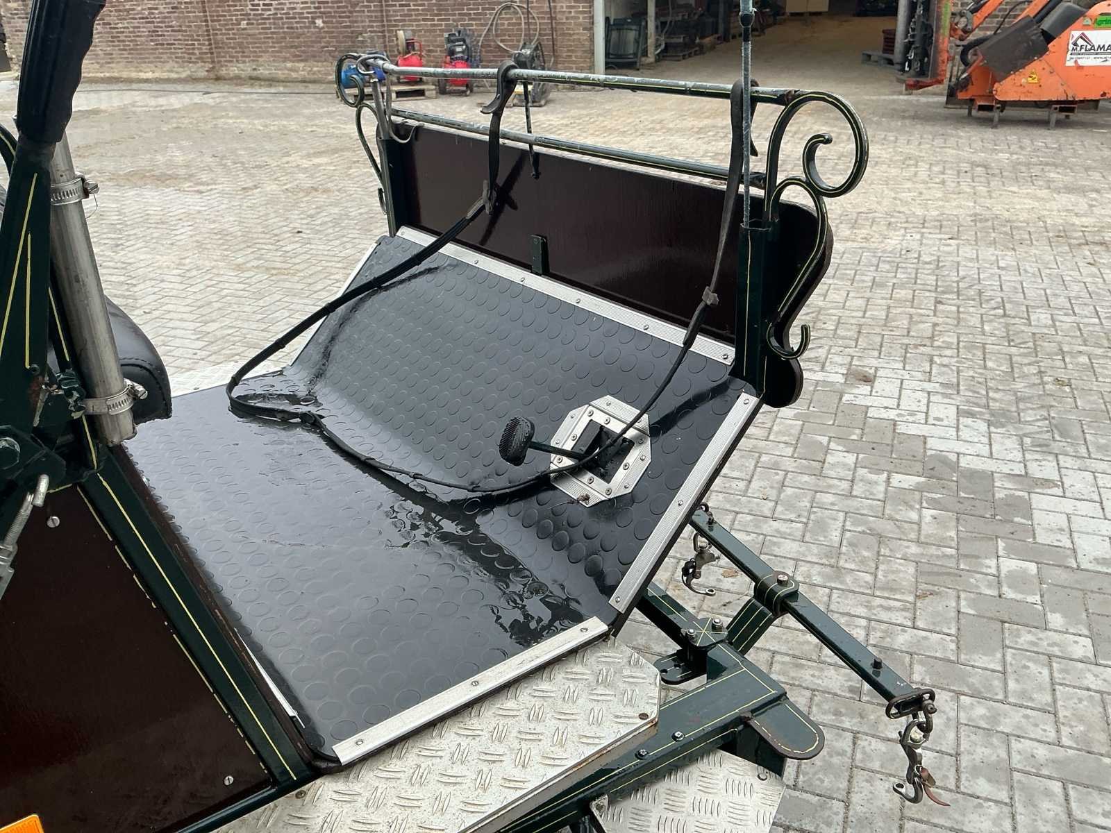 Voorzien van: Merk : enkel en Tweespan, wielmaat 135/70R15, voor en achter geremd, voor en achter geveerd, opbergbakken onder voorbank, achterbanken 120cm , bokzithoogte circa 1300mm, spoorbreedte 1300, kleur : donker groen, handrem, banken met rugleuning, verstelbare dissel, aluminium antislip opstappen, reflectoren, voetrem, verhoogd zitkussen. Nee Merk: Onbekend Kleur: Groen Lengte: 3000cm Breedte: 1450cm Hoogte: 1650cm