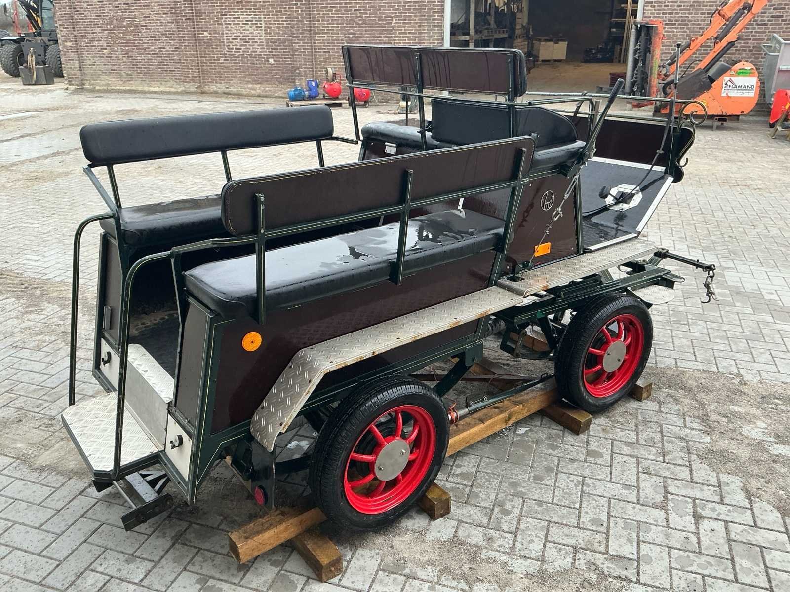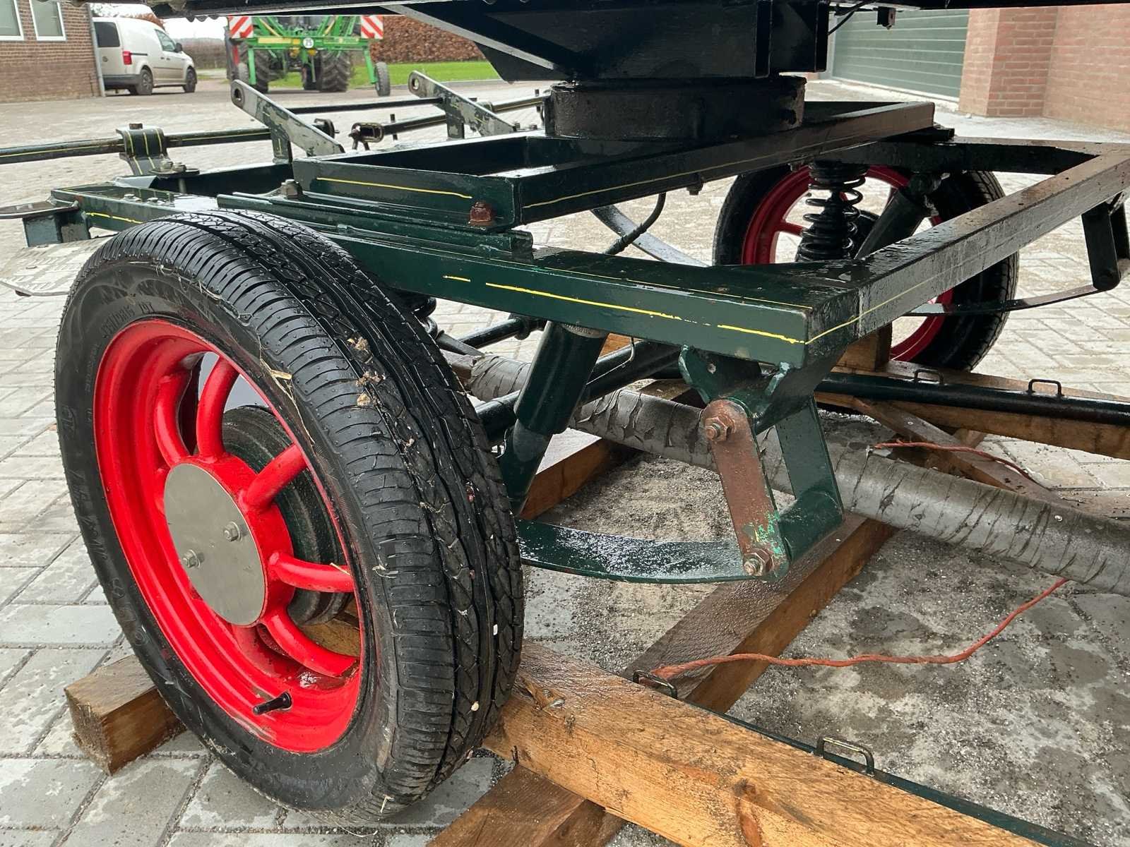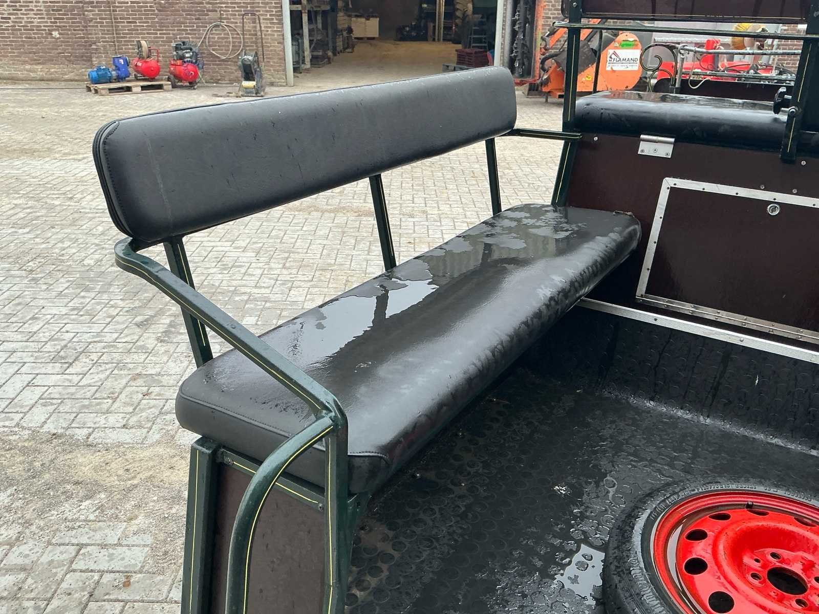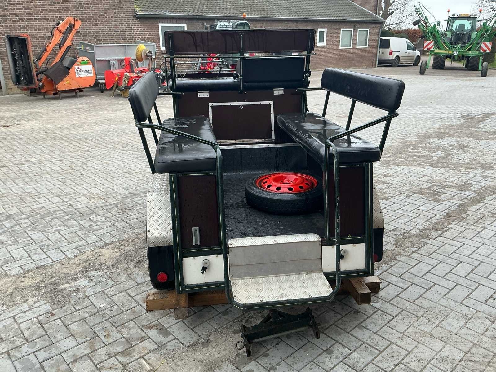 Voorzien van: Merk : enkel en Tweespan, wielmaat 135/70R15, voor en achter geremd, voor en achter geveerd, opbergbakken onder voorbank, achterbanken 120cm , bokzithoogte circa 1300mm, spoorbreedte 1300, kleur : donker groen, handrem, banken met rugleuning, verstelbare dissel, aluminium antislip opstappen, reflectoren, voetrem, verhoogd zitkussen. Nee Merk: Onbekend Kleur: Groen Lengte: 3000cm Breedte: 1450cm Hoogte: 1650cm