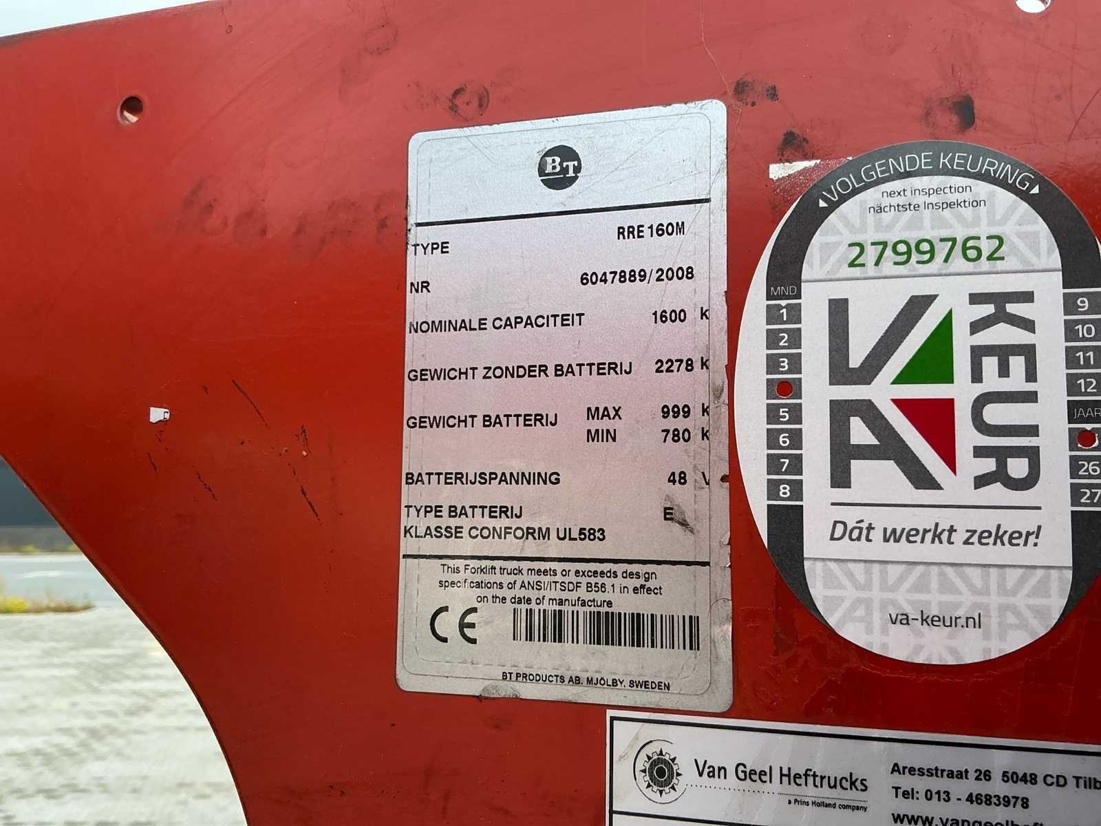 Nee Merk: BT Type: RRE 160M Bouwjaar: 2008 Serienummer: 6047889 Brandstof: Elektrisch Aantal wielen: 3 Afgelezen urenstand: 9531 Accu lader: true Free-lift: true Side-shift: true Triple mast: false Eigen gewicht: 2278kg Hefvermogen: 1600kg Lepellengte: 1000mm Max. hefhoogte: 6300mm Minimale doorrijhoogte: 2700mm Totale afmeting L: 2400mm Totale afmeting Breedte: 1100mm Totale afmeting Hoogte: 2650mm Elektrisch: true