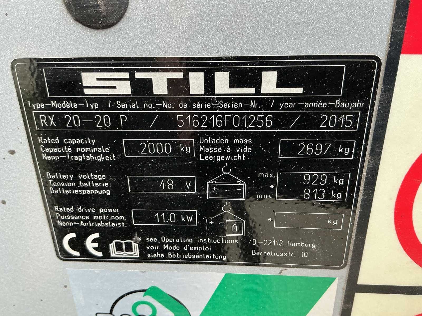 No Merk: STILL Type: RX20-20 Bouwjaar: 2015 Serienummer: 516216F01256 Aantal wielen: 4 Afgelezen urenstand: 13058 Free-lift: true Side-shift: true Triple mast: true Hefvermogen: 2000kg Lepellengte: 1600mm Hefhoogte: 4765mm Minimale doorrijhoogte: 2160mm