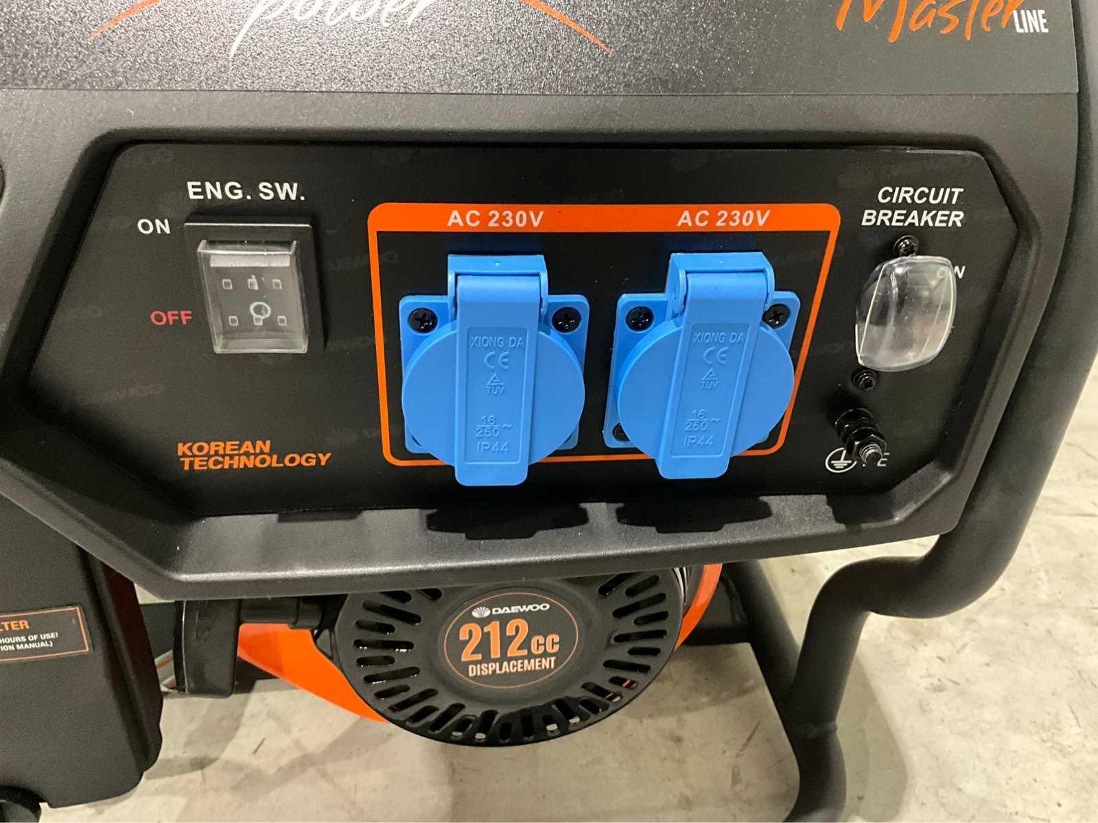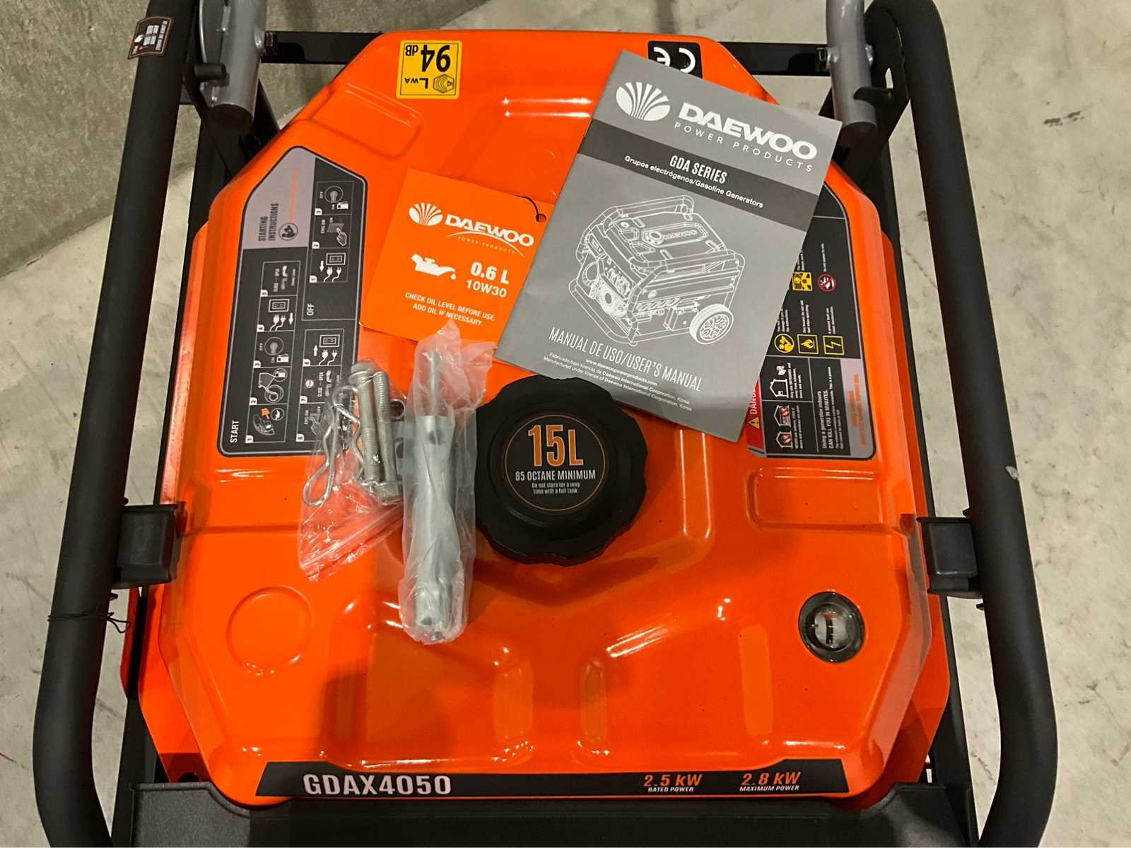 Ongebruikt , uitgangen 2 x 230V , 15 liter , rated power 2.5 kw , 2.8 kw , 230V , ac current 13.6A , quality class A , max temperatuur ambient 40C , Nee Merk: Daewoo Type: GDAX 4050 Bouwjaar: 2025 Afgelezen urenstand: 1 Handboek aanwezig: true Machinegewicht: 43kg Totale afmeting L: 6mm Totale afmeting Breedte: 490mm Totale afmeting Hoogte: 475mm