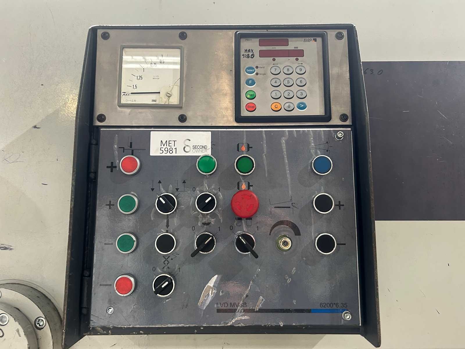 No Merk: LVD Type: MVSB 62/6,35 Serienummer: 13707 Snijlengte: 6200mm Max. plaatdikte: 6mm Achteraanslag elektrisch: true Achteraanslag bereik: 1000mm Besturing, merk, type: ELGO Motorvermogen (kW): 11kW Machinegewicht: 17500kg GS Code: 84.623.300