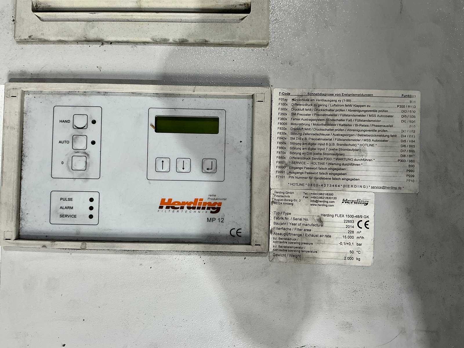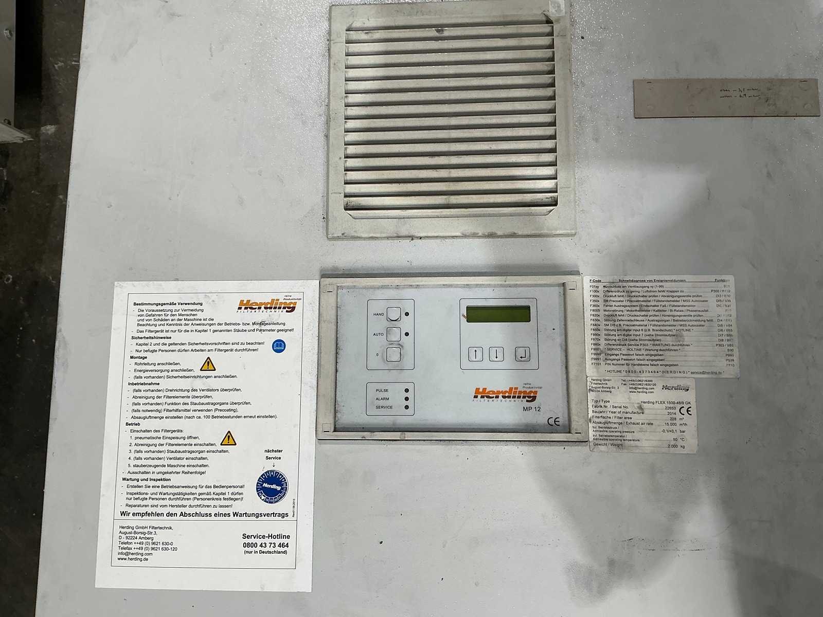 Filter-area: 228m2 Capacity: 15.000 m3/h Control type: Herding MP 12 No Merk: Herding Type: FLEX 1500-48/9 GK Bouwjaar: 2014 Serienummer: 22653 Machinegewicht: 2500kg Afmeting l: 5000mm Afmeting b: 2500mm Afmeting h: 2500mm GS Code: 84.213.925