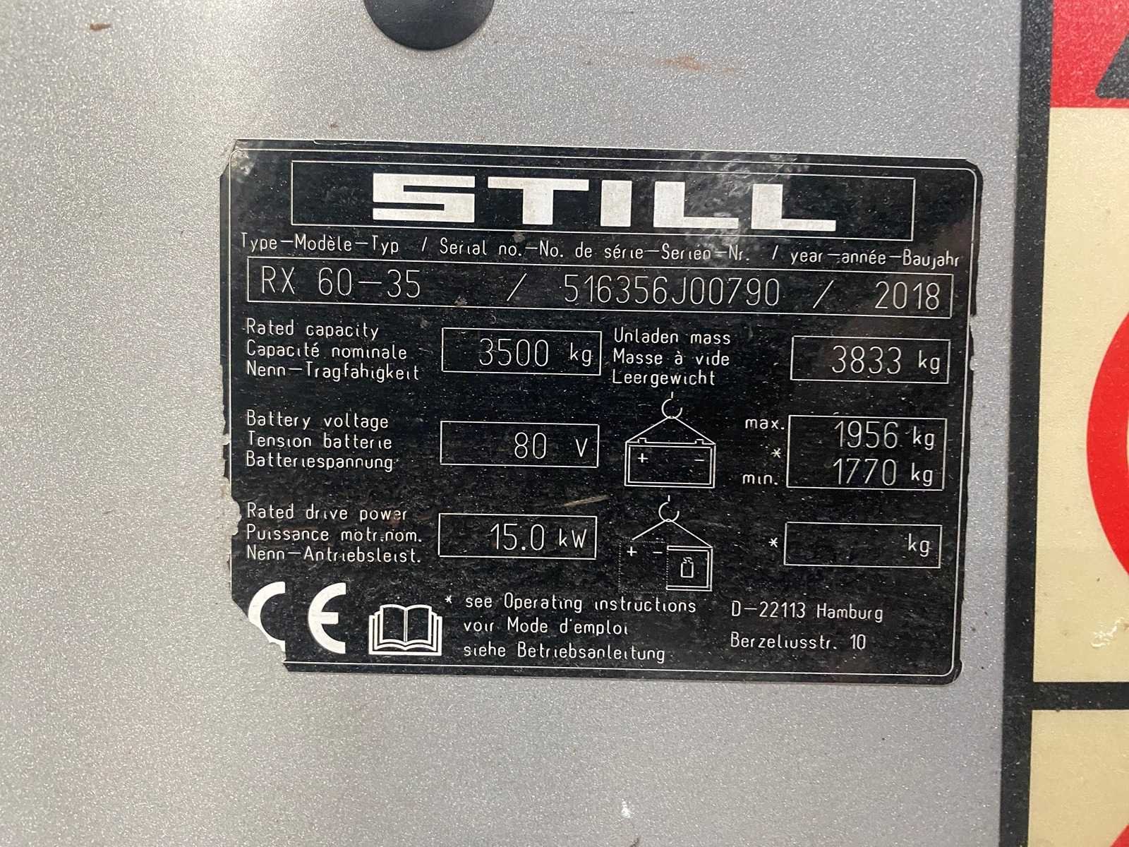 3de+4de ventiel tot vorkenbord No Merk: Still Type: RX60-35 Bouwjaar: 2018 Serienummer: 516356J00790 Brandstof: Elektrisch Soort band: NM Aantal wielen: 4 Afgelezen urenstand: 9872 Accu lader: true Free-lift: true Triple mast: true Eigen gewicht: 5540kg Hefvermogen: 3500kg Lepellengte: 1200mm Hefhoogte: 5470mm Minimale doorrijhoogte: 2460mm Totale afmeting L: 2550mm Totale afmeting Breedte: 1300mm Totale afmeting Hoogte: 2460mm