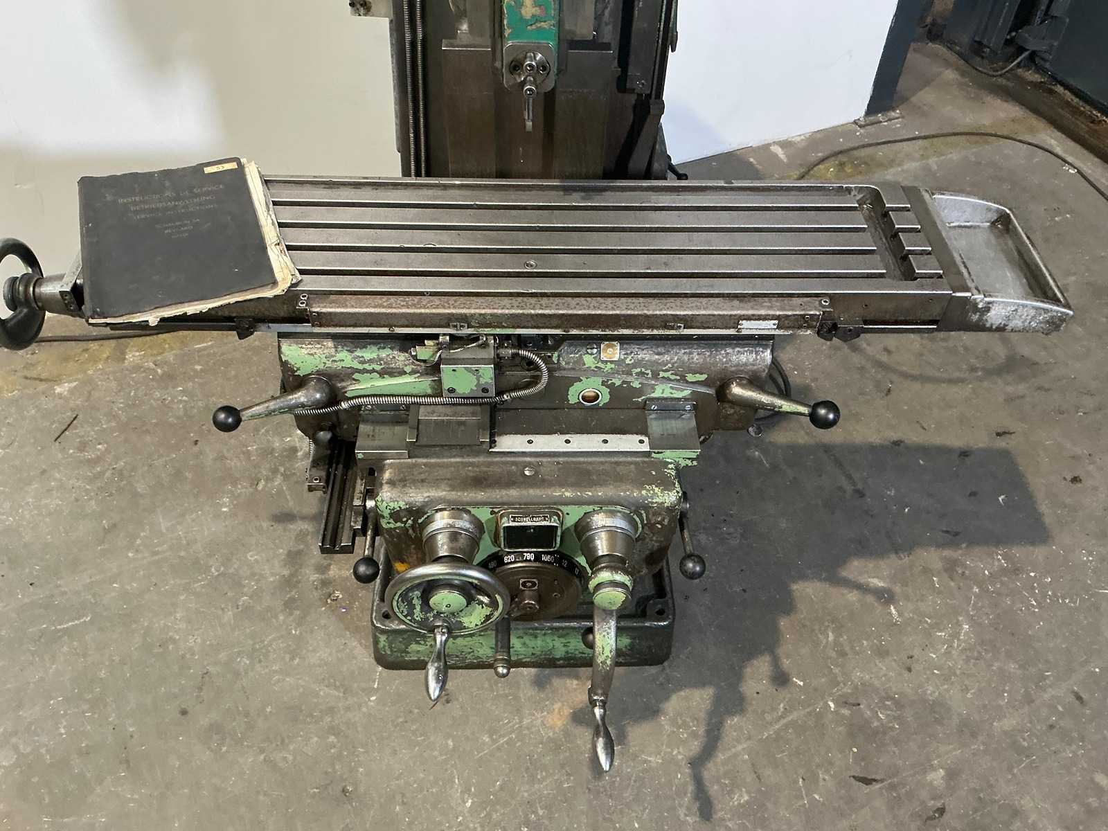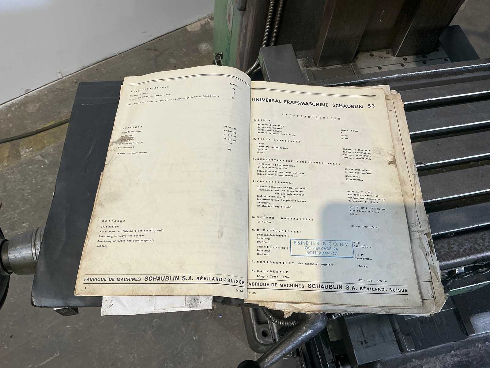 Without a stinger No Merk: Schaublin Type: 53 Verplaatsing x-as: 700mm Verplaatsing y-as: 550mm Verplaatsing z-as: 430mm Opname iso: ISO30 Snelheid van n =: 38rpm Snelheid tot n =: 1500rpm T-gleuf opspantafelafmeting L: 1100mm T-gleuf opspantafelafmeting B: 255mm Motorvermogen (kW): 4kW Machinegewicht: 1650kg Afmeting l: 1800mm Afmeting b: 1600mm Afmeting h: 1700mm GS Code: 84.596.990
