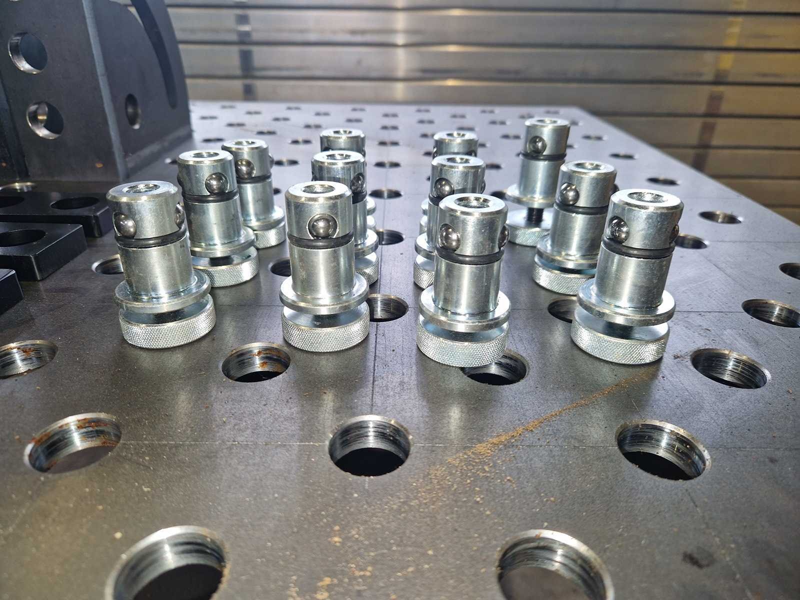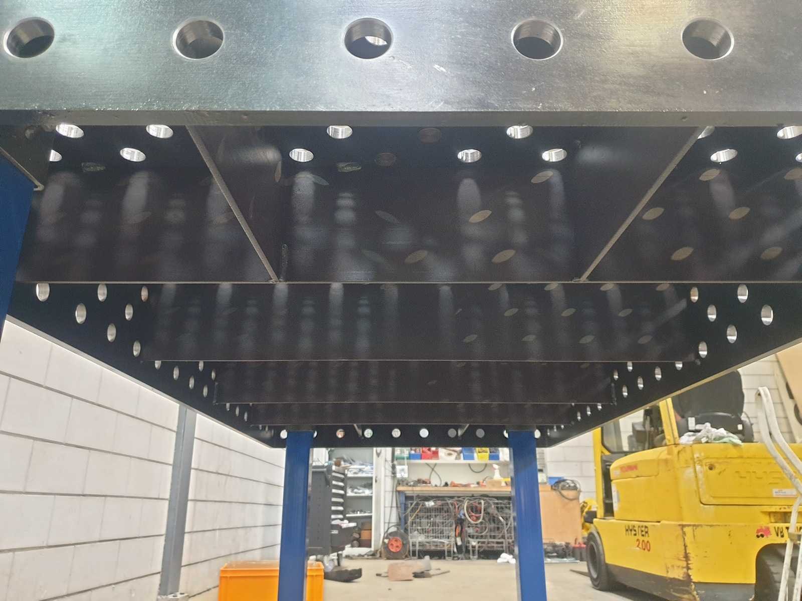 Welding table/clamping table, drilled holes and diagonal grid. Table-thickness: 15mm, hole-diameter: 28mm. Including a full set accessoires: - 4x 3D Angle - 6x Stop small - 6x Stop large - 1x Protractor - 2x Prism - 1x Eccentric - 1x Flat Angle - 12x Tension/clamping bolt - 12x Clamp No Merk: BODE Type: L2010 Bouwjaar: 2024 Gewicht: 550 Lengte: 200cm Breedte: 100cm