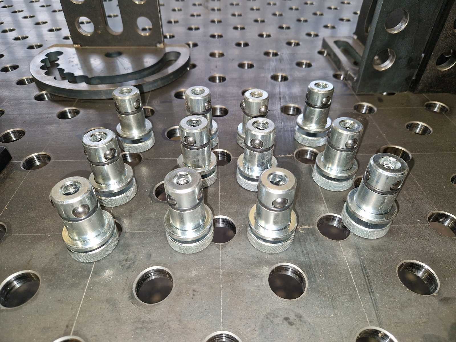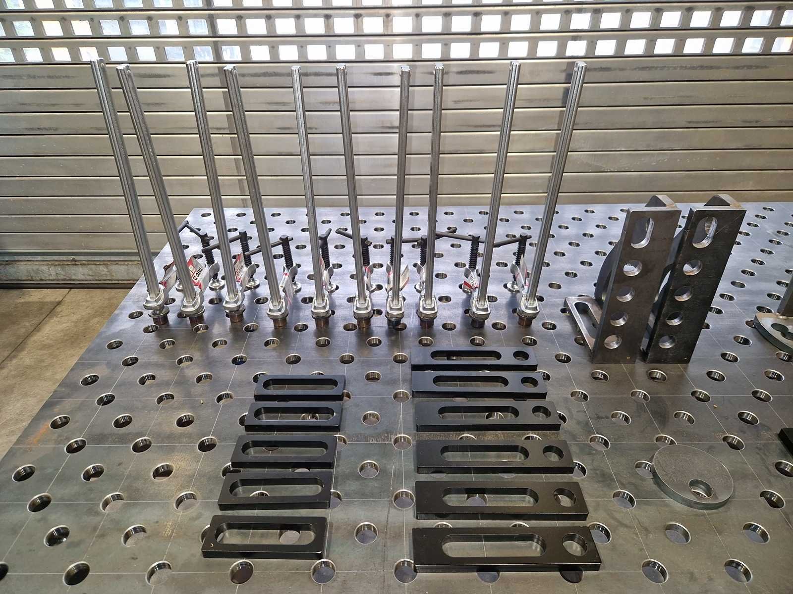 Welding table/clamping table, drilled holes and diagonal grid. Table-thickness: 15mm, hole-diameter: 28mm. Including a full set accessoires: - 4x 3D Angle - 6x Stop small - 6x Stop large - 1x Protractor - 2x Prism - 1x Eccentric - 1x Flat Angle - 12x Tension/clamping bolt - 12x Clamp No Merk: BODE Type: L2414 Bouwjaar: 2024 Gewicht: 800 Lengte: 240cm Breedte: 120cm