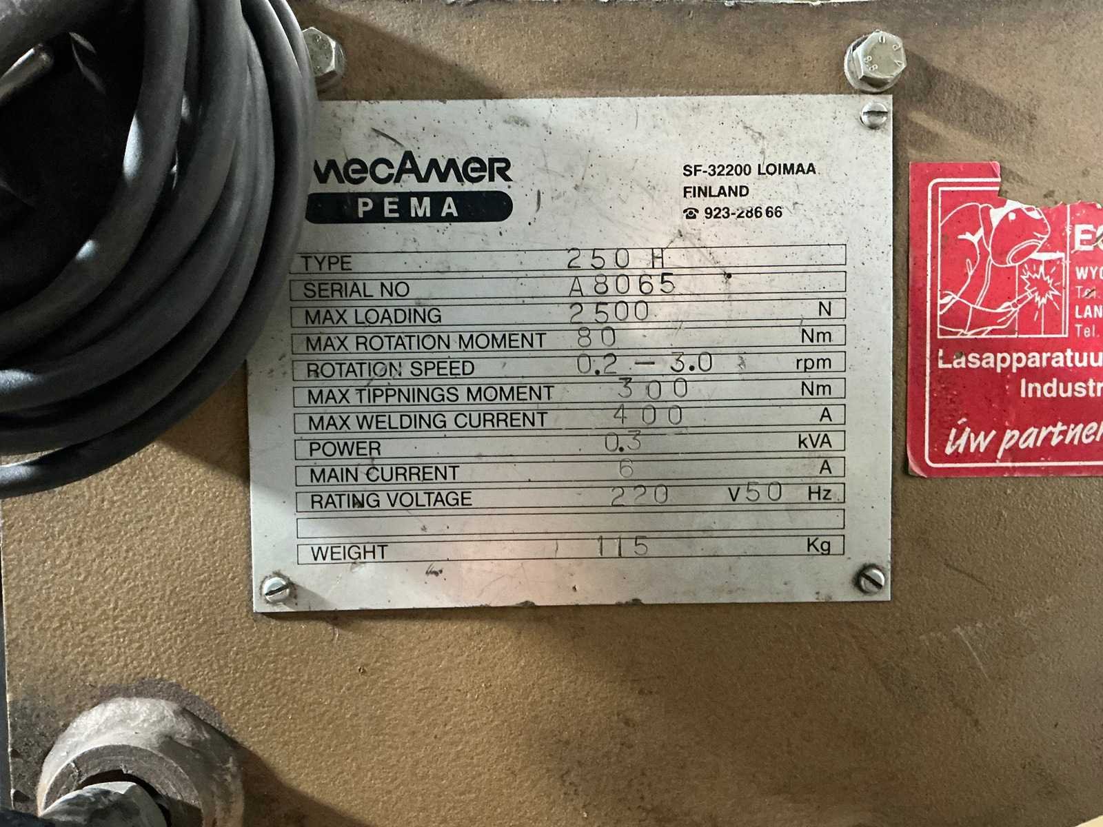 No Merk: Mecamer PEMA Type: 250H Serienummer: A8065 Draagcapaciteit: 250kg Kantelbaar: true Horizontaal: true Verticaal: true Draaisnelheid: 3rpm Voetbediening: true Aansluiting: 220V Machinegewicht: 150kg Afmeting l: 650mm Afmeting b: 770mm Afmeting h: 1260mm