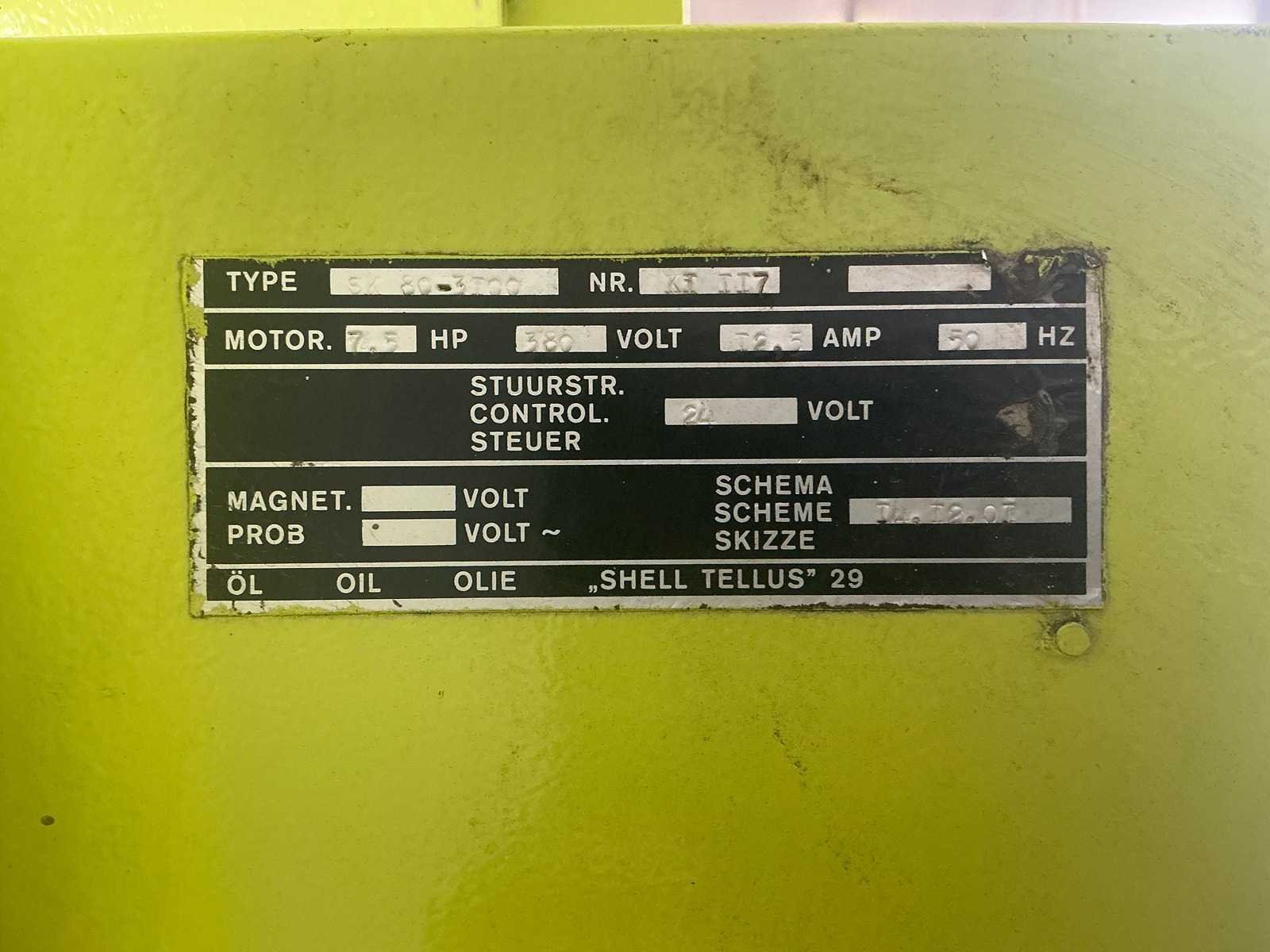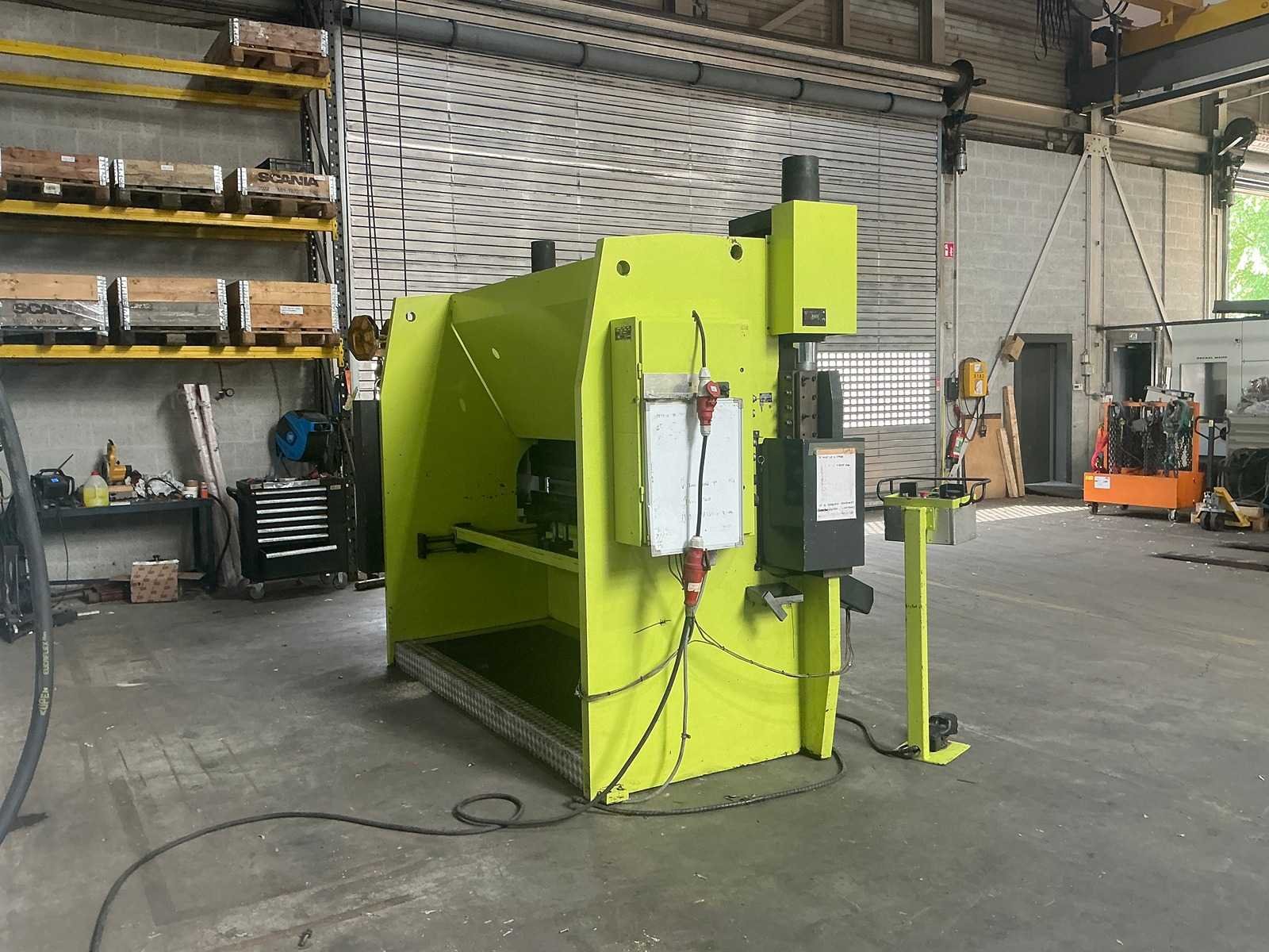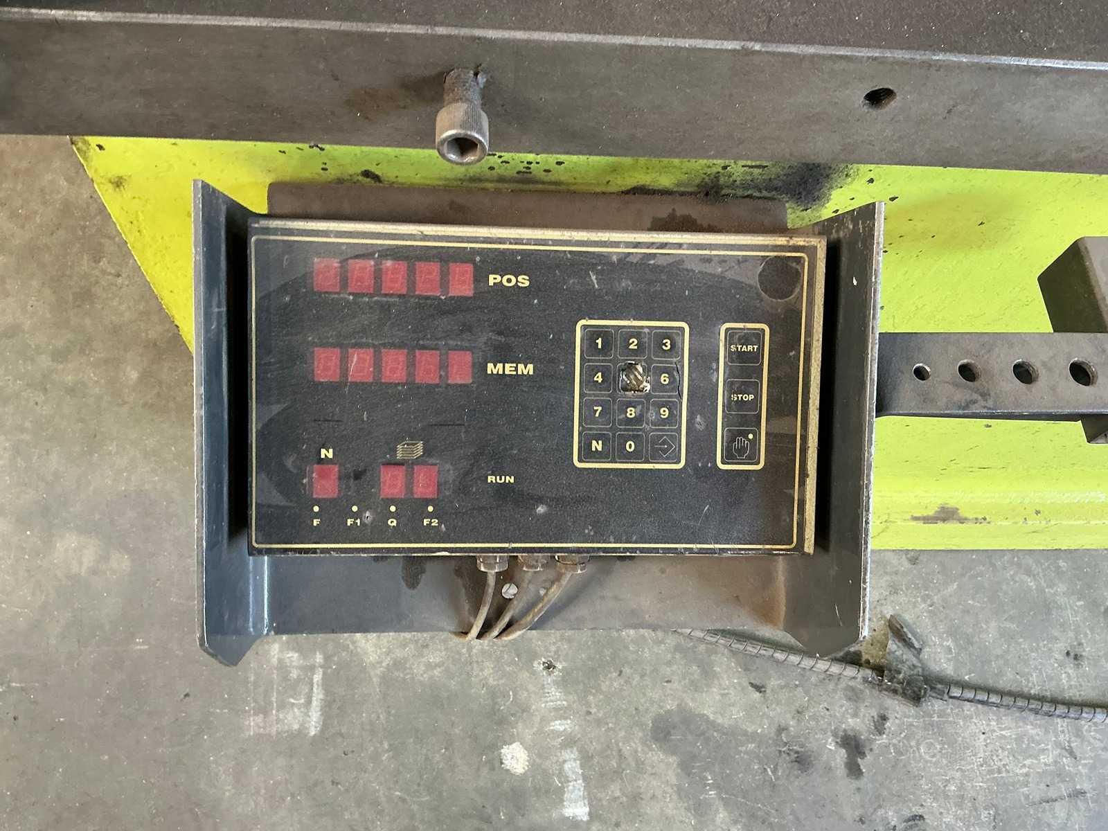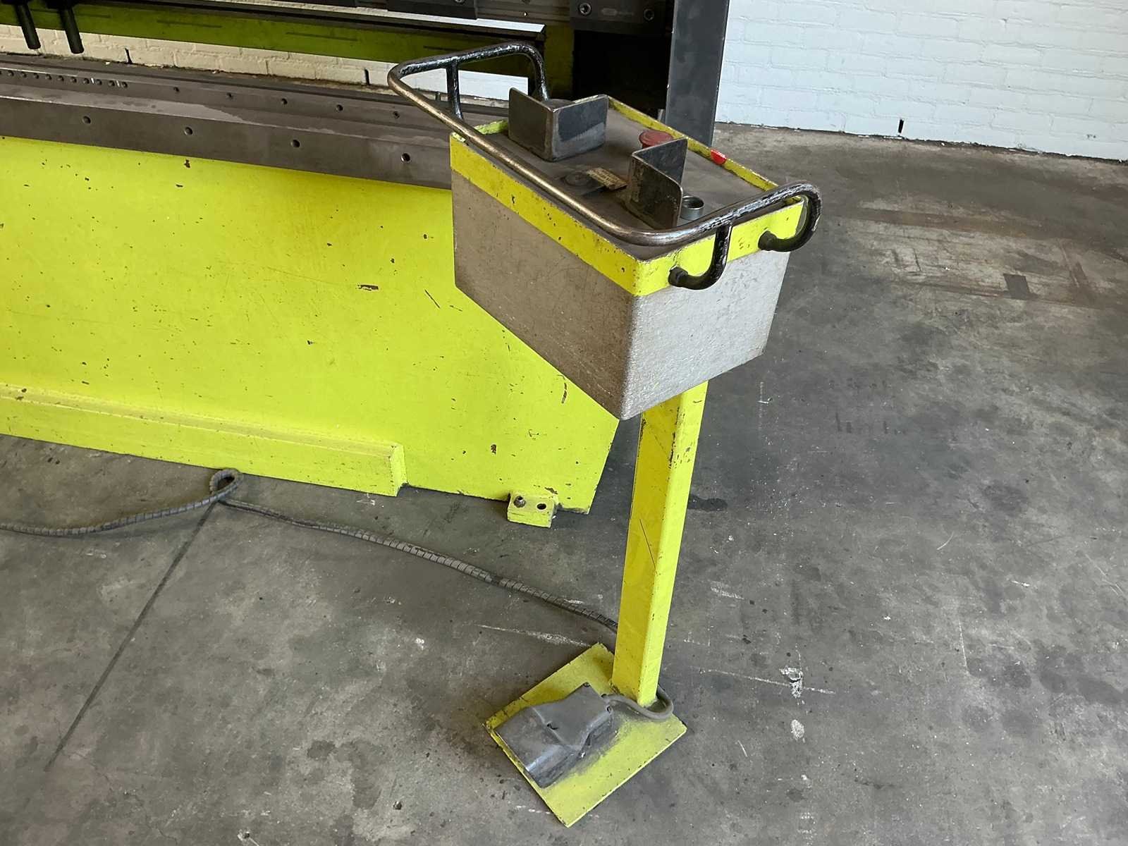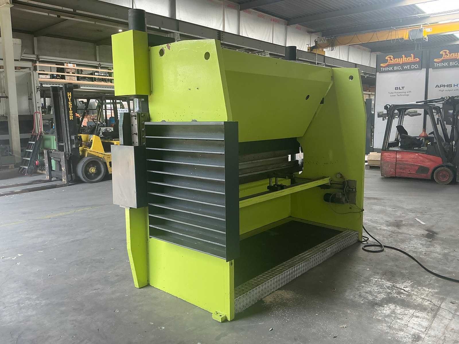 Conventionele kantbank met elektrisch instelbare achteraanslag met bedienunit. Machine is tevens instelbaar in hoogte; gaat constant automatisch omhoog. Hij is wel functioneel. Inclusief bovenmessen en ondermatrijs, zoals afgebeeld. No Merk: Safan Type: SK80-3100 Capaciteit.: 80t Werklengte: 3100mm Aantal assen: 3 Voetbediening: true Motorvermogen (kW): 5,5kW Aansluiting: 400V Machinegewicht: 6000kg Afmeting l: 3300mm Afmeting b: 1550mm Afmeting h: 2680mm